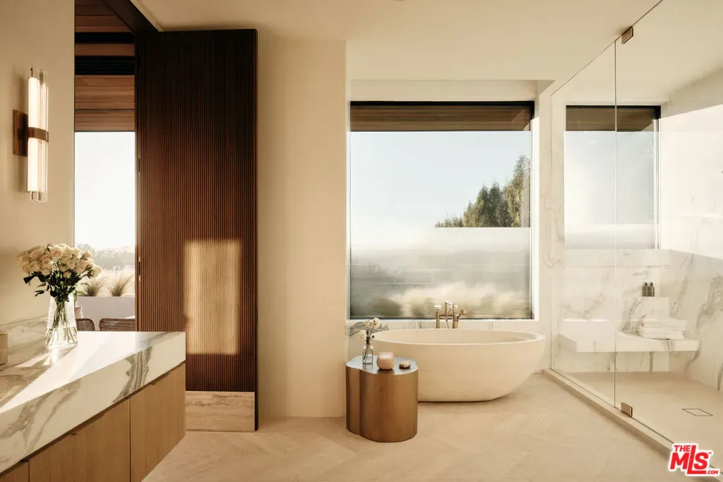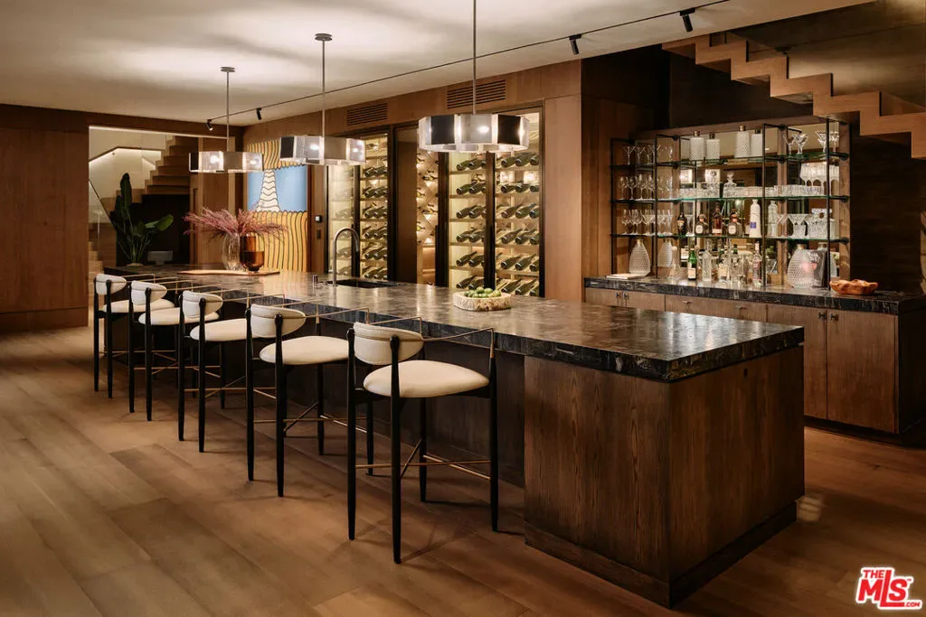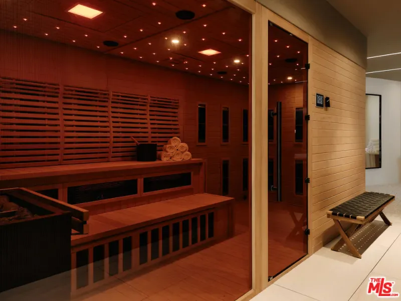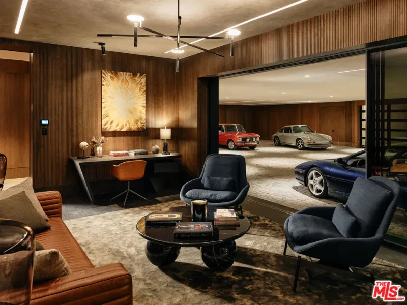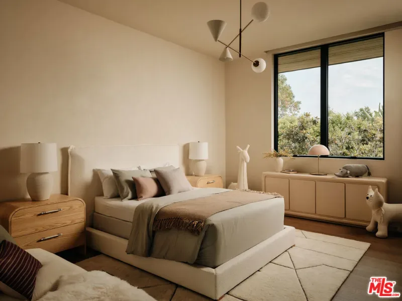 Serenity patiently awaits at Villa Serenique, a truly one-of-one estate designed with deep reverence for organic materials, refined amenities, and understated sophistication. Located at 401 N Tigertail Road, just minutes from Brentwood Village, the home offers seamless access to L.A.’s premier dining, shopping, and hiking trails. Crafted over four years and thoughtfully designed with Tiffany Harris Design, Villa Serenique spans approximately 20,000 square feet on over one acre, featuring nine bedrooms. The residence is wrapped inside and out in hand-chiseled Portuguese limestone, complemented by Roman plaster walls, travertine, and board-formed concrete creating a calm, timeless atmosphere rooted in nature. Beyond a gated entry, limestone steps lead to a grand double-height door opening into light-filled living and dining spaces divided by a limestone fireplace. Floor-to-ceiling glass frames hillside views and opens to expansive outdoor entertaining areas. The hosting level includes an open-air kitchen with gas and Argentinian-style grills, a pool and hot tub with sunken firepit seating, manicured lawns with citrus and olive trees, a private walnut-wrapped office, chef’s kitchen with brass hood, industrial prep kitchen, two guest suites, laundry room, garage, and secured delivery cabinet. Upstairs, canyon and city views accompany three ensuite bedrooms, a lounge, and the primary retreat featuring a private balcony, silver travertine accents, dual spa-like bathrooms with heated floors, and custom walk-in closets.The lower level offers a world-class wellness and entertainment wing: an indoor-outdoor gym, Pilates studio, lap pool, cold plunge, infrared sauna, steam spa, car gallery with drive-in movie capability, and parking for 10 plus cars, soundproof theater, bar, wine cellar, and additional ensuite bedrooms. Below the home lies a private outdoor retreat with soccer field, a pickleball court, gardens, and an Italian-style dining terrace. Quiet yet central, Villa Serenique is a sanctuary that grounds, restores, and inspires an everyday retreat for mind, body, and spirit.