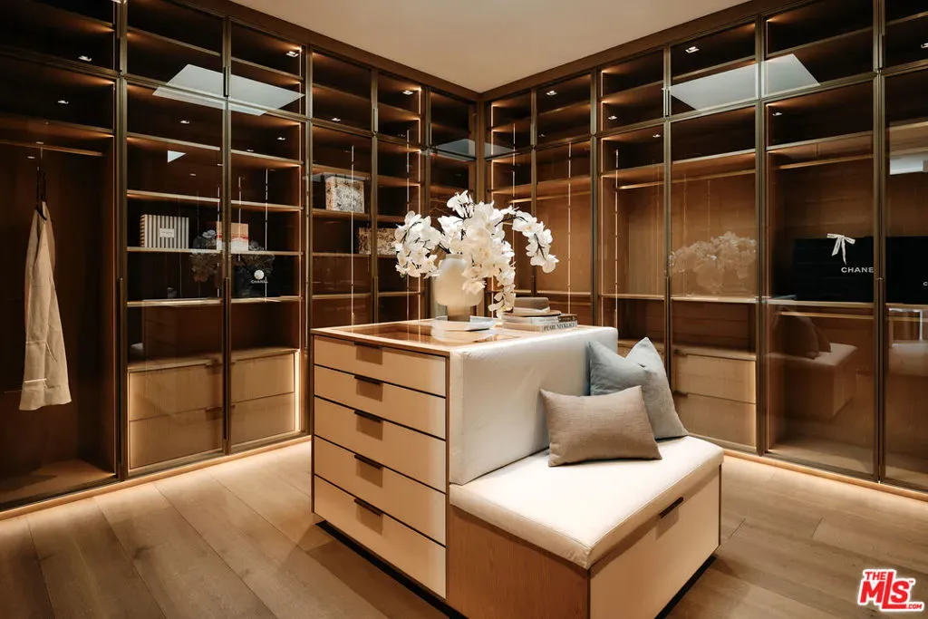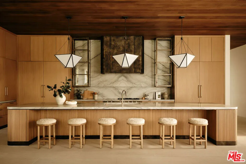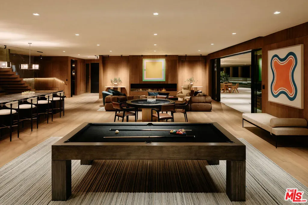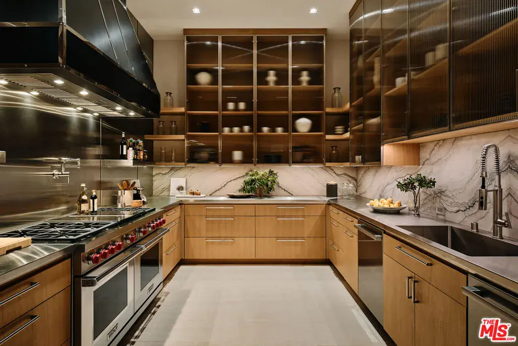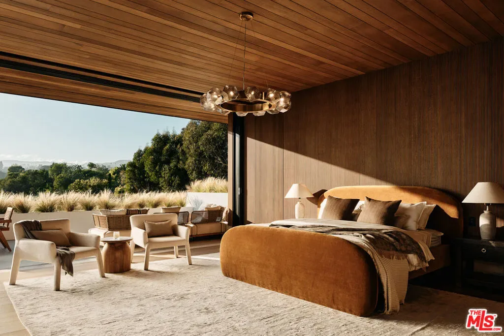 Serenity patiently awaits at Villa Serenique, a truly one-of-one estate designed with deep reverence for organic materials, refined amenities, and understated sophistication. Located at 401 N Tigertail Road, just minutes from Brentwood Village, the home offers seamless access to L.A.’s premier dining, shopping, and hiking trails. Crafted over four years and thoughtfully designed with Tiffany Harris Design, Villa Serenique spans approximately 20,000 square feet on over one acre, featuring nine bedrooms. The residence is wrapped inside and out in hand-chiseled Portuguese limestone, complemented by Roman plaster walls, travertine, and board-formed concrete creating a calm, timeless atmosphere rooted in nature. Beyond a gated entry, limestone steps lead to a grand double-height door opening into light-filled living and dining spaces divided by a limestone fireplace. Floor-to-ceiling glass frames hillside views and opens to expansive outdoor entertaining areas. The hosting level includes an open-air kitchen with gas and Argentinian-style grills, a pool and hot tub with sunken firepit seating, manicured lawns with citrus and olive trees, a private walnut-wrapped office, chef’s kitchen with brass hood, industrial prep kitchen, two guest suites, laundry room, garage, and secured delivery cabinet. Upstairs, canyon and city views accompany three ensuite bedrooms, a lounge, and the primary retreat featuring a private balcony, silver travertine accents, dual spa-like bathrooms with heated floors, and custom walk-in closets.The lower level offers a world-class wellness and entertainment wing: an indoor-outdoor gym, Pilates studio, lap pool, cold plunge, infrared sauna, steam spa, car gallery with drive-in movie capability, and parking for 10 plus cars, soundproof theater, bar, wine cellar, and additional ensuite bedrooms. Below the home lies a private outdoor retreat with soccer field, a pickleball court, gardens, and an Italian-style dining terrace. Quiet yet central, Villa Serenique is a sanctuary that grounds, restores, and inspires an everyday retreat for mind, body, and spirit.
