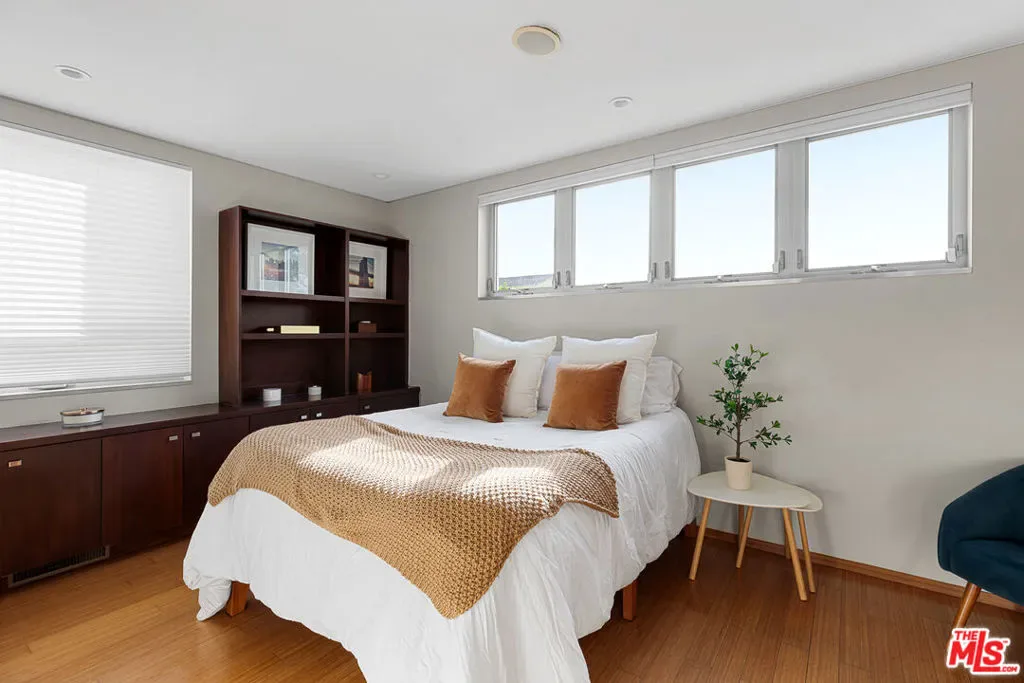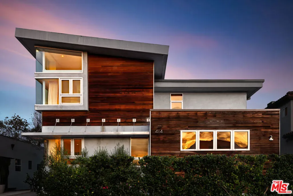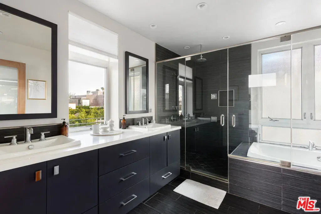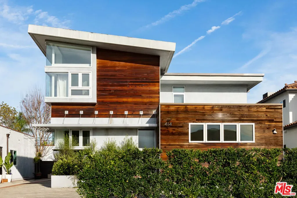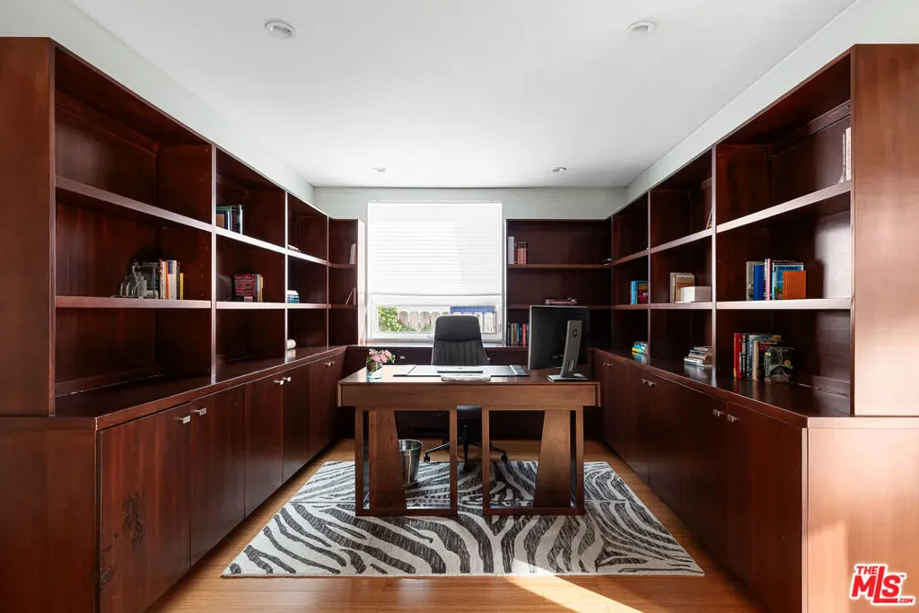 Readily changeable to five or six bedrooms with ADU potential for additional income! Floor-to-ceiling panes of glass, picture windows, rich wood panels, and smooth concrete converge to form the striking exterior of this recently remodeled and upgraded contemporary home, set back from the street with a brick-laid motor court and privacy hedges. The light-filled living room includes a ledgestone fireplace flanked by built-ins, walls of glass, and wood floors that flow throughout the entertaining spaces. In the sleek kosher kitchen, discover open shelving, wine storage and refrigerator, two dishwashers, double oven with warming drawer, ample cabinetry, pantry, granite countertops, and large center island with breakfast bar seating and cooktop with hood. The dining room faces sliding glass that opens to the rear deck for and indoor-outdoor dining experience. Ascend the stairs in the open foyer to a brilliant landing with massive window display showcasing treetops and blue skies. The primary suite is massive, complete with fireplace, built-ins, balcony access, and en-suite bath with separate tub and rainwater shower plus a dual-sink vanity. A custom walk-in closet includes ample storage and a large dresser island. Secondary bedrooms also feature built-ins plus an abundance of space, and the mahogany-clad office is perfect for study, work, and play. In the backyard, dine al-fresco, enjoy the brand-new organic pet-safe grassy turf yard, or utilize the three-car garage as a gym, dance studio, artist’s haven, yoga, meditation, and more. This excellent neighborhood is central to the iconic Melrose Arts District with its trendy fashion boutiques and The Grove, right by Erewhon and moments to the nightlife, entertainment, shopping, and fine dining of West Hollywood, Larchmont Village, Beverly Hills, and the Westside. Synagogues are also within close proximity.