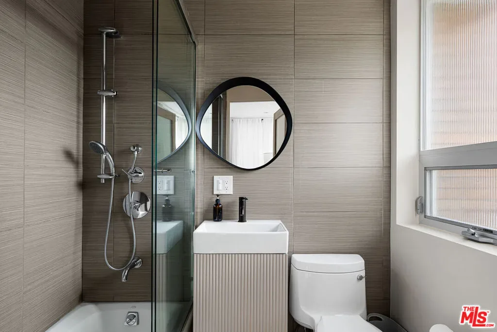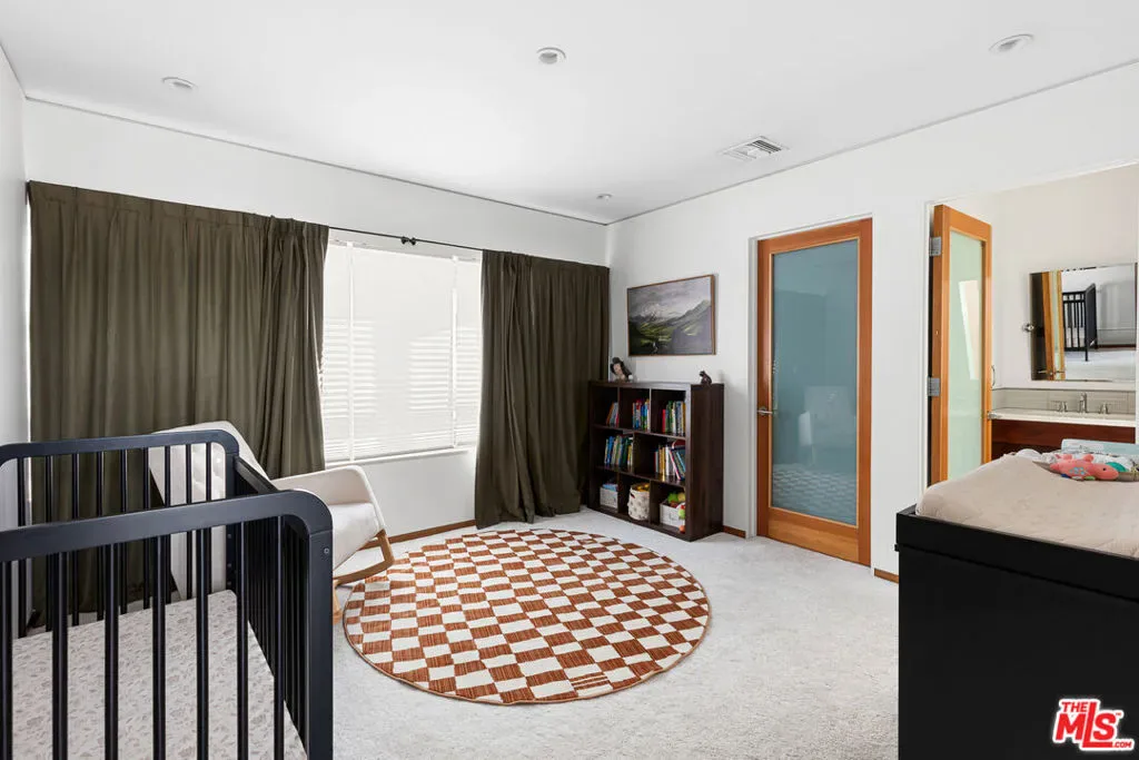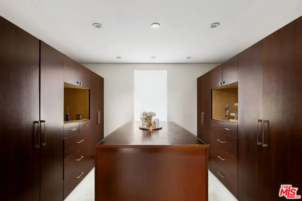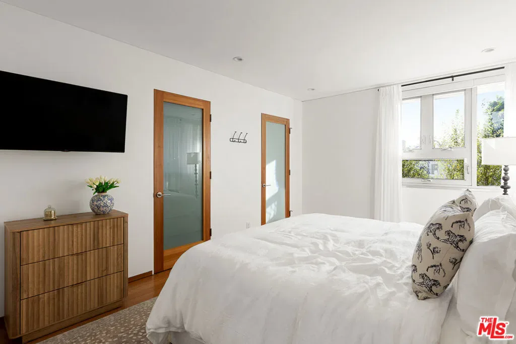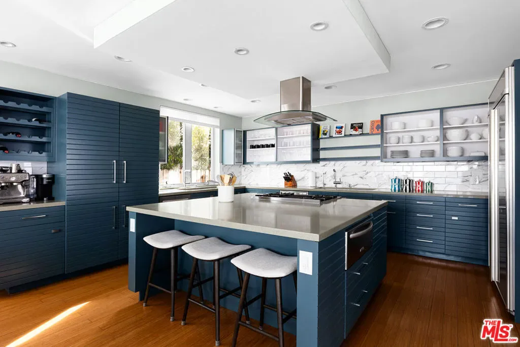 Readily changeable to five or six bedrooms with ADU potential for additional income! Floor-to-ceiling panes of glass, picture windows, rich wood panels, and smooth concrete converge to form the striking exterior of this recently remodeled and upgraded contemporary home, set back from the street with a brick-laid motor court and privacy hedges. The light-filled living room includes a ledgestone fireplace flanked by built-ins, walls of glass, and wood floors that flow throughout the entertaining spaces. In the sleek kosher kitchen, discover open shelving, wine storage and refrigerator, two dishwashers, double oven with warming drawer, ample cabinetry, pantry, granite countertops, and large center island with breakfast bar seating and cooktop with hood. The dining room faces sliding glass that opens to the rear deck for and indoor-outdoor dining experience. Ascend the stairs in the open foyer to a brilliant landing with massive window display showcasing treetops and blue skies. The primary suite is massive, complete with fireplace, built-ins, balcony access, and en-suite bath with separate tub and rainwater shower plus a dual-sink vanity. A custom walk-in closet includes ample storage and a large dresser island. Secondary bedrooms also feature built-ins plus an abundance of space, and the mahogany-clad office is perfect for study, work, and play. In the backyard, dine al-fresco, enjoy the brand-new organic pet-safe grassy turf yard, or utilize the three-car garage as a gym, dance studio, artist’s haven, yoga, meditation, and more. This excellent neighborhood is central to the iconic Melrose Arts District with its trendy fashion boutiques and The Grove, right by Erewhon and moments to the nightlife, entertainment, shopping, and fine dining of West Hollywood, Larchmont Village, Beverly Hills, and the Westside. Synagogues are also within close proximity.