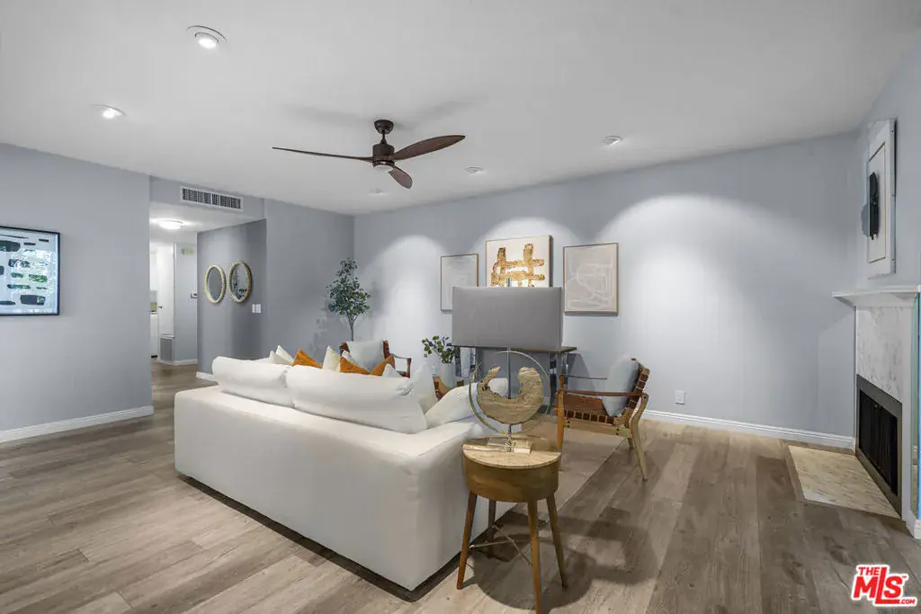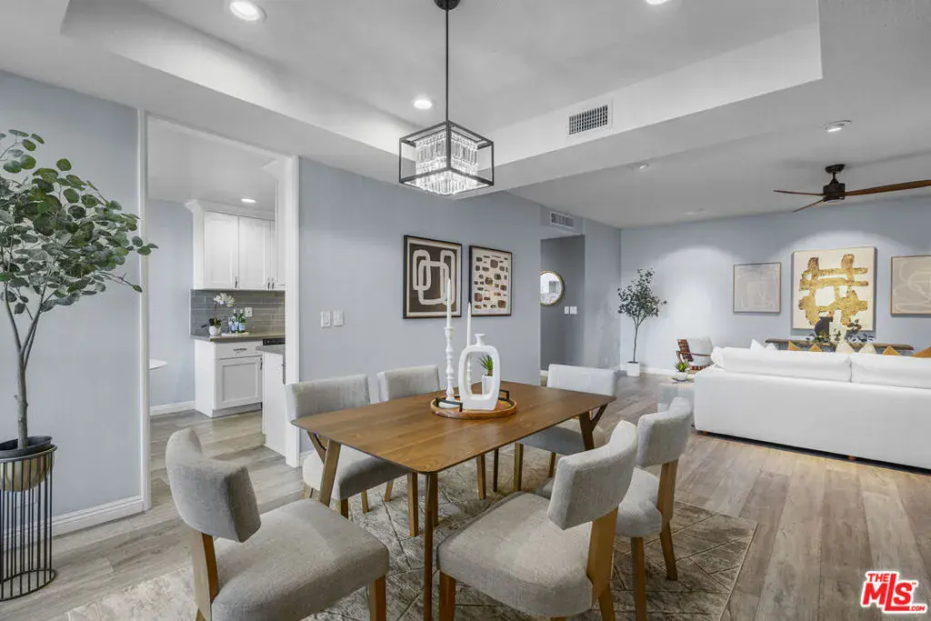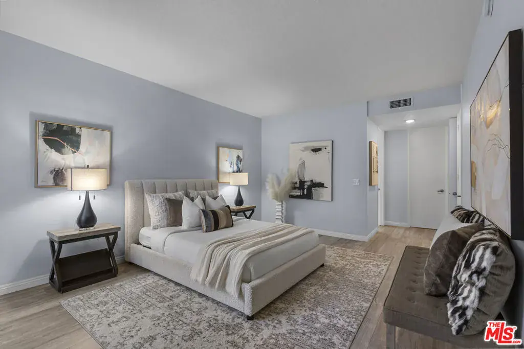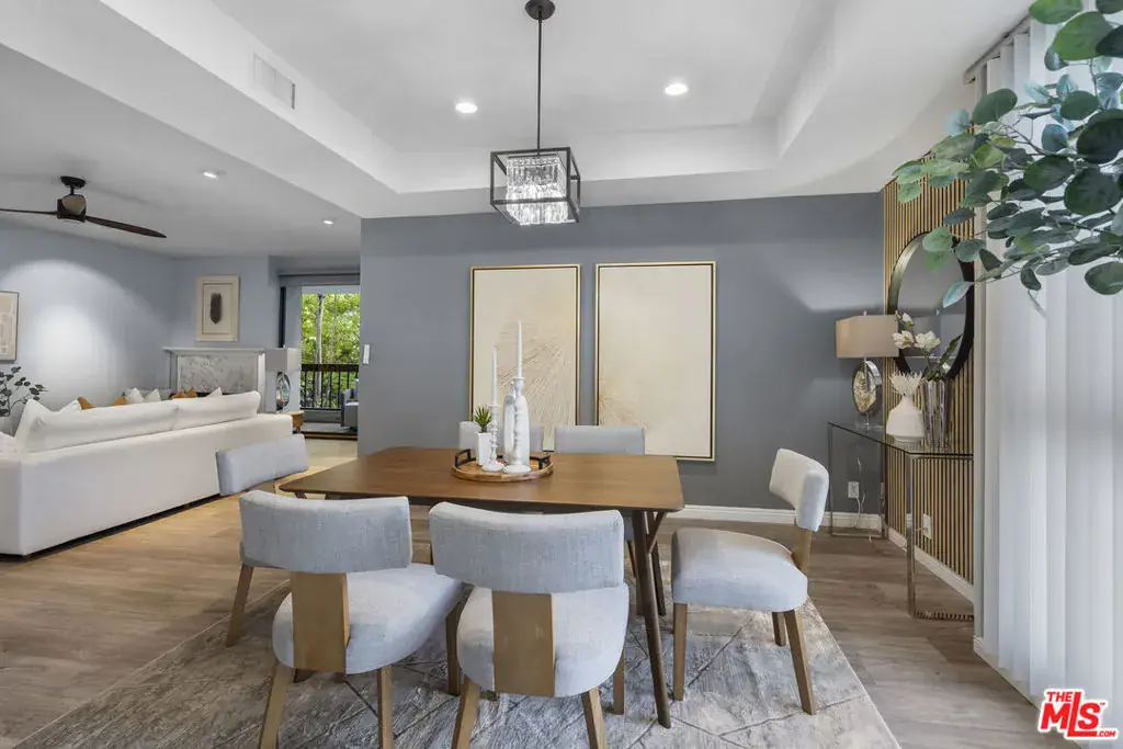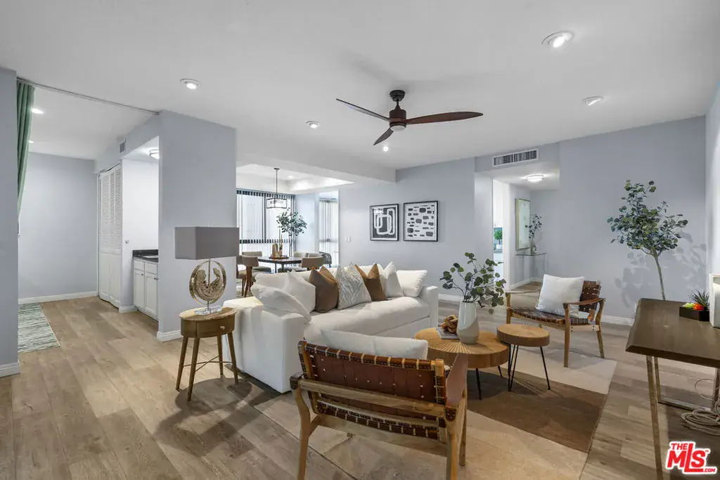 Peaceful northeast-facing corner unit perfectly situated away from Wilshire Blvd, offering a quiet retreat with bright east-facing rooms and serene treetop views from the living room. This beautifully remodeled home features hardwood flooring, recessed lighting, and spacious living space with pre-wired for a sound system. The living room opens to a large balcony overlooking Hancock Park’s lush greenery ideal for morning coffee or evening relaxation. The remodeled kitchen includes quartz countertops, stainless-steel appliances, and sleek cabinetry, with a cozy breakfast nook beside a large window providing great ventilation and natural light. In addition to the dining area, the layout offers excellent functionality. The primary and secondary bedrooms each have their own en-suite baths, while a separated den across the living room can serve as a third bedroom, home office, or multipurpose space. With only one shared wall, this corner residence ensures exceptional privacy and abundant sunlight throughout. Additional features include in-unit laundry, two side-by-side parking spaces, and a private storage unit. The community offers, pool, spa, sauna, and fitness center. Located within the coveted Third Street Elementary School District and close to Hancock Park’s finest shops and restaurants.