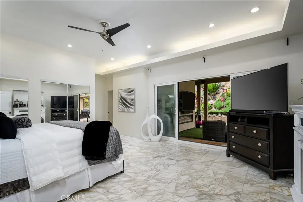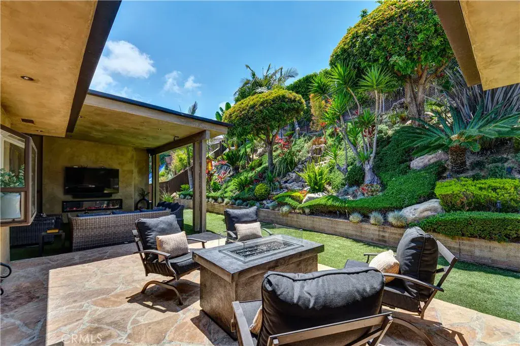 The beautifully landscaped backyard is a private retreat, featuring a serene hillside adorned with a cascading waterfall and a vibrant array of colorful plants and trees. An outdoor living area, complete with recessed lighting, a large built-in television and surround sound system, invites you to relax by the electric fireplace and enjoy out-door entertainment, stretching routines or peaceful meditation. A separate fire pit area with comfortable seating offers an idyllic spot for evening conversations under the stars. The fully finished garage offers space for athletic gear storage or even a compact home training station, perfect for workouts, yoga mats, or whatever fits your needs.