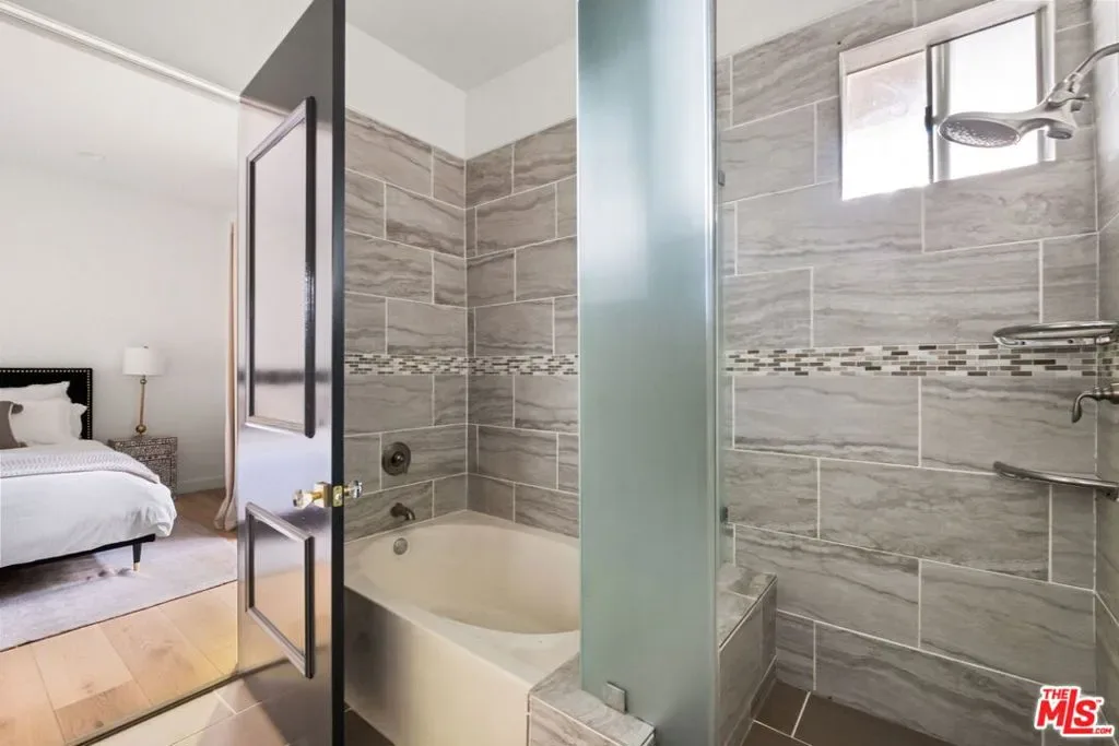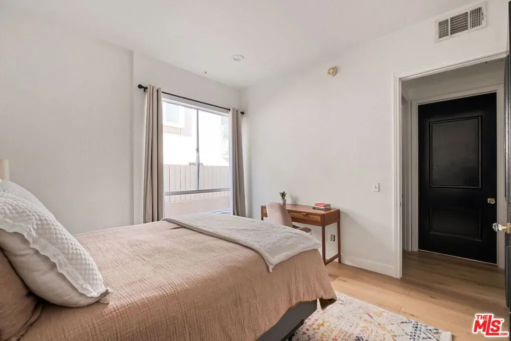 Welcome to this beautifully updated corner rear 2-bedroom, 2-bathroom condo just moments from Hancock Park and Larchmont Village, offering 1,180 SF of bright, open living. The thoughtfully designed layout connects the living, dining, and kitchen areas, creating a space that feels open and inviting. Large windows and sliding glass doors bring in natural light and open to a private patio, enhancing the indoor-outdoor flow. Elevated above street level, the unit offers added privacy while still maintaining convenient access. The kitchen is clean and modern, featuring quartz countertops, a herringbone backsplash, stainless steel appliances, and bar seating ideal for casual dining and entertaining, plus a built-in desk for a convenient work-from-home setup. Both bedrooms are generously sized with walk-in closets, and the primary suite offers direct patio access and an en-suite bathroom with dual vanities, a soaking tub, and a separate shower. Additional features include a dedicated laundry room with storage, new flooring throughout, recessed lighting, a decorative fireplace, and a new HVAC system. The secure building offers gated parking with two tandem spaces and guest parking. A well-designed, move-in-ready home in a central, highly desirable location.