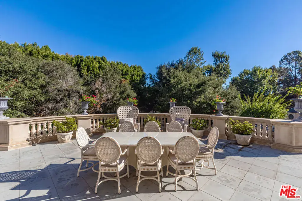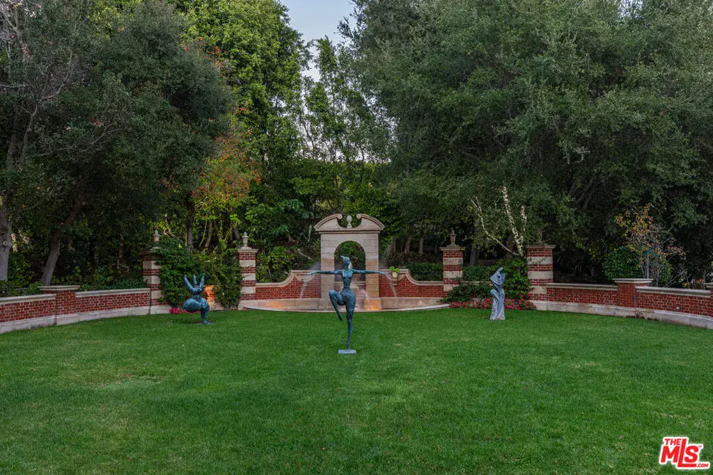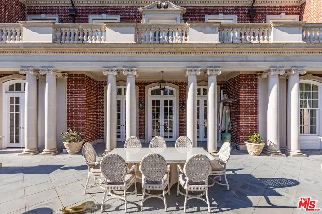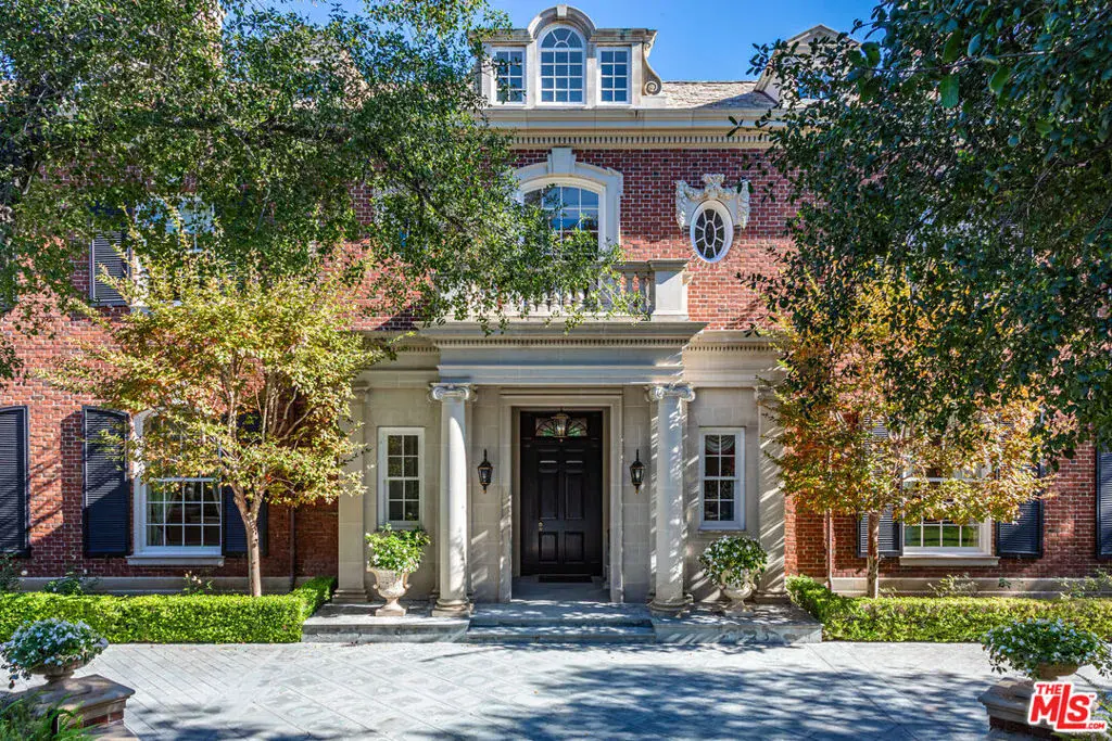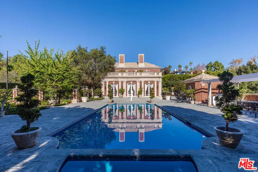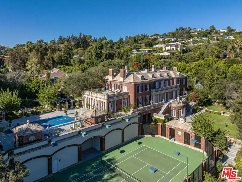 Tucked behind Bel-Air’s coveted East Gate, Rosewood is an extraordinary Georgian residence designed by acclaimed architect Richard Manion. Set on 1.51 acres of meticulously manicured grounds, the estate offers roughly 23,000 square feet of classic, refined living space. A gated circular drive leads to an impressive red-brick exterior, accented with limestone, traditional columns, custom moldings and elegant blue shutters. Stepping inside, guests are greeted by a dramatic foyer crowned with an oval skylight dome that casts natural light across the black-and-white marble floors and a sweeping spiral staircase. The formal living and dining rooms showcase soaring ceilings, detailed millwork, marble fireplaces, and expansive French doors that frame views of the surrounding gardens. A custom mahogany office with coffered ceilings provides an elegant private workspace. The gourmet chef’s kitchen is equipped with marble surfaces, bespoke cabinetry, high-end appliances, a striking central island, and a full butler’s pantry. It opens seamlessly to relaxed living and dining areas that spill onto a wraparound terrace perfect for hosting. Upstairs, the primary suite features a private sitting room, terrace access, fireplace, dual marble bathrooms, and generous walk-in closets. Four additional guest suites complete the level. The lower level is dedicated to entertainment and wellness, offering a guest suite, gym, massage room, wine cellar, secondary kitchen, and a remarkable oak-paneled ballroom with a stage and bar capable of accommodating up to 120 guests. The outdoor spaces evoke the feel of a private resort, complete with a North/South championship tennis court, pool and spa, fountains, gazebo, conservatory, treehouse, expansive lawns, and multiple al fresco entertaining areas equipped with a built-in bar and BBQ. Beneath it all, a showroom-style level provides parking for up to 12 cars, a nostalgic soda fountain diner, staff quarters, elevator access, enhanced security systems, and significant storage. Rosewood stands as a rare chance to live in a true landmark estate in one of LA’s most esteemed neighborhoods.