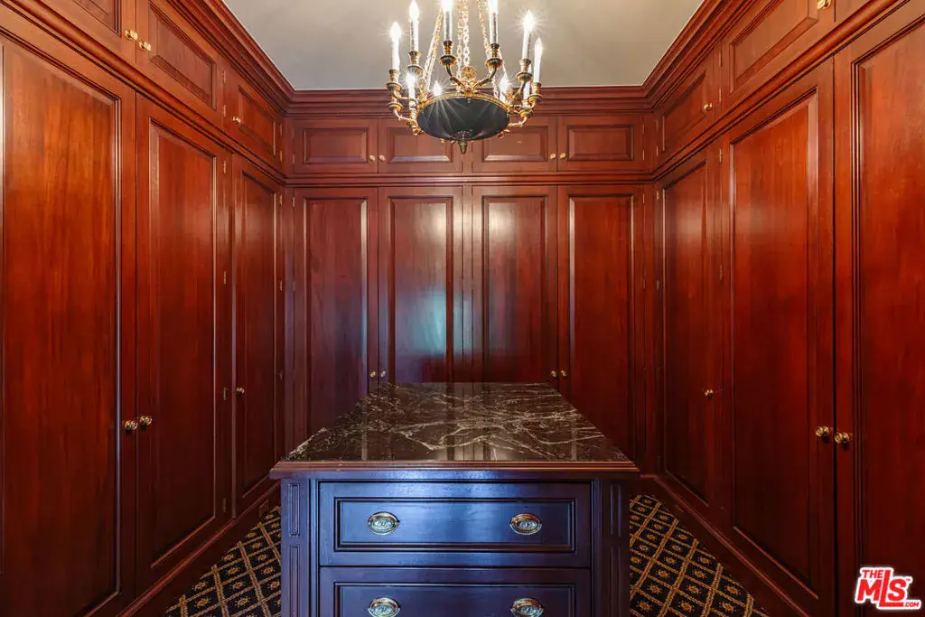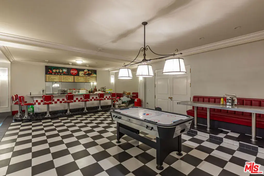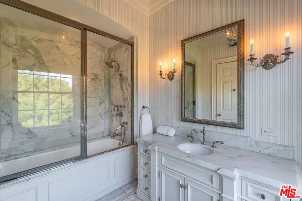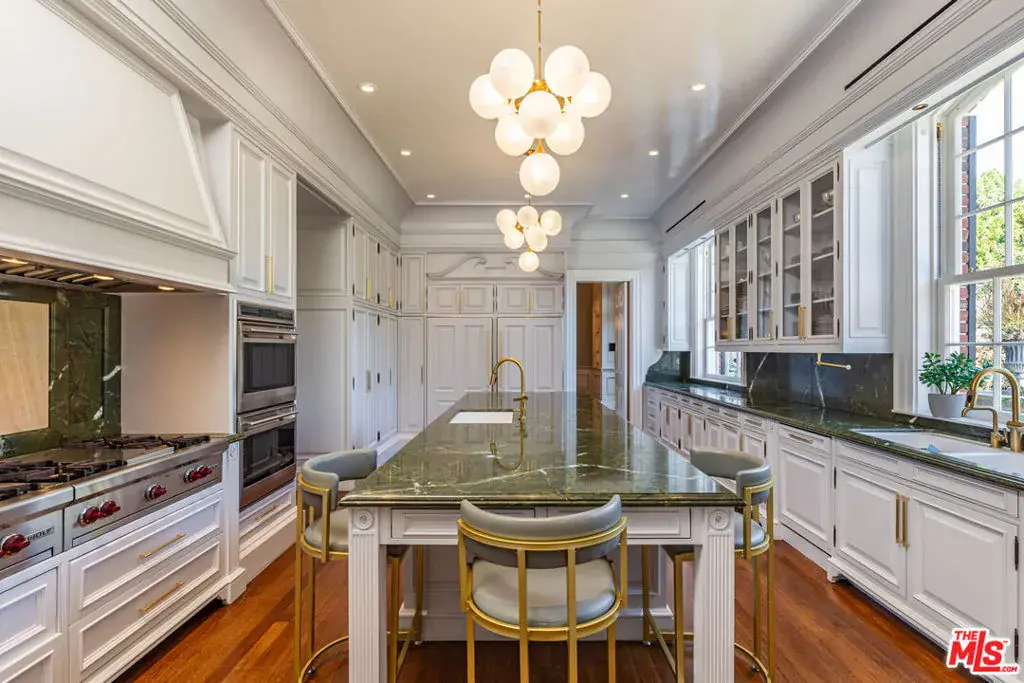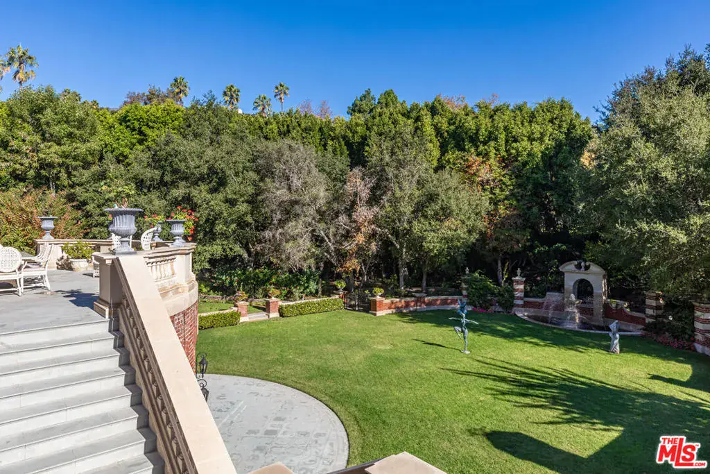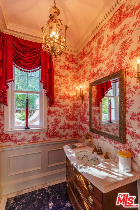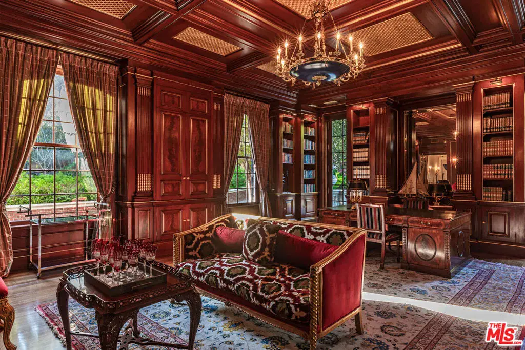 Tucked behind Bel-Air’s coveted East Gate, Rosewood is an extraordinary Georgian residence designed by acclaimed architect Richard Manion. Set on 1.51 acres of meticulously manicured grounds, the estate offers roughly 23,000 square feet of classic, refined living space. A gated circular drive leads to an impressive red-brick exterior, accented with limestone, traditional columns, custom moldings and elegant blue shutters. Stepping inside, guests are greeted by a dramatic foyer crowned with an oval skylight dome that casts natural light across the black-and-white marble floors and a sweeping spiral staircase. The formal living and dining rooms showcase soaring ceilings, detailed millwork, marble fireplaces, and expansive French doors that frame views of the surrounding gardens. A custom mahogany office with coffered ceilings provides an elegant private workspace. The gourmet chef’s kitchen is equipped with marble surfaces, bespoke cabinetry, high-end appliances, a striking central island, and a full butler’s pantry. It opens seamlessly to relaxed living and dining areas that spill onto a wraparound terrace perfect for hosting. Upstairs, the primary suite features a private sitting room, terrace access, fireplace, dual marble bathrooms, and generous walk-in closets. Four additional guest suites complete the level. The lower level is dedicated to entertainment and wellness, offering a guest suite, gym, massage room, wine cellar, secondary kitchen, and a remarkable oak-paneled ballroom with a stage and bar capable of accommodating up to 120 guests. The outdoor spaces evoke the feel of a private resort, complete with a North/South championship tennis court, pool and spa, fountains, gazebo, conservatory, treehouse, expansive lawns, and multiple al fresco entertaining areas equipped with a built-in bar and BBQ. Beneath it all, a showroom-style level provides parking for up to 12 cars, a nostalgic soda fountain diner, staff quarters, elevator access, enhanced security systems, and significant storage. Rosewood stands as a rare chance to live in a true landmark estate in one of LA’s most esteemed neighborhoods.