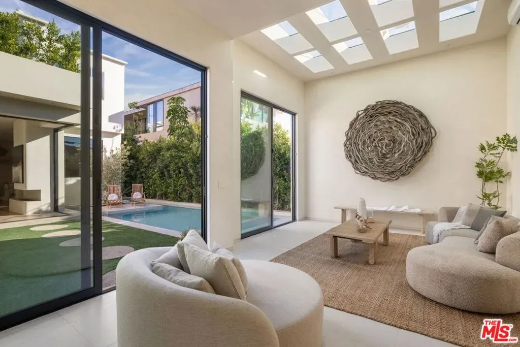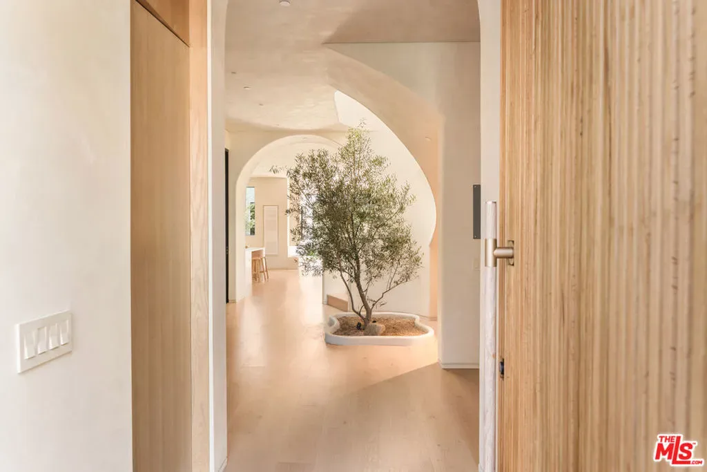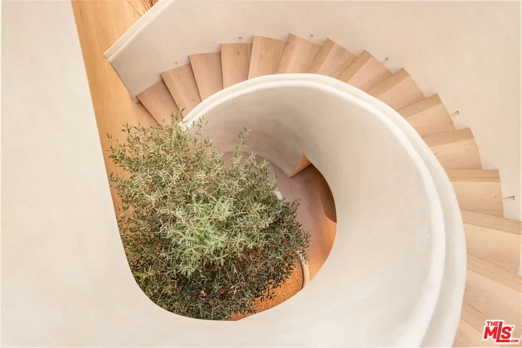 Located in one of LA’s most sought-after enclaves, this Mediterranean-inspired residence exemplifies modern craftsmanship and elevated living. Upon entry, asculptural spiral staircasegracefully wraps around a mature olive tree, rising beneath a dramatic skylight that fills the foyer with natural light and sets a striking architectural tone. Inside, travertine finishes, plastered walls and contemporary curves create a seamless flow of texture and form throughout. Expansive, wall-to-ceiling sliding glass doors dissolve the boundary between the living spaces and the manicured backyard, flooding the interiors with natural light and enhancing effortless indoor-outdoor living. The chef’s kitchen anchors the home with refined materials and meticulous detailing, ideal for both everyday living and hosting. Outside, the backyard unfolds as a private resort-style retreat, featuring a pool and spa, built-in BBQ and lush landscaping designed for year-round enjoyment, while a detached ADU provides flexibility for guests, work or extended living. Upstairs, the primary suite serves as a serene sanctuary with two expansive walk-in closets and a spa-like bathroom complete with a soaking tub. Two additional bedrooms occupy the second level, offering comfort, privacy and thoughtful separation. Complete with a two-car garage and exceptional attention to detail throughout, this smart home delivers a rare blend of architecture, function and lifestyle, quietly positioned near boutique shopping and acclaimed fine dining in one of Los Angeles’ most coveted neighborhoods.