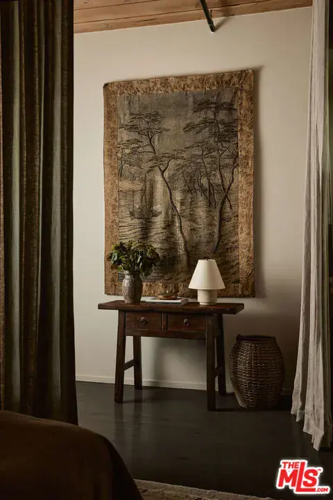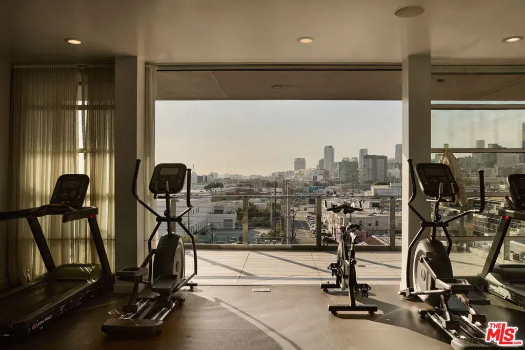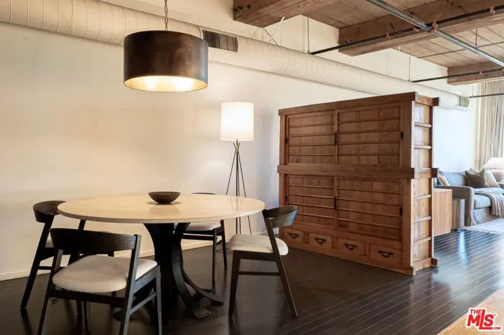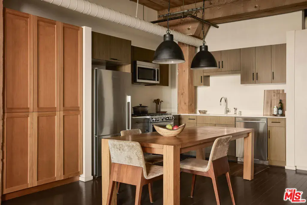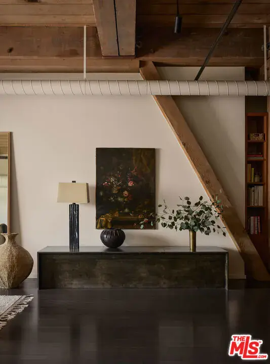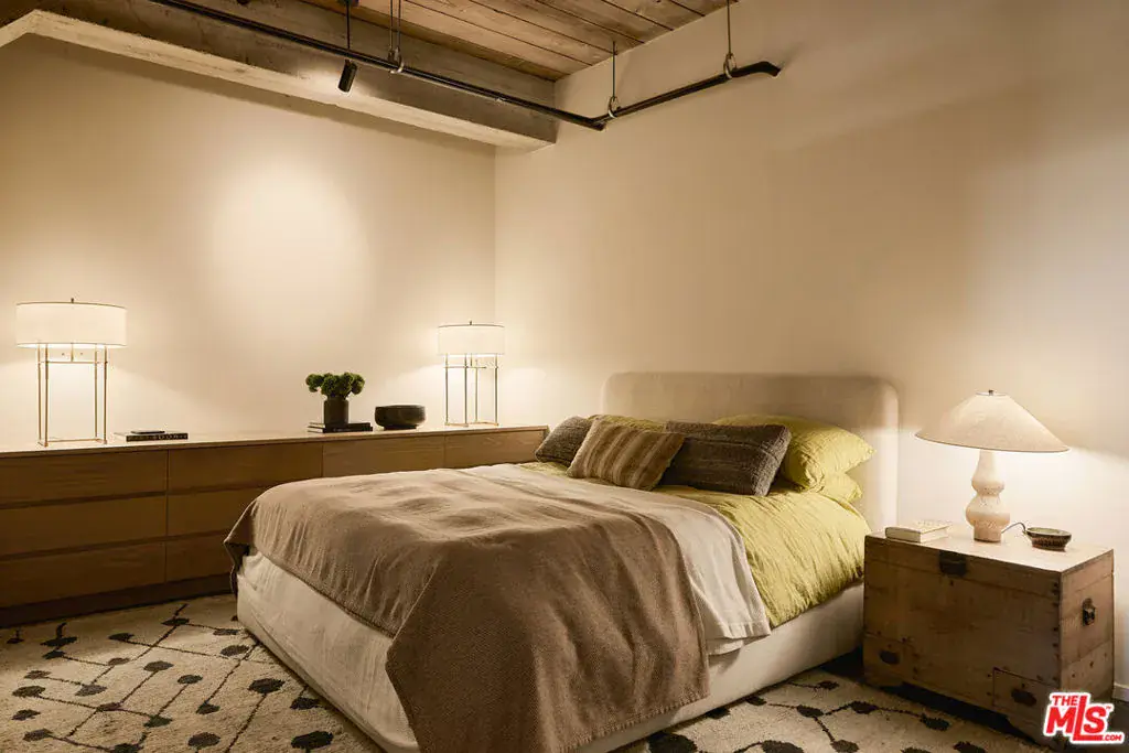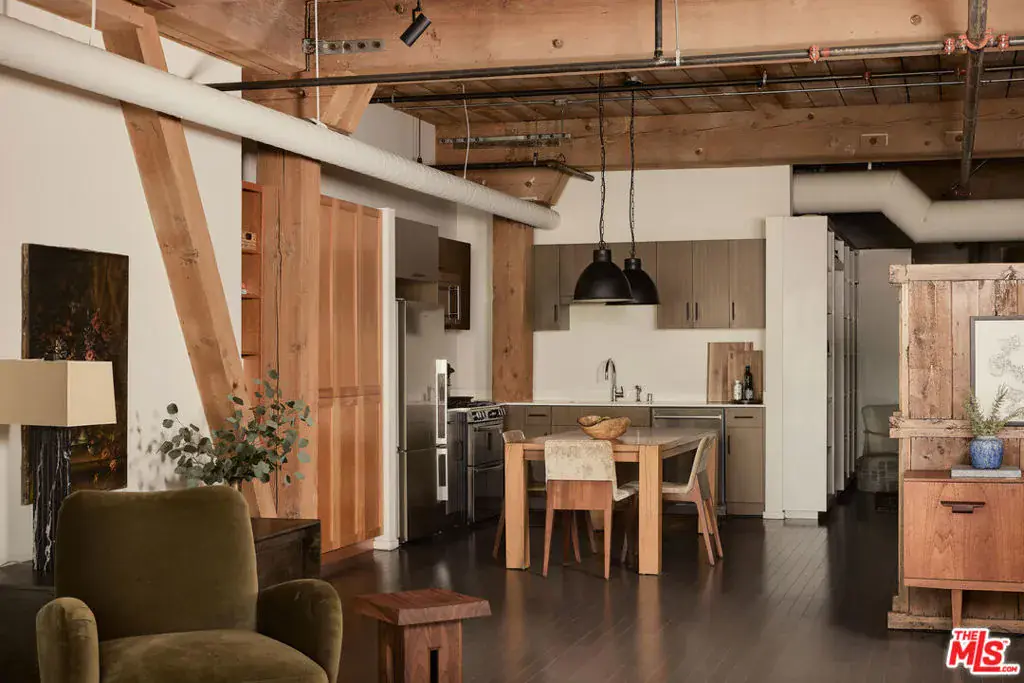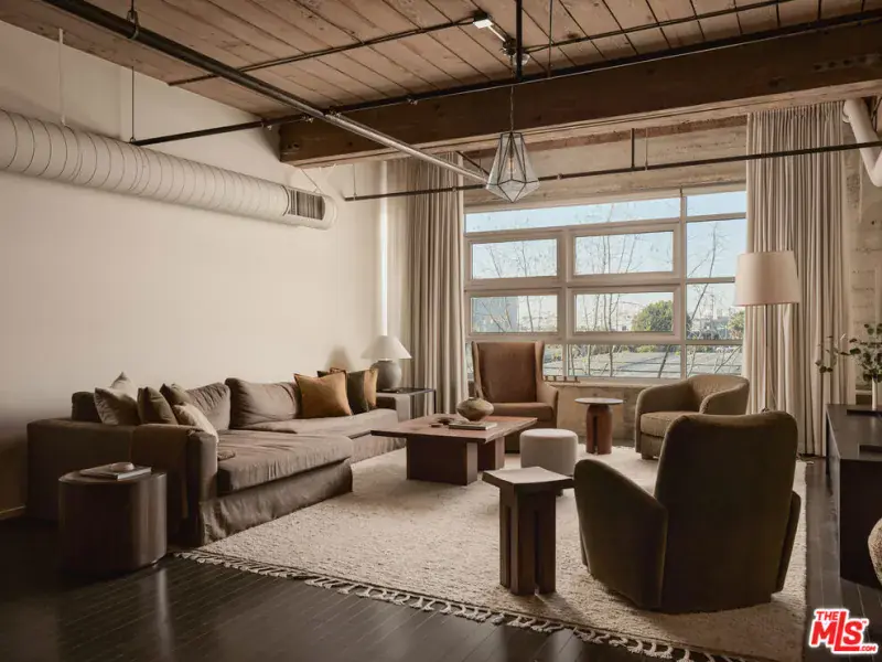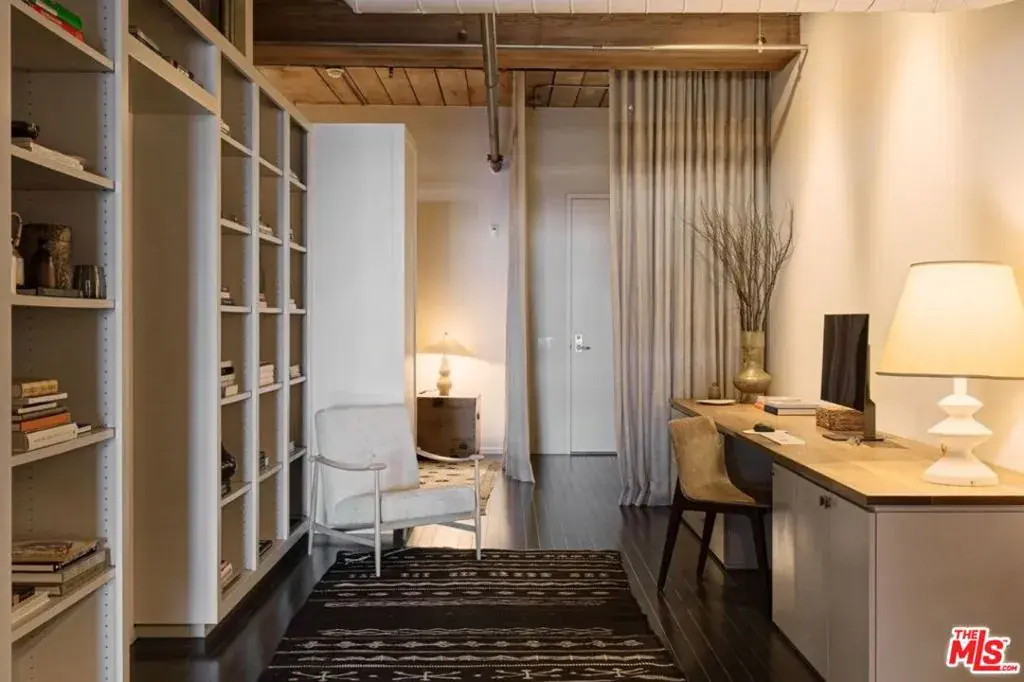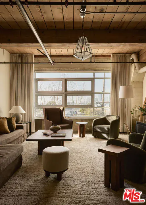 Exceptional Arts District loft in the historic Barker Block, exquisitely designed by noted interior design firm DISC Interiors. A dramatic wall of windows spans the far end of the residence, dressed in floor-to-ceiling drapery that adds warmth and texture, filling the space with an abundance of natural light and framing a coveted downtown skyline view. West-facing units with all wood ceilings and sunset exposures like this rarely come to market at Barker Block, making this residence an exceptional opportunity. This special home strikes a thoughtful balance of warmth and sophistication with hardwood floors throughout, nearly 11-foot ceilings with exposed beams, architectural lighting complemented by designer decorative fixtures, and custom built-in cabinetry providing ample storage at every turn for smart, elevated living. Warm white walls and painted-out ducting give the loft a more cohesive and softened feel. The heart of the loft is a chef’s kitchen outfitted with top-of-the-line, recently updated appliances seamlessly anchoring the open layout, ideal for both everyday life and entertaining. A spacious full bath includes in-unit laundry, while the generously sized bedroom features luxurious custom curtains that provide privacy and a thoughtful separation of space. The bedroom is complemented by a large wall of custom designed closets with antique brass hardware, and a built-in wall-to-wall oak dresser. A custom built-in 16′ desk with a full wall of bookshelves thoughtfully separates the entry and dining areas, adding both function and architectural interest.The Barker Block is a full-service building offering 24/7 front desk and security, complimentary common-area WiFi, an outdoor lounge with fire pits, and a resort-style rooftop with heated pool, spa, BBQ areas, and a fitness center showcasing some of the best panoramic views in downtown Los Angeles. Known for its striking architectural details and timeless industrial character, the live/work designated Barker Block also offers a dynamic and sophisticated creative community spirit.Located in the heart of the Arts District, moments from Bavel, Girl and the Goat, Verve Coffee, Blue Bottle Coffee, as well as walking distance to Still Life Ceramic Studios, Dover Street Market, Bestia, Soho Warehouse, and art galleries such as Hauser & Wirth, this exceptional loft delivers a rare blend of architectural pedigree, thoughtful design, and a vibrant, walkable urban lifestyle.