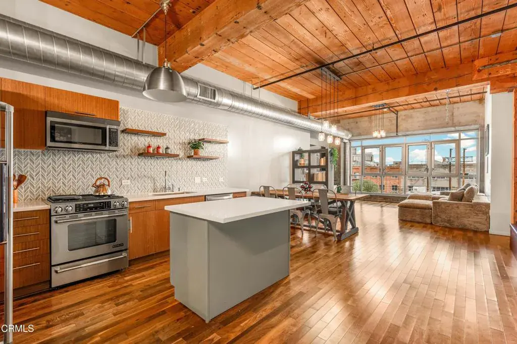 Serene Courtyard Loft with Industrial Character in the Heart of the Arts DistrictA dramatic wall of floor-to-ceiling windows frames tranquil courtyard views of blue sky and distant mountains, filling this stylish loft with natural light throughout the day. The wide, open floor plan and soaring ceilings create an airy sense of volume, while authentic 1920s wood beams and posts showcase the building’s rich industrial heritage. Designed for both comfort and versatility, the expansive layout easily accommodates distinct living, dining, sleeping, and workspace zones. Whether creating a dedicated home office, creative studio, or generous entertaining area, the open design allows for seamless flow while maintaining clearly defined spaces. The recently updated kitchen features a modern backsplash, open floating shelves, and a functional center island with additional cabinetry, blending style with everyday practicality. The bathroom has also been thoughtfully renovated with new flooring and tile, offering a fresh, contemporary feel. Residents enjoy one gated, attached covered parking space and 24/7 on-site security. A recently renovated resort-style rooftop provides a heated pool and spa, cabanas, BBQ areas, fire pits, and a fully equipped fitness center–an ideal extension of sophisticated urban living. Perfectly located across from Arts District Park and just moments from acclaimed restaurants, coffee houses, museums, and galleries, this home also offers convenient access to Metro and train stations as well as major freeways. Experience vibrant, design-forward living in one of Downtown LA’s most sought-after neighborhoods.