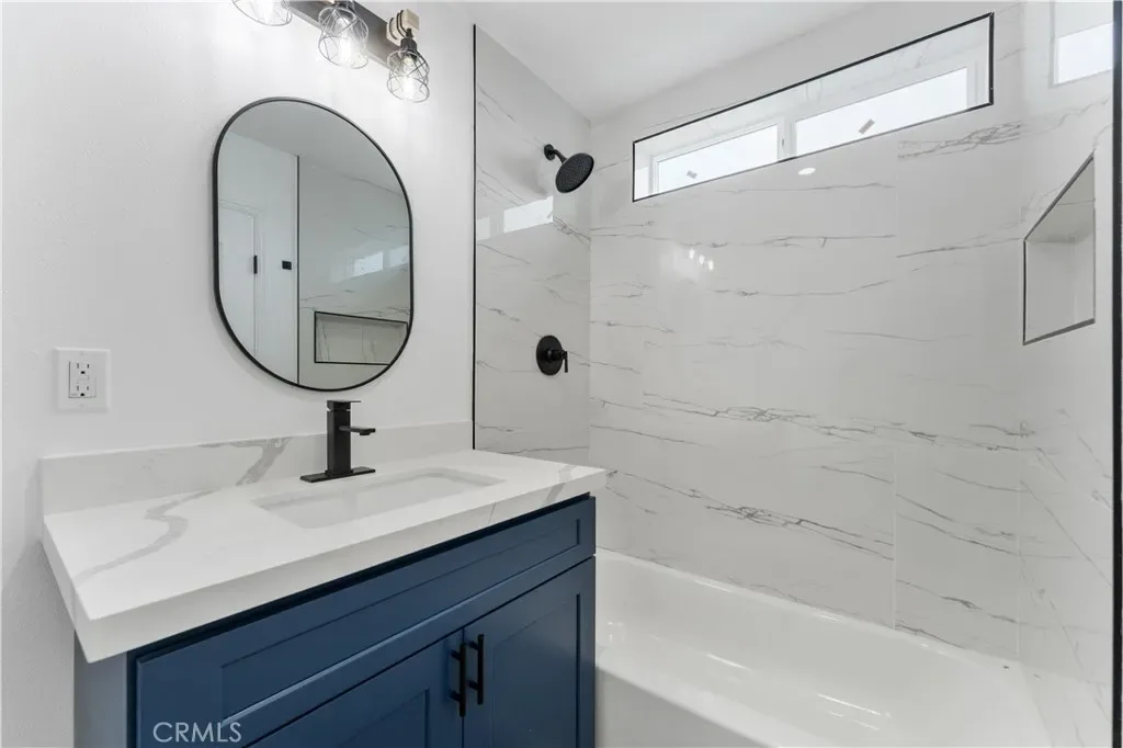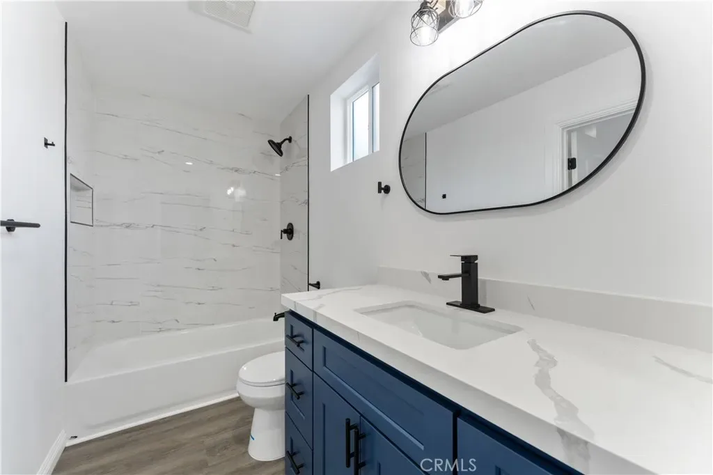 Brand-new and built with modern living in mind, this 1,193 sq ft residence showcases contemporary design, efficiency, and sophistication. Enjoy the state-of-the-art kitchen with bold navy cabinetry, quartz countertops and backsplash, stainless-steel appliances, and recessed lighting throughout. The bathrooms are equally stunning—spa-inspired with quartz counters, matte-black fixtures, and marble-style tile surrounds. With paid-off solar, washer/dryer hookups, and abundant natural light, this home delivers both luxury and sustainability.