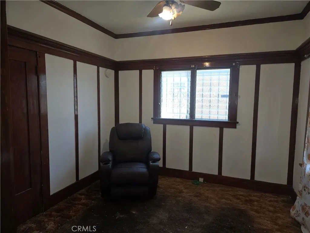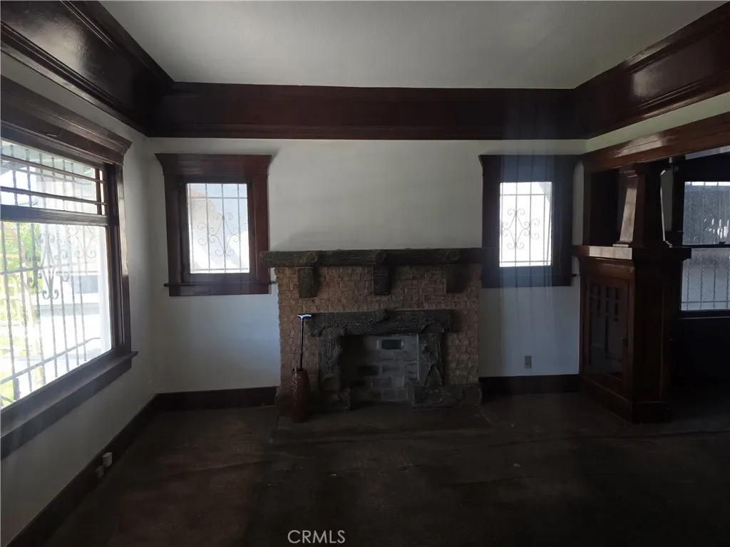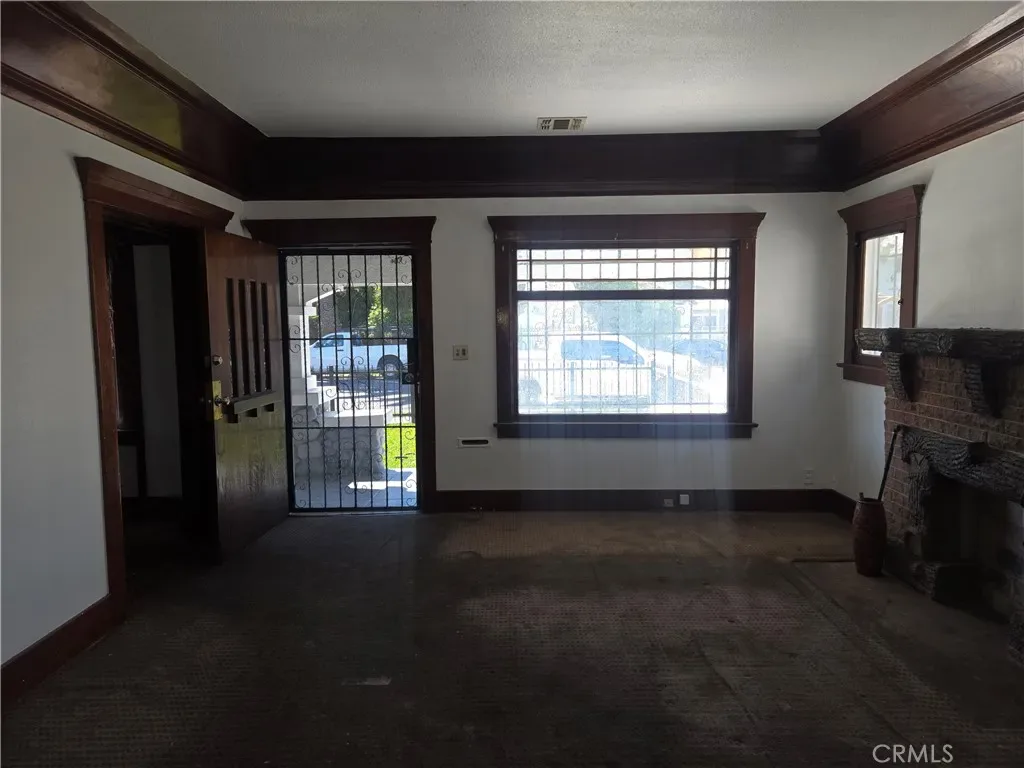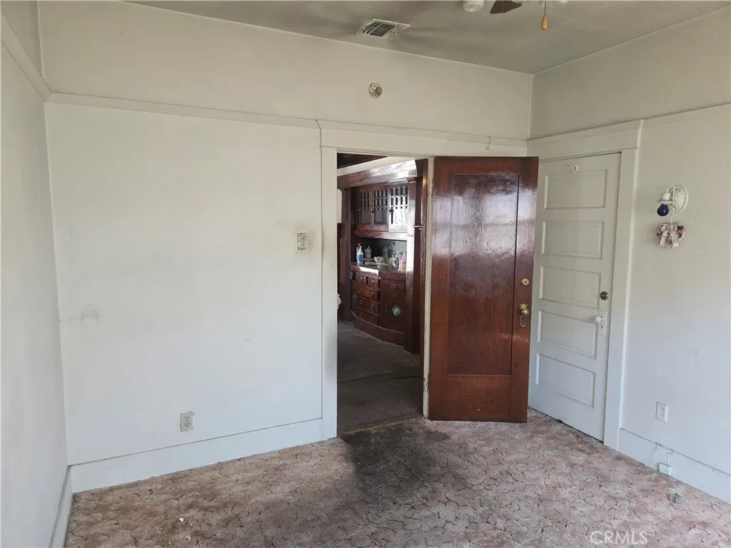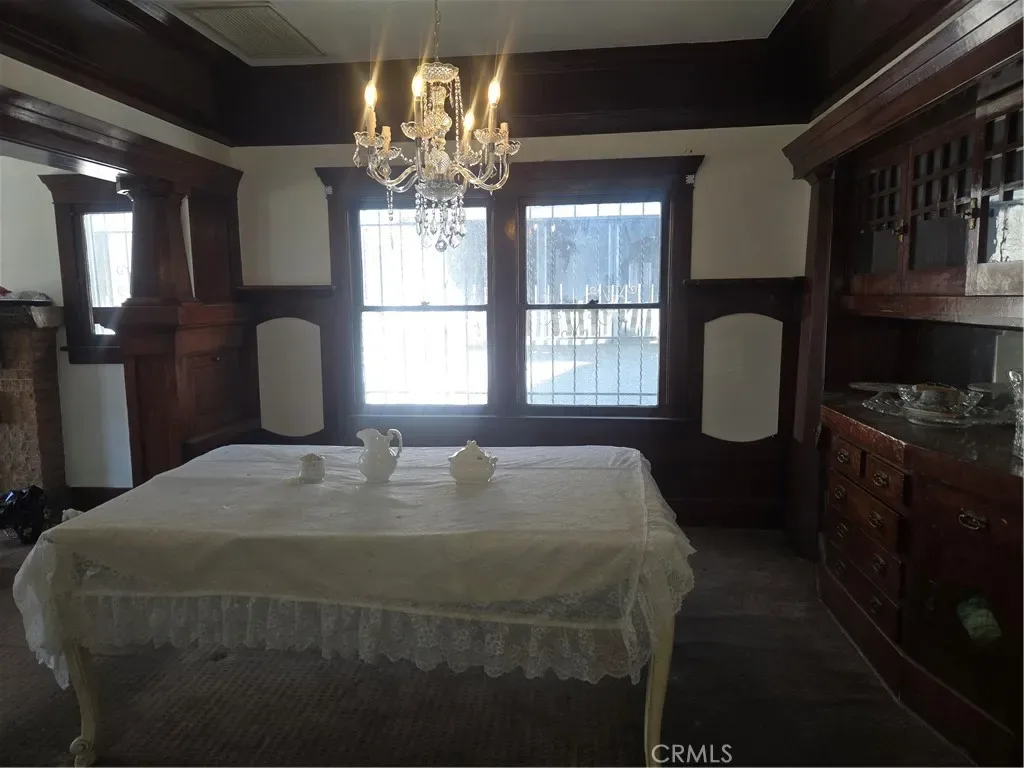 The front residence includes two bedrooms plus a convertible den that may function as a third bedroom. Architectural details include natural wood beam ceilings, rich wood trim, original wood flooring throughout, and a formal dining room with a built-in china cabinet. The living room features a decorative faux fireplace, and the home retains its original bathroom for classic character. The dining room, living room, and two bedrooms have been recently painted, enhancing the home’s appeal while maintaining its vintage charm.