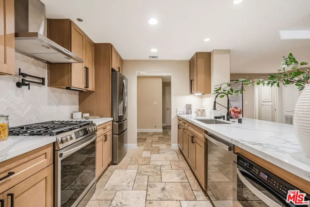 Located in one of Brentwood’s most prestigious full-service buildings, this beautifully updated residence offers generous scale with thoughtful, modern upgrades throughout. This 2-bedroom, 2.5-bathroom home spans 1,730 SF of intentionally designed living space. Double doors open to an entry that leads into an expansive living space, where hardwood floors and recessed lighting create a warm yet elevated atmosphere. The open layout has been thoughtfully enhanced by the removal of a dividing wall, allowing for a seamless connection between the kitchen, dining, and living areas, all flowing effortlessly to a private patio. Completed in 2025, the redesigned kitchen is both functional and striking, featuring custom cabinetry, new countertops and backsplash, all-new stainless steel appliances, a pot filler, and a built-in cup washer. It connects naturally to a dedicated dining area with a built-in bar and wine cooler, ideal for both everyday living and entertaining. Designed for privacy and comfort, the two-bedroom suites are positioned on opposite ends of the residence. The spacious primary suite offers dual walk-in closets with custom cabinetry and direct access to a second private patio. Both bathrooms have been updated with new vanities, while the primary bath also includes a soaking tub and separate shower. Additional highlights include a new HVAC system installed in 2022, in-unit laundry, video intercom, two assigned parking spaces, and extra storage. Residents enjoy a full suite of amenities at the Excelsior, including a pool, spa, sauna, gym, recreation room, and abundant guest parking, all just moments from Brentwood’s best dining, shopping, and everyday conveniences.