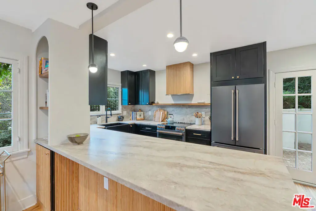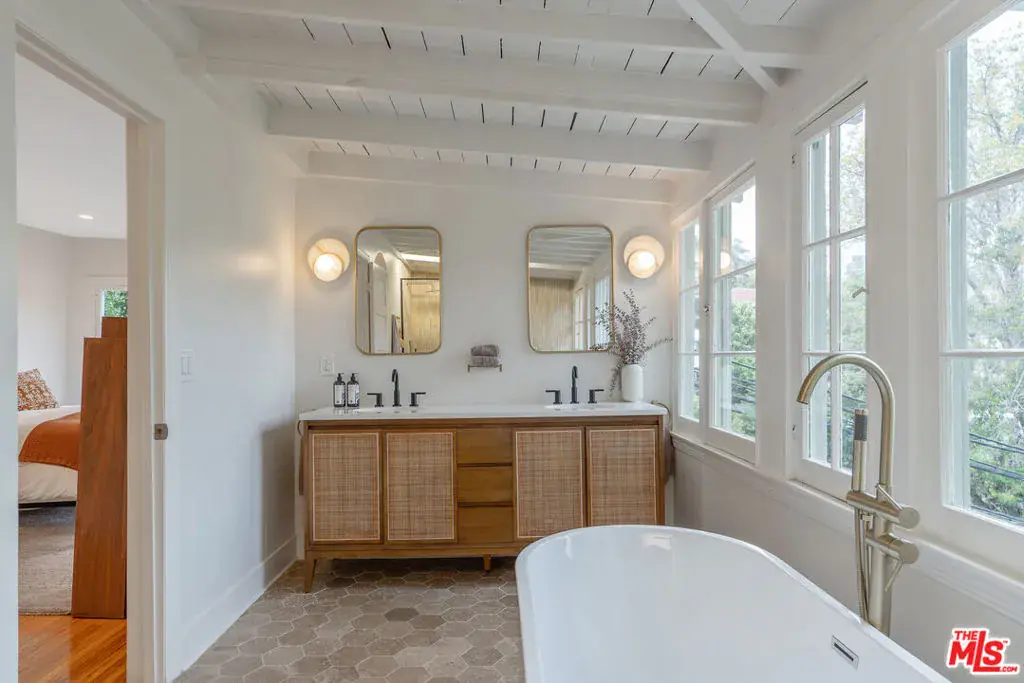 Set in the hillside of Beachwood Canyon, this thoughtfully restored Spanish Colonial Revival residence captures the appeal of its 1924 origins while embracing modern functionality. The home’s original bones immediately stand out, from beautiful old windows and Batchelder-style tiled fireplaces to graceful archways and built-in details that reflect the craftsmanship of another era. Positioned high enough to enjoy sweeping views yet still connected to the neighborhood and city below, the home offers a rare sense of calm. Sunrise views from the bedrooms unfold across the canyon, creating a peaceful morning ritual. The thoughtful layout creates a seamless flow to the interior while emphasizing light, space, and views throughout. The interior features a bright, open layout with refinished white oak flooring, restored original windows and doors, and fresh interior and exterior paint. Recessed lighting enhances the main living areas and primary suite, while curated fixtures and architectural details add warmth. The kitchen blends performance and design with Taj Mahal leathered quartzite countertops, new soft-close cabinetry, and gorgeous Energy Star appliances, including a GE Cafe range, refrigerator, dishwasher drawers, and an LG washer and dryer. A vintage Murano chandelier adds a distinctive entry moment. Major systems have been updated, including a new roof with a 20 year warranty, a two-zone energy-efficient HVAC system with smart thermostats, an energy-efficient electric water heater, updated plumbing and electrical, a new electrical panel, foundation bolting and structural reinforcement, and a newly lined sewer main with a 25 year guarantee. Outdoor living extends the home’s design with French drains, drought-tolerant landscaping with drip irrigation, exterior utility hookups for a future patio kitchen, a custom front entry gate, and a custom mahogany garage door. The terraced garden and patio create a private backyard oasis. Located in a scenic hillside setting with convenient access to Gelson’s, The Oaks Market and Cafe, dining, cultural destinations, and outdoor amenities, this residence offers classic Los Angeles architecture enhanced by thoughtful upgrades, views, and a seamless indoor-outdoor connection.