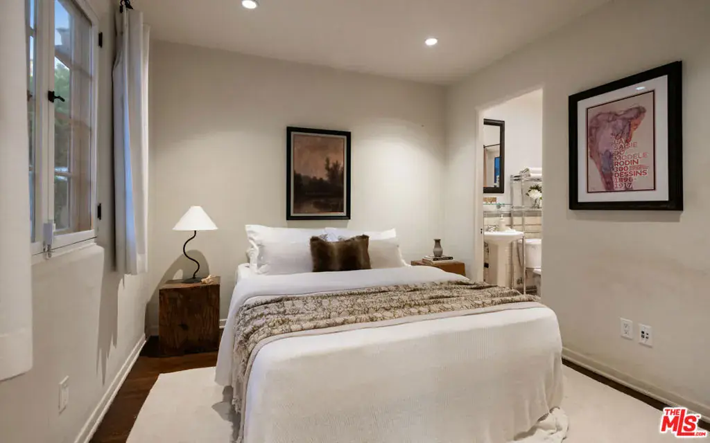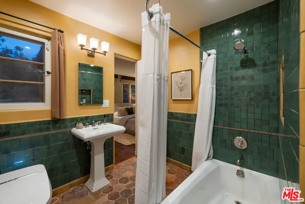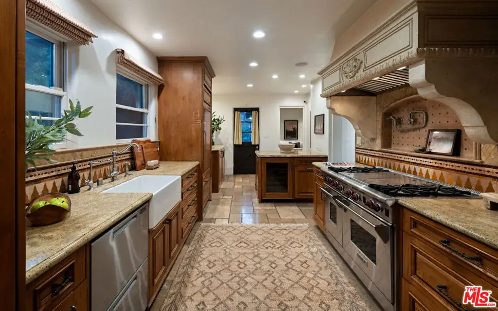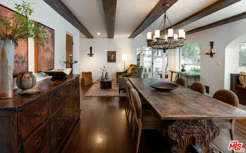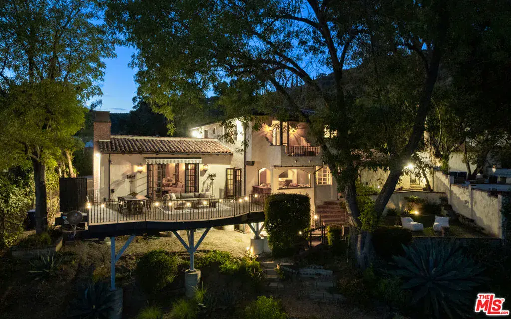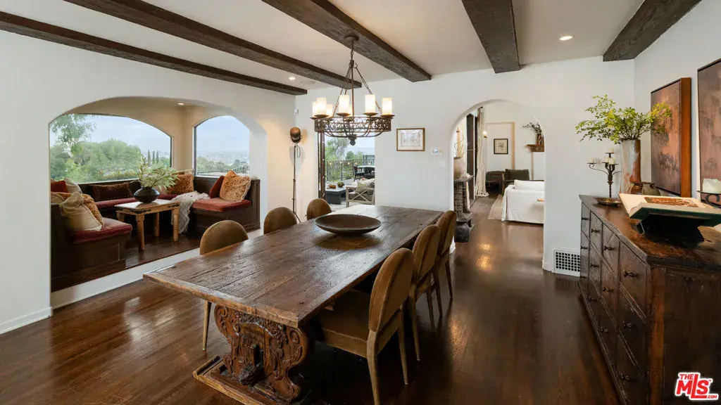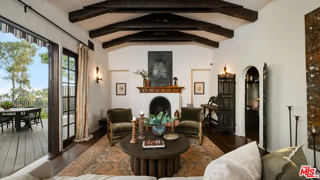 Romantic Spanish Revival tucked just below the iconic Hollywood Sign, this character-rich home captures the magic of Old Hollywood with breathtaking views that sweep across the canyons, city skyline, and ocean beyond. Set behind a gated entry and surrounded by nature, the home is a private hillside retreat that feels worlds away, yet moments from the heart of Los Angeles. Timeless architectural details define the interiors, including arched doorways, textured plaster walls, beamed ceilings, ceramic tile accents, and a warm wood-burning fireplace anchoring the living room. The formal dining room is framed by arched windows with panoramic views and a cozy sitting nook. The chef’s kitchen is complete with a Wolf range, farmhouse sink, stone countertops, wine fridge, and custom cabinetry, seamlessly connecting to dining and outdoor entertaining spaces. Off the kitchen is the first of four bedrooms with en-suite bath and separate outdoor access, perfect for a guest room or in-law suite. Upstairs, the primary bedroom, fitted with a walk in closet and updated bathroom, opens to a private balcony where sunrise and sunset views stretch across Los Angeles. Additional bedrooms and flexible bonus spaces offer versatility for creative living, a work-from-home retreat, or guest accommodations, including the back bedroom with a cinematic Hollywood Sign backdrop. Bathrooms showcase vintage tile work, Toto toilets, and period finishes that honor the home’s Spanish heritage. Outside, the property unfolds as a tranquil retreat with an expansive deck, multiple patios, and terraced gardens framed by lush trees, ideal for morning coffee or sunset dinners. Evenings are especially enchanting as city lights glimmer in the distance and the home’s Spanish architecture glows against the hillside. Just minutes from Beachwood Market, Beachwood Cafe, the trails of Griffith Park, the Hollywood Bowl, and Franklin Village, this is a home for those who value privacy, character, inspiration, and accessibility. This unique offering provides timeless Hollywood appeal in one of Los Angeles’ most renowned settings.