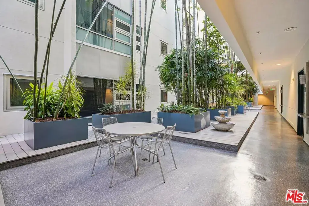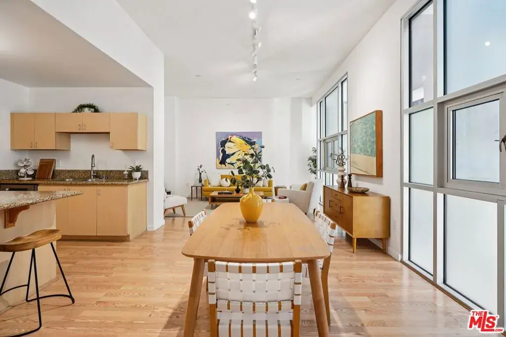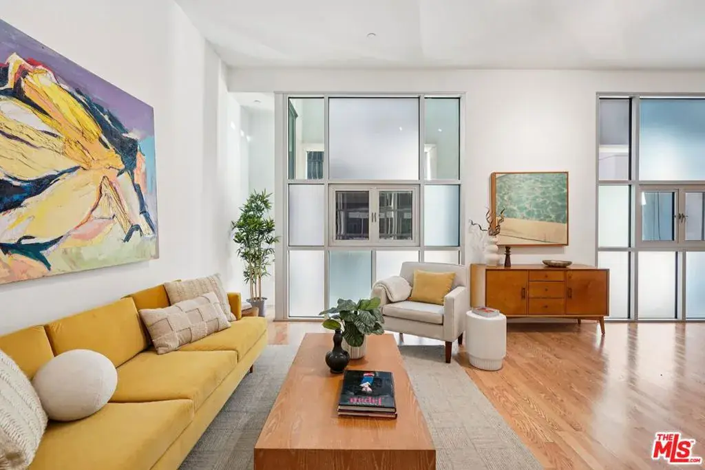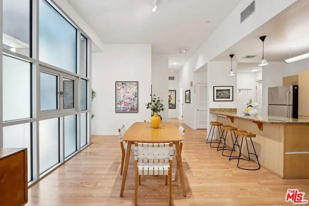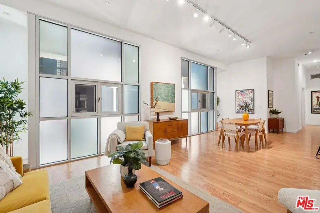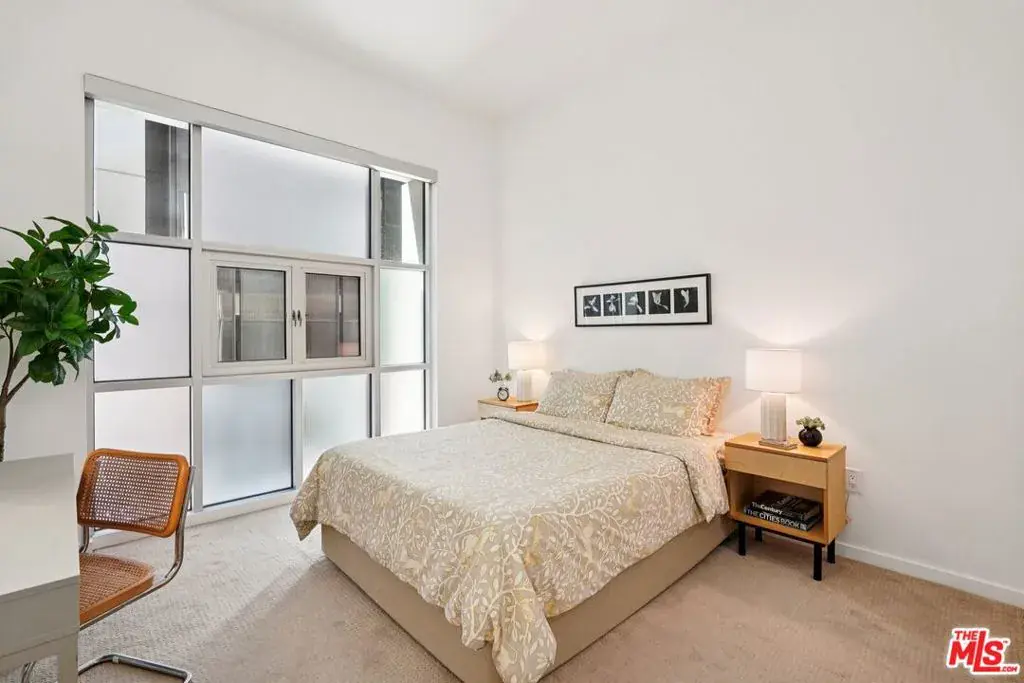 A well-designed 5th-floor residence at Library Court, featuring the tallest ceiling height in the building at over 10 feet. Expansive glass wall systems and oversized windows introduce abundant natural light while creating a strong sense of volume throughout the home. The oversized living and dining areas open into a broad, flexible entertaining space ideal for hosting, art display, or live/work use.The open kitchen is thoughtfully integrated into the main living area and offers granite countertops, stainless steel appliances, ample cabinetry, and a large island with breakfast bar seating. On the opposite side of the residence, two fully enclosed bedrooms are privately situated away from the common areas, each with high ceilings, plush carpeting, and large windows framed by the building’s signature glass panels that provide soft, diffused light and privacy. The primary suite features dual closets and a private en-suite bath. Additional highlights include in-unit stacked laundry, newer plumbing upgrades, direct-access water shut-off valves, and two parking spaces. Library Court is a distinctive mid-century office conversion offering a Zen bamboo courtyard, fitness center, business lounge, game room, and a 24-hour attended lobby, all in a prime Financial District location near the Los Angeles Central Library, FIGat7th, Metro lines, Whole Foods, and acclaimed dining.