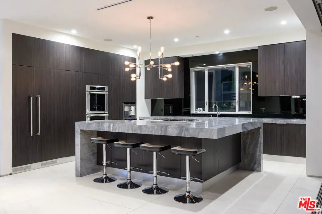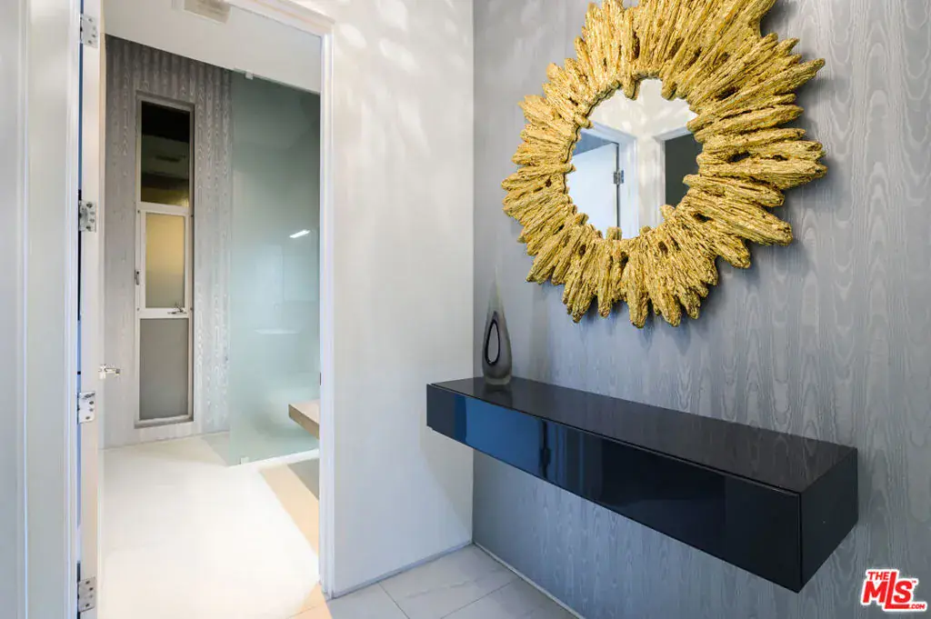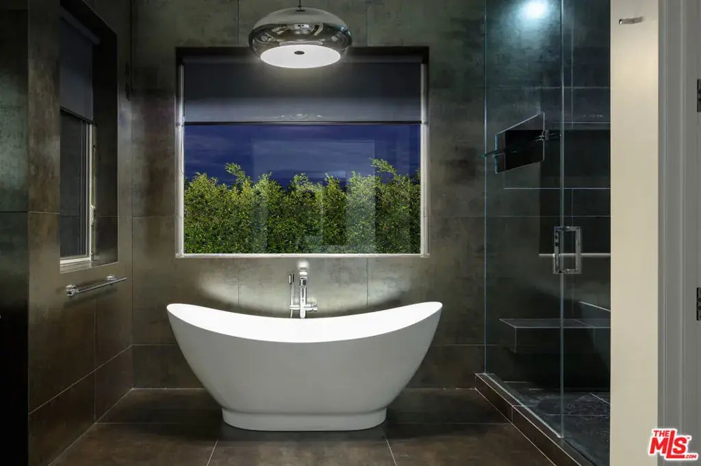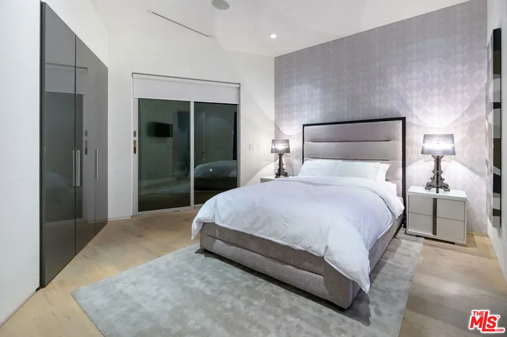 Indoor and outdoor living merge gracefully into one at this modern Beverly Grove Villa. Privacy abounds at this Smart Home beyond the gated entrance with tall foliage. The home showcases several beautiful living spaces and 5 bedroom suites each with their own private patios. The modern interior is bathed in natural light throughout. The dramatic two-story living room is bright, open and inviting with the vertical fireplace reaching up to the second level. The chef’s kitchen with top of the line appliances and a waterfall island offers views of the pool, spa and grass area through the walls of glass that vanish. A floating staircase leads upstairs to the bedroom sanctuaries. The primary suite showcases a stunning fireplace, luxurious bathroom with a frameless glass shower and soaking tub, and a spacious walk in closet.