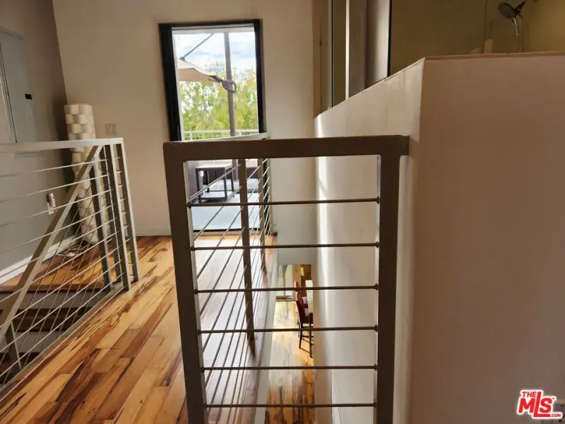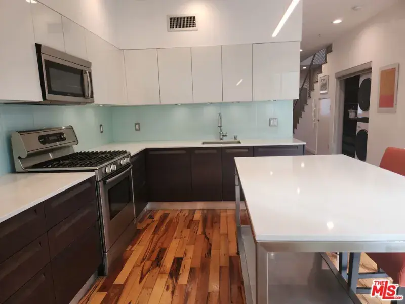This stunning 1 BR/2 BA unit. is located in an architecturally significant building designed by Clive Wilkinson, AIA in 2008. Best known for designing interior space for Google in Silicon Valley, this building was Clive Wilkinson’s first residential project. Located in the heart of Hollywood, this building is situated on quiet Las Palmas Ave. Located in a small nine unit building, this unit is bright and airy and boasts gleaming hardwood floors throughout and abundant interior and exterior space. The inviting entry leads to a living room with floating shelves, as well as a view of the open and modern space. The oversized guest bathroom includes a tub and shower. The unit is fully equipped with a stacked washer and dryer, conveniently placed behind doors. The modern kitchen, with quartz counters and sleek backsplash is fully equipped with a stove, microwave, refrigerator and dishwasher. There is also a spacious island/table with stools, in addition to a light filled separate dining room. The kitchen opens to a family room/den, complete with a beverage/bar refrigerator. This room opens to a patio with views of the trees and sky. Upstairs, the bedroom is spacious with three abundant closets and a separate bathroom with double sinks and an oversized shower. An additional large patio is accessible from the upstairs and allows for more outside usable space to enjoy lounging or entertaining guests. The unit includes two parking spaces (tandem) in the secure underground parking garage. Guests parking spots are also available. This unit is just a short walk to the Hollywood Bowl and the city restaurants and entertainment venues.