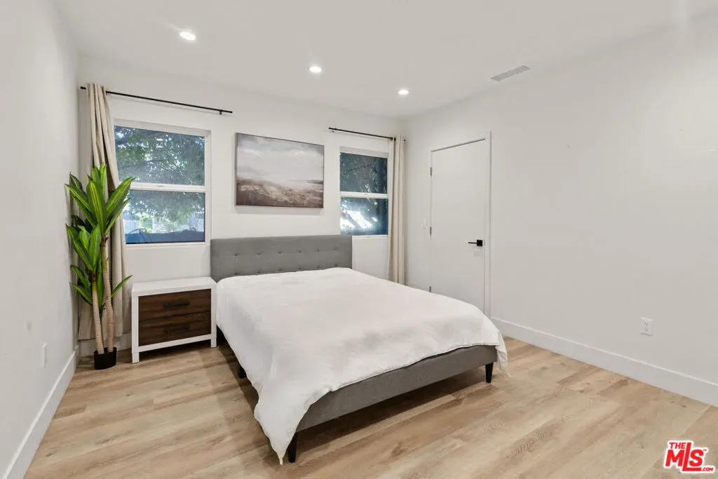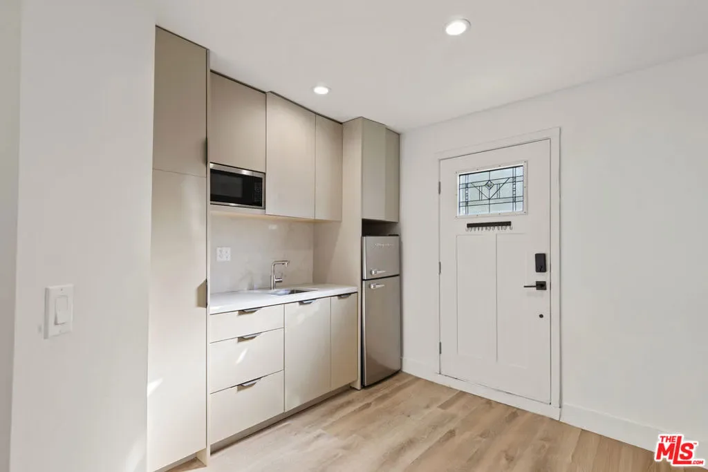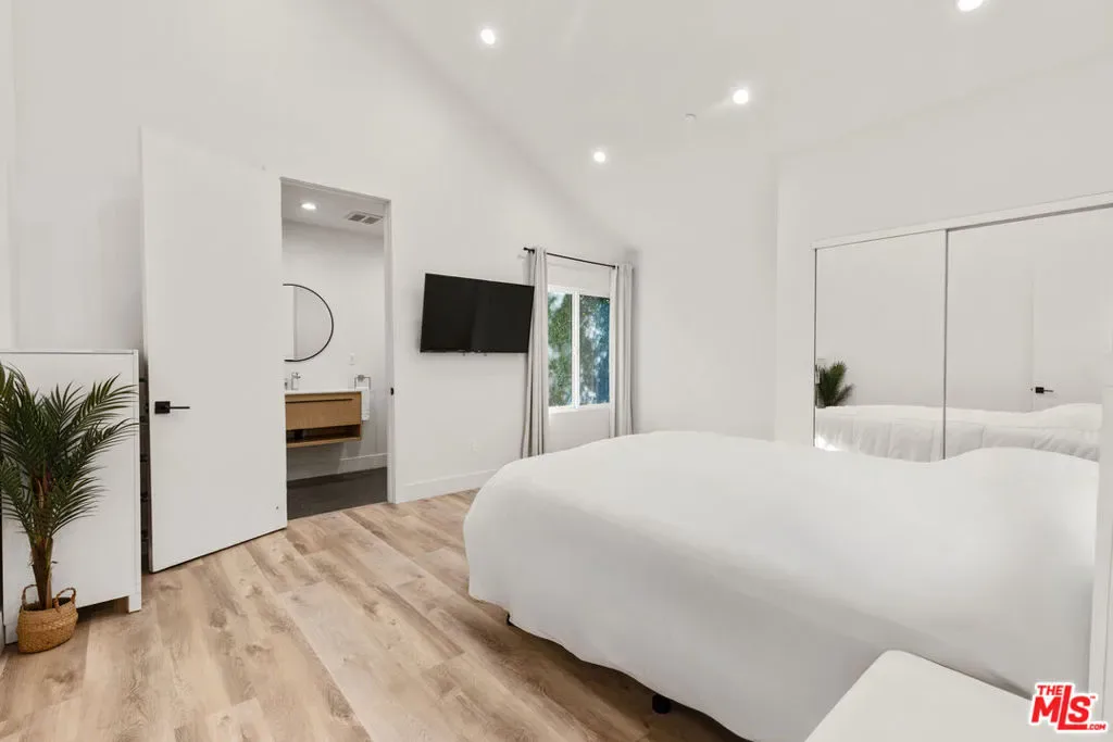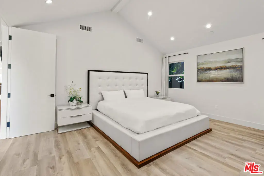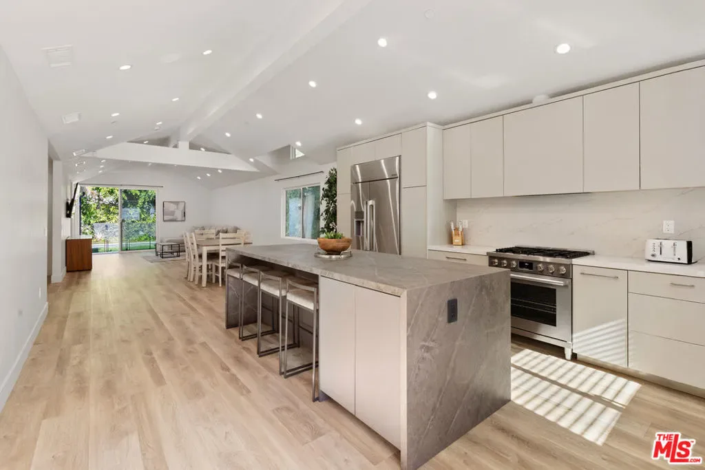 A refined modern retreat set behind gates on a quiet, tree-lined street in the heart of coveted Beverly Grove. Thoughtfully reimagined with clean architectural lines and warm natural finishes, this residence offers an effortless blend of contemporary design and relaxed California living.The home opens into a soaring great room where vaulted ceilings, exposed architectural beams, and wide-plank oak floors create an immediate sense of volume and light. Expansive living and dining spaces flow seamlessly into a sleek chef’s kitchen, anchored by a striking stone-wrapped center island, custom flat-panel cabinetry, and premium stainless-steel appliancesperfectly suited for both everyday living and elegant entertaining.Walls of glass dissolve into a private backyard oasis, creating a seamless indoor-outdoor connection. The sun-drenched pool, lounging and dining areas, and mature hedging form a serene, resort-style setting designed for both hosting and unwinding in total privacy.The primary suite is a tranquil escape, finished in soft stone and refined modern details, featuring dual floating vanities, a glass-enclosed walk-in shower, and peaceful garden views. Three additional bedrooms and beautifully curated baths provide comfort and flexibility for family, guests, or a home office.Every element has been carefully curated to deliver effortless luxury and timeless design, from the architectural ceiling lines to the fluid layout that celebrates Southern California’s signature indoor-outdoor lifestyle. A rare Beverly Grove offering that pairs modern elegance with a true sense of serenity.