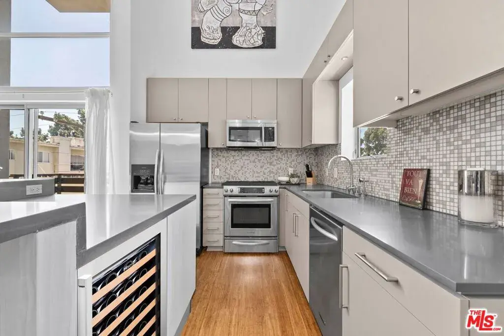 View this beautiful, highly functional open loft, where 18-foot soaring ceilings and wall-sized windows flood the space with natural light. Upgraded with a white oak kitchen island, chic Venetian plaster wall and fireplace, sleek glass railings, and a sliding glass wall that transforms the first-floor space into an additional ensuite bedroom-perfect for guests or a home office. The bamboo hardwood floors have also been recently refinished, adding warmth and polish to the modern aesthetic. The streamlined kitchen features Caesarstone countertops and mosaic tile accents, continuing the elevated design into both the kitchen and bathrooms. Additional features include a private balcony, in-unit laundry, two gated tandem parking spaces, dramatic architectural hallways, a contemporary water feature entry, and nine guest parking spots- rare perks in the city. Located in the heart of Hollywood, just minutes from the Roosevelt Hotel, Runyon Canyon, and The Venue of Hollywood, this loft places you at the center of it all. The building’s community rooftop deck is equally impressive, offering panoramic views of the Hollywood Hills, breathtaking sunsets, and the iconic Hollywood Sign. It’s the perfect place to soak in the city’s energy. This is true LA living: style, flexibility, and a front-row seat to Hollywood’s vibrant lifestyle.