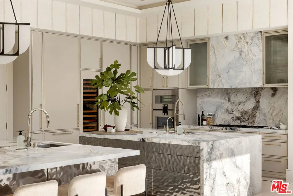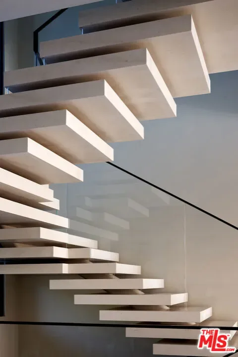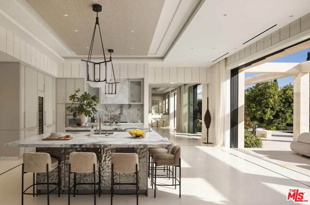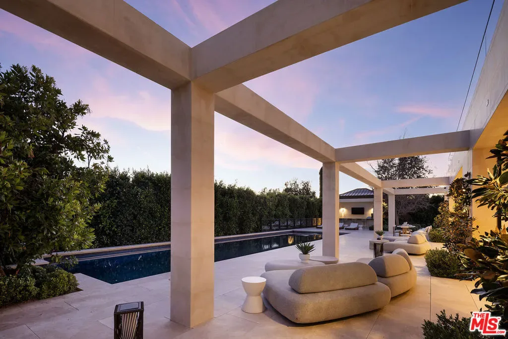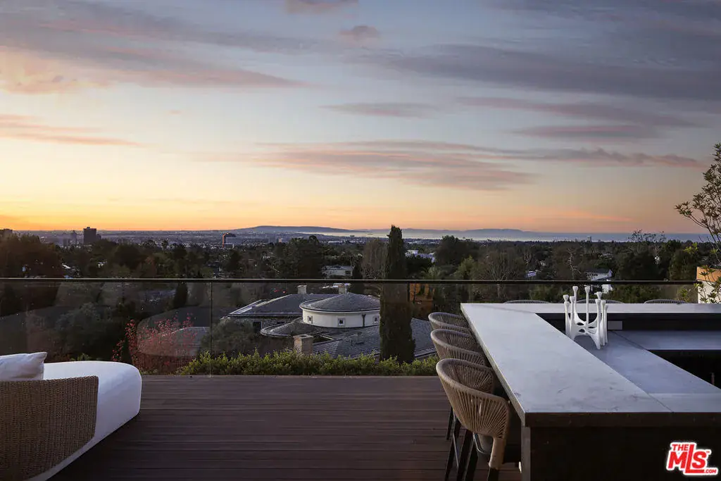 Envisioned by architect to the stars Philip Vertoch and crafted alongside award-winning, AD100-named design studio Ingrao Inc, The Bonhill represents a masterclass in blending architectural precision with timeless style. Concealed behind privacy gates with mature hedges lining its perimeter, this immaculate ocean-view estate includes multiple outdoor terraces offering spectacular panoramas, a sprawling grassy lawn, and premier amenities composed of fine materials. An impressive foyer provides a sense of continuous space with its floating limestone staircase as centerpiece, each step repeating in soft, rhythmic progression. An elegant dual-sided Cristallo marble fireplace partitions the formal living room and nearby parlor with stylish marble wet bar as soothing breezes waft through paned French and pocket doors. The true marvel of the home is its culinary center, a fusion of Farmhouse and transitional forms, a blissful yet understated display of calming hues and varied texture, optimized for casual indoor-outdoor living and entertaining. There are two center islands, custom-fitted designer cabinetry, wine refrigeration, chef-grade Gaggenau and Sub-Zero appliances, and preparation kitchen. Both the formal dining room and the library are nods to traditional, classic style. Upstairs, the owner’s suite opens to a vast patio with incredible views of the Pacific, Catalina Island, treetops, mountains, and urban sprawl. Its sleek, spa-inspired bath includes a soaking tub, oversized shower, makeup desk, toilet room, and dual-sink vanity. There are also two walk-in closets and a secondary en-suite marble-clad bath. From the spacious rooftop deck, serve party guests, barbecue and serve light bites, and recline with fantastic vistas as backdrop. For lazy mornings and warm afternoons, a pajama room transitions to a sunny travertine balcony surrounded by lush greenery, reminiscent of summers abroad. Standout luxe amenities include a state-of-the-art gym, theatre with refreshment bar, art gallery, wine tasting/cigar lounge, and wellness spa with steam shower, massage room, and dry sauna. An elevator connects all levels. Outside, lounge poolside under open-air verandas and meditate in peaceful gardens. The pool includes a baja shelf and accompanying cabana with bar and shower. The long pebble driveway leads to a finished subterranean garage affording parking for eight vehicles, bringing the grounds’ total capacity to 17 or more. Relish an idyllic, peaceful existence positioned in Brentwood’s Bonhill-Tigertail estates section, one of the world’s most sought-after, celebrity locales.