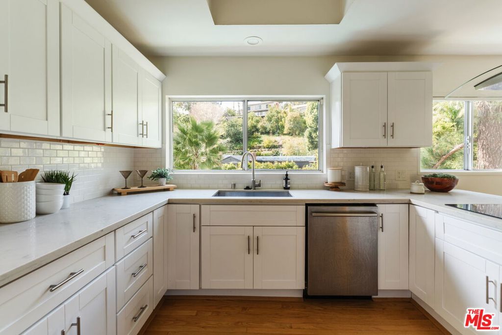 Privately set along a quiet road in sought-after Outpost Estates, this sophisticated mid-century home captures the essence of classic architecture paired with modern comfort. Framed by treetop surroundings and sparkling views that stretch to the downtown skyline, the home offers seamless indoor-outdoor living and a serene sense of retreat above the city. At the center of the home, the living room showcases a dramatic butterfly roofline and walls of floor-to-ceiling glass that flood the space with natural light while framing sweeping vistas. The open design creates an effortless flow for both daily living and entertaining. A sculptural floating staircase leads to the lower level, where three bedrooms, including two of which are oversized, provide privacy and comfort. The primary suite opens onto a spacious deck, which steps down to an inviting outdoor setting designed for relaxation and entertaining. The backyard features a sparkling pool, sun-filled lounging areas, and lush greenery that enhances the peaceful hillside setting. A thoughtfully remodeled kitchen, clean contemporary finishes, and a functional open layout complete the home, balancing timeless mid-century character with modern livability. Distinctive and memorable, this architectural retreat offers a rare opportunity to experience the tranquility of the Hollywood Hills while remaining moments from the energy of the city.