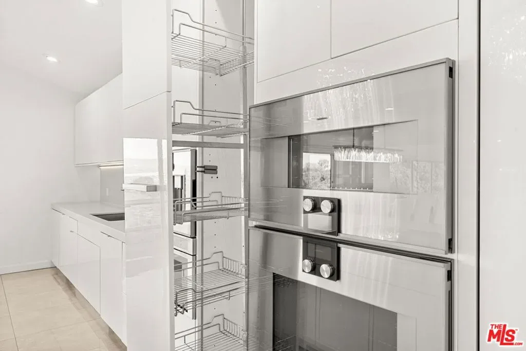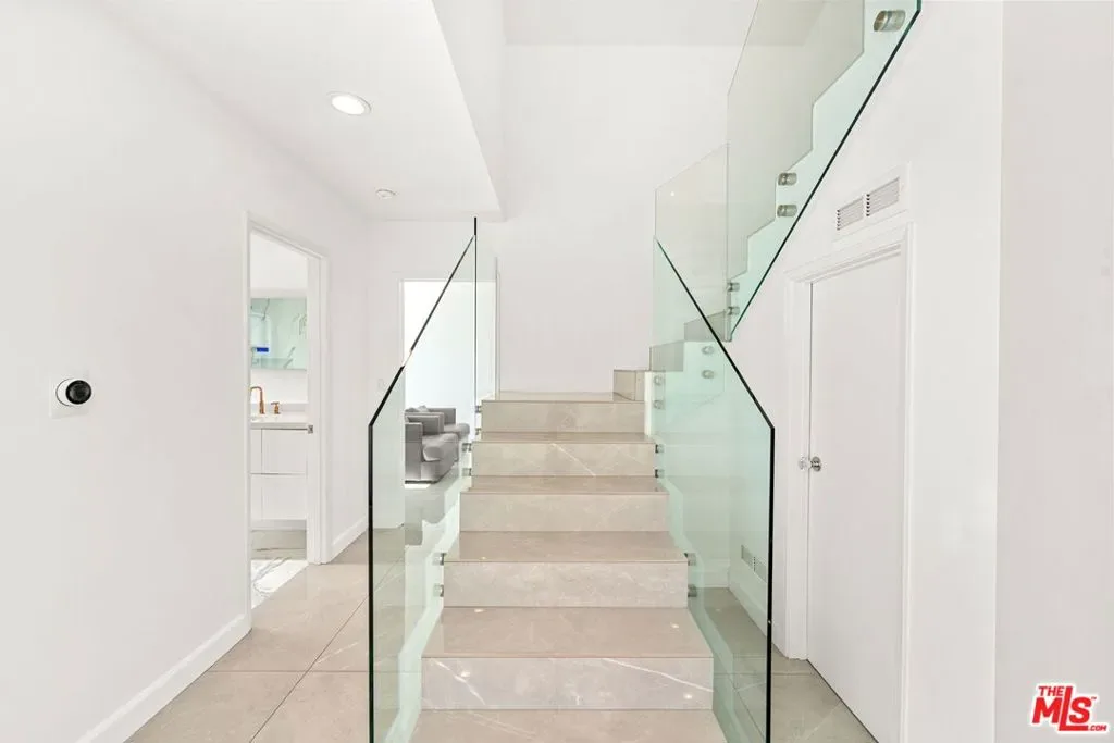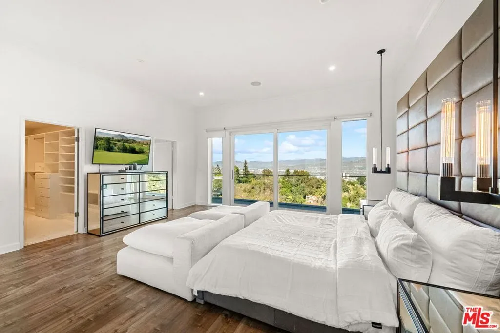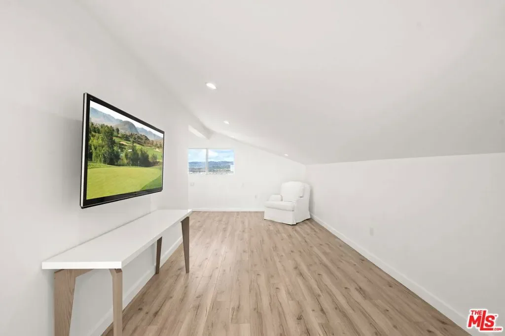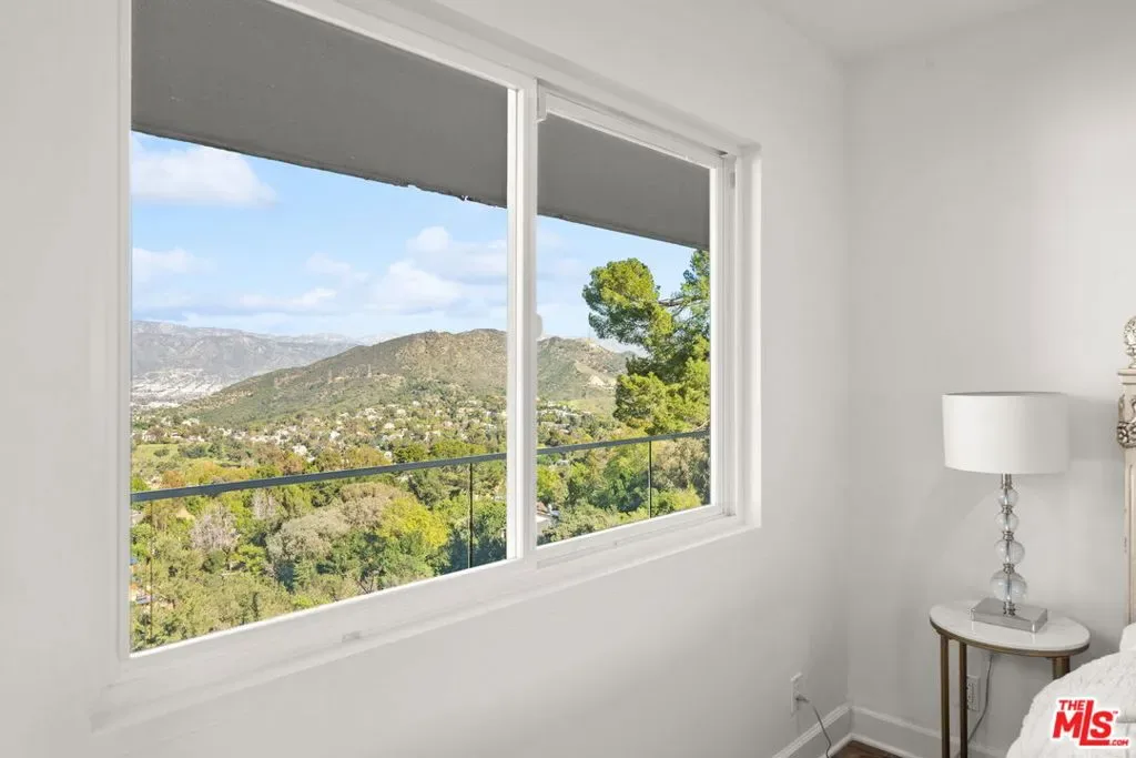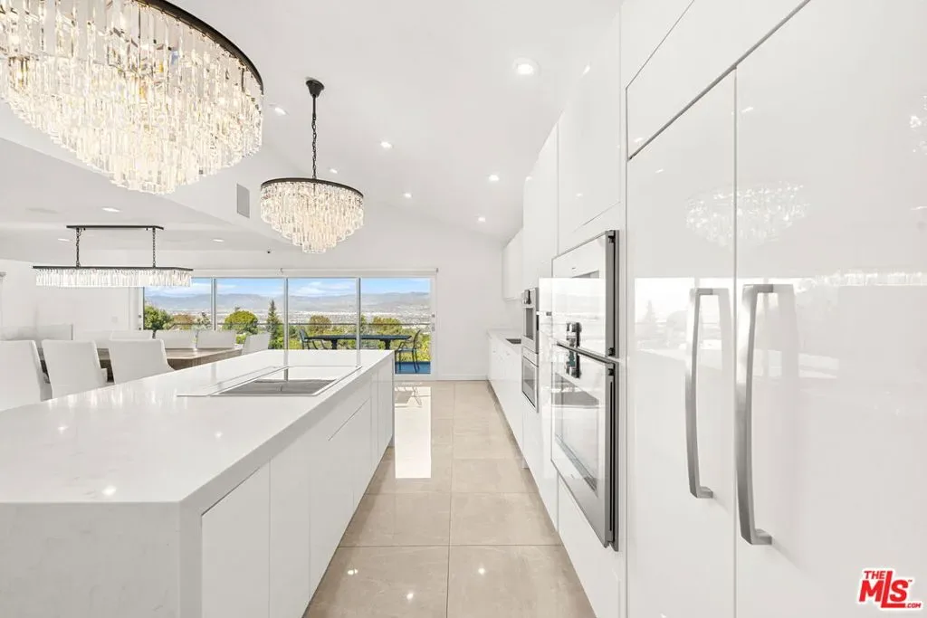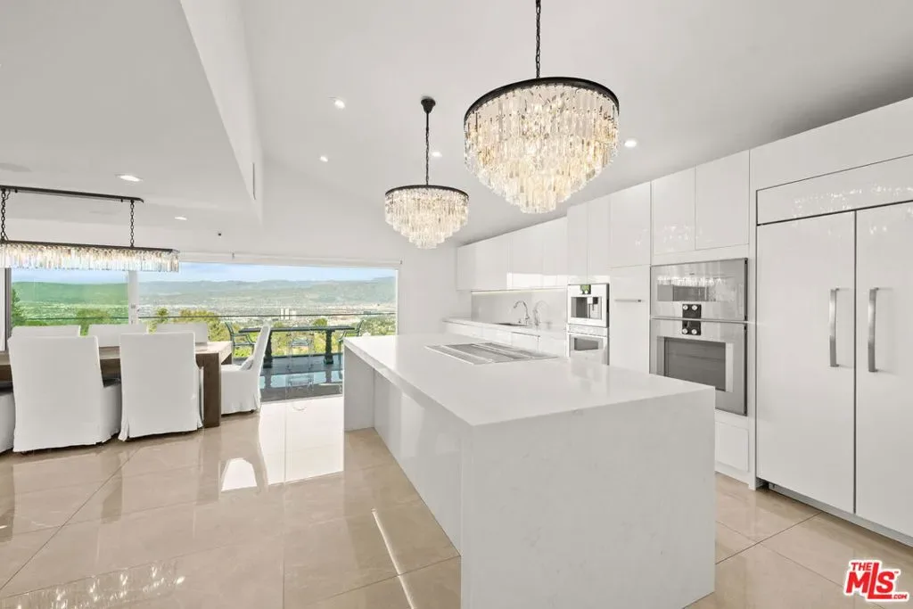 Stylish elegance meets breathtaking panoramic views, creating a true floating-above-the-city experience. This refined residence blends sophisticated design with open architectural flow and seamless indoor-outdoor connectivity, capturing sweeping vistas throughout while offering a private retreat crafted for elevated Los Angeles living. The home features 4 bedrooms, three located on the lower level, and one on the main level currently configured as an office along with a spacious loft/flex space suitable for guests or media use (not counted as a fifth bedroom). Additional amenities include a private screening room and a garage area configured for gym or wellness use. Sonos sound system throughout. The main living level showcases the home’s most impressive vantage points, highlighted by expansive dual-pane windows and dramatic multi-panel Fleetwood sliding glass doors opening accordion-style to panoramic scenery. An open chef’s kitchen flows seamlessly into the living area anchored by a statement fireplace and striking designer lighting, creating an inviting setting for entertaining.Kitchen features include Gaggenau appliances, marble countertops, and generous preparation space, connecting naturally to the dining area, glass-enclosed balconies, and outdoor gathering areas surrounding the pool, spa, and BBQ entertaining space. On the lower level, the primary suite enjoys sliding glass doors framing scenic views, complemented by custom walk-in closets and a spa-inspired bath featuring dual vanities, soaking tub, and separate shower. Two additional bedrooms share this level along with a third bathroom and laundry area. Designer finishes include marble accents, marble and hardwood flooring, and a carpeted theatre room with projection setup. Outdoor living is enhanced by private access steps leading directly to Runyon Canyon trail access, while maintaining close proximity to Sunset Boulevard, Laurel Canyon and Mulholland Drive. Sophisticated and thoughtfully designed, this residence delivers luxury, privacy, and layered view experiences across multiple levels.