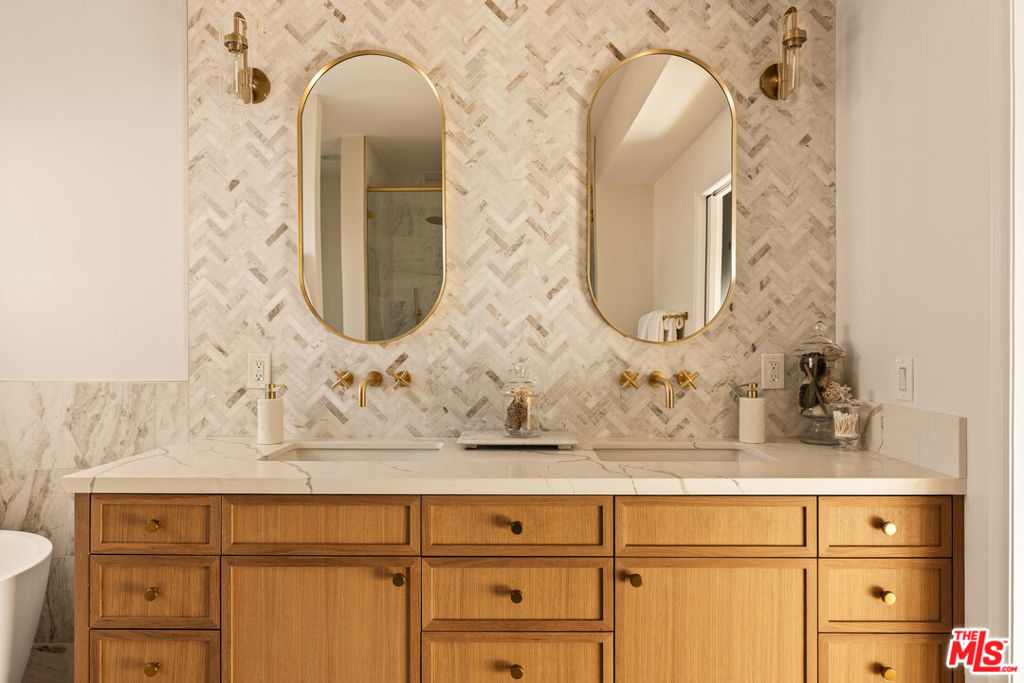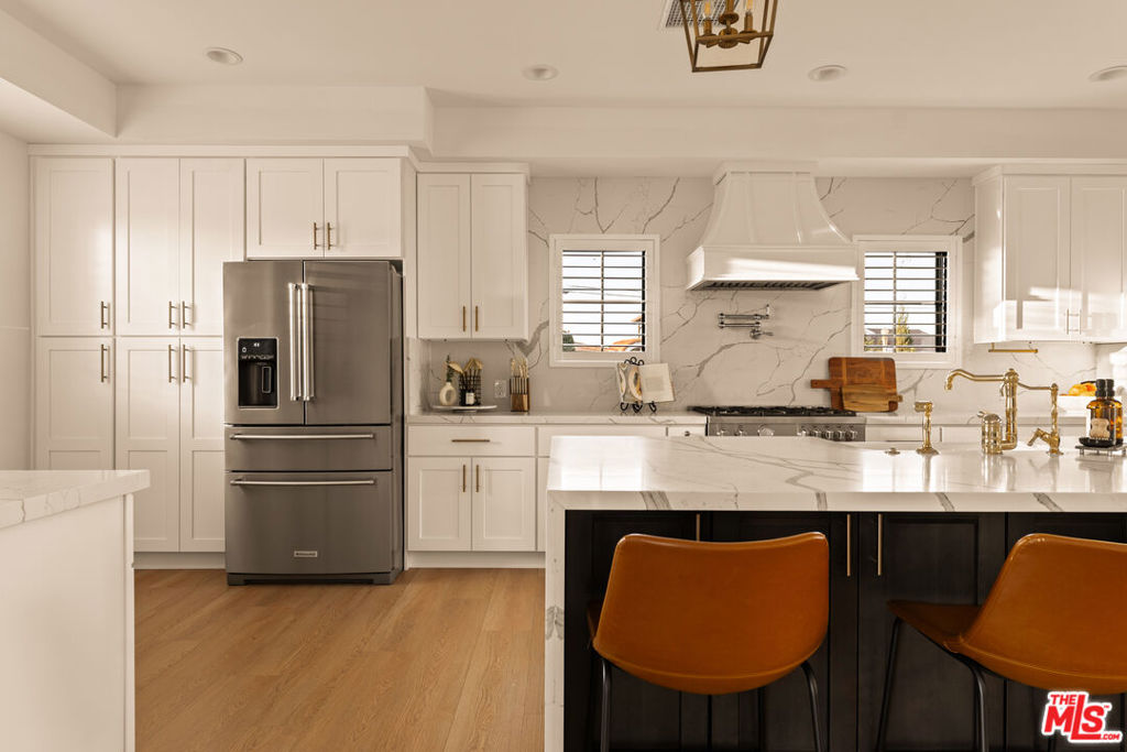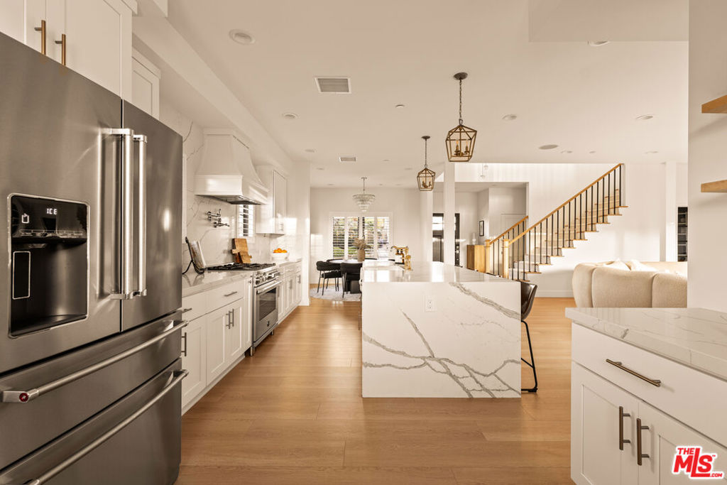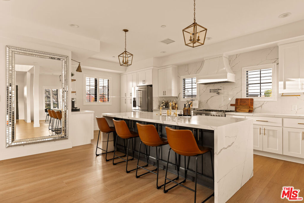 Perched on a premier corner lot in North Kentwood, this extensively rebuilt 2025 residence captures sweeping city, mountain, and peek-a-boo ocean views while offering the effortless indoor-outdoor lifestyle Southern California buyers seek. Originally built in 1953, the home underwent a comprehensive down-to-the-studs reconstruction and expansion. The property was rebuilt with entirely new electrical, plumbing, framing, insulation, ductwork, gas lines, drywall, windows, and structural systems throughout both levels. The result is a home that lives and feels like new construction. Step inside to discover a high-end gourmet kitchen, beautifully appointed with quartz countertops and backsplash, an oversized island, Bertazzoni range and hood, KitchenAid refrigerator, and a wine refrigerator perfectly designed for effortless entertaining. The adjacent great room, bathed in natural light, features a custom Milgard four-panel stacking slider that opens seamlessly to an expansive outdoor deck. Just beyond, the formal dining area and inviting family spaces create the ideal setting for intimate dinners or lively gatherings. On the first level, the luxurious primary suite awaits, complete with a custom walk-in closet and a spa-inspired bathroom showcasing marble finishes, quartz countertops, and a custom vanity. An additional bedroom or office on this level adds versatility and convenience. Ascend the custom stairway to the upper level, where two spacious secondary bedrooms are thoughtfully positioned on opposite sides of a generous family room. A convenient upstairs laundry room and a balcony with cozy seating provide the perfect place to unwind while taking in the home’s panoramic vistas. Outside, the entertainer’s backyard invites you to relax and enjoy the Southern California lifestyle with a built-in fire pit, outdoor TV, and two grassy play areas. The fully permitted ADU offers remarkable flexibility ideal for guests, extended family, or generating additional rental income. During the expansion, the home was thoughtfully enhanced with a new powder bath and stairway, while the front fade was completely reimagined with hand-cut Sierra White Limestone, creating a striking architectural presence and elevated curb appeal. Recent 2025 updates include a Presidential TL triple-layer shingle roof, fully paid Tesla solar panel system, custom security and weather shutters, fiberglass Andersen and Milgard windows with security window tint, solid wood doors throughout, plantation shutters and designer window treatments in every room, and a whole-home water softener and filtration system. Premium Arizona Tile finishes, all-brass plumbing fixtures, and Lutron smart lighting with LED switches complement the home’s fully integrated smart-home system allowing you to control lighting, climate, and exterior features with ease from your phone.