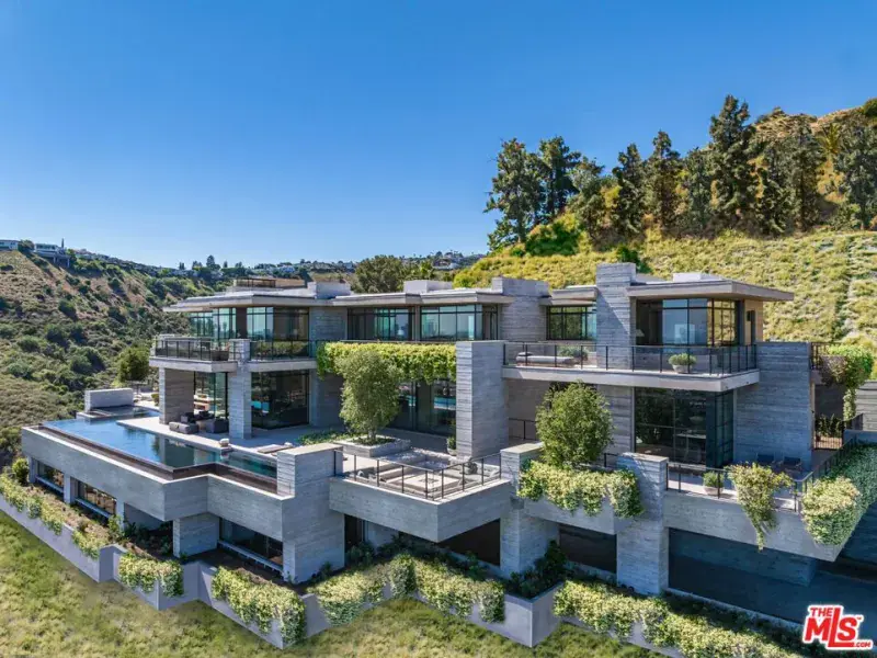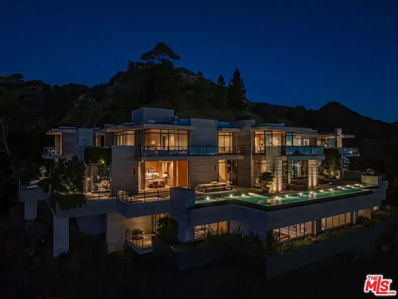 The Hollywood Hills House designed by Scott Mitchell Studio is a monumental and versatile modern villa rising out of the Hollywood Hills. The layered and terraced house – designed for living and entertaining – embraces views that span L.A.’s cityscape from east to west and out to the Pacific Ocean. This property is set on Los Angeles’s most iconic promontory, formerly owned by Howard Hughes, that extends over one acre with no neighbors on either side and 270 views of the entire city. Set at the 50-yard line of legendary hot spots Chateau Marmont, Tower Bar, and the Hollywood Bowl, the energy of the city can be seen and felt from the estate’s peaceful privacy. Additionally, the property borders state land so no building can be constructed behind it, and it has private access to hiking in the famous Runyon Canyon. The form of the house follows a rigorous commitment to rich, organic materials and light. Grand outdoor decks provide seamless indoor and outdoor living. With expansive volumes over three floors, the tranquil and rooted hillside haven exudes a sense of balance, repose and a seamless connection to the natural landscape. A secluded driveway inclines to an impressive, cobbled motor court that can accommodate 12 or more cars and is nestled under the house with far-reaching views across the city. From there the villa’s grand and wide staircase begins, following the form of the building, passing a large-scale, vertical water feature to the landscaped north terrace and walkway, where native plantings and open fires frame the principal steel window and door entry system. On entering, to the east is a luxurious study and to the west, an open living room with fireplace and views across the city that flows into the dining room and on to the kitchen and family room, where floor to ceiling glass sliding doors open seamlessly connecting indoor and outdoor and framing wide urban vistas. On the exterior, wire-brushed narrow Itauba deck boards and an elegant dark stone clad infinity pool and hot tub are flanked by a sunken fire pit and seating area. A stand-alone pool bar and lounge is connected by a covered breezeway adjacent to an outdoor seating area. Walkways and terraces continue around the house incorporating native oaks and under-storied plantings that are composed with elements of fire and water. On the upper level, the primary bedroom wing comprises not only the primary bedroom but separate bathrooms and dressing rooms, and a study that can be isolated from the rest of the suite by a discreet pocket door system. On the lower level is a recreational zone with state-of-the-art screening room, billiards room with lounge area, and a bar. These program elements are organized around a gracious distribution foyer which doubles as a secondary point of entry to the house and leads to the motor court, which can be converted into a conditioned, modern ballroom. The house was built over a 10-year period, and new codes have been created since its construction, preventing a home of this type ever being built again in the Hollywood Hills. The house is constructed with $30 million of solid poured-in-place board-formed concrete with three feet thick concrete walls, and over 100 caissons that go 100 feet deep. The hard cost of the construction is $3,500 a square foot not including the land. The project engaged JRC Group, Inc., arguably the best builder in the city. The house includes a multi-million-dollar Jada steel door package, custom millwork, and audio/visual.