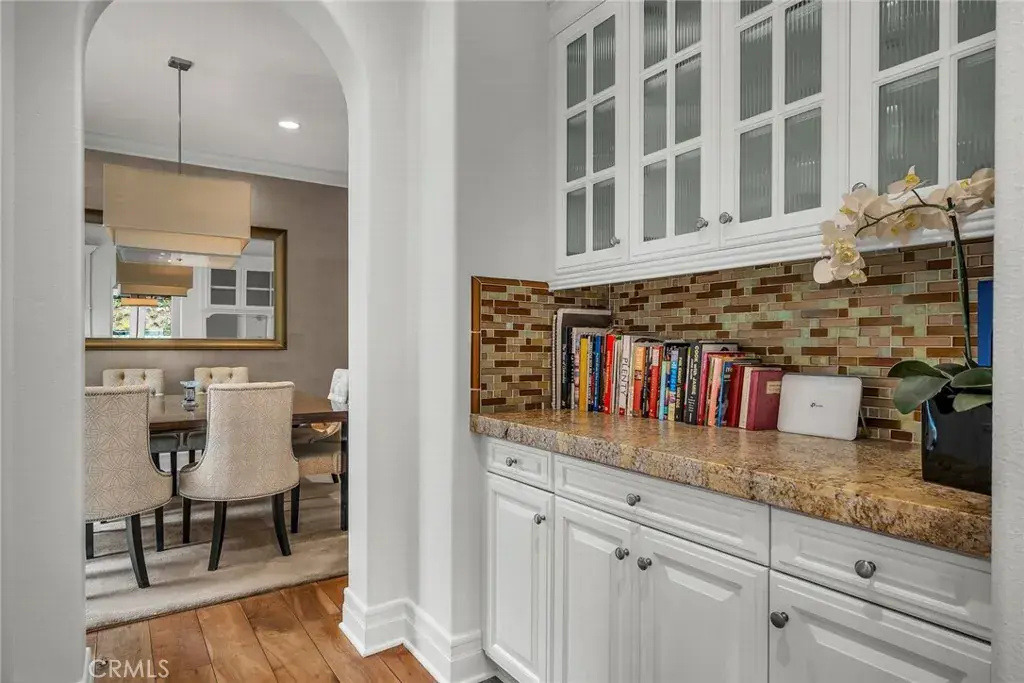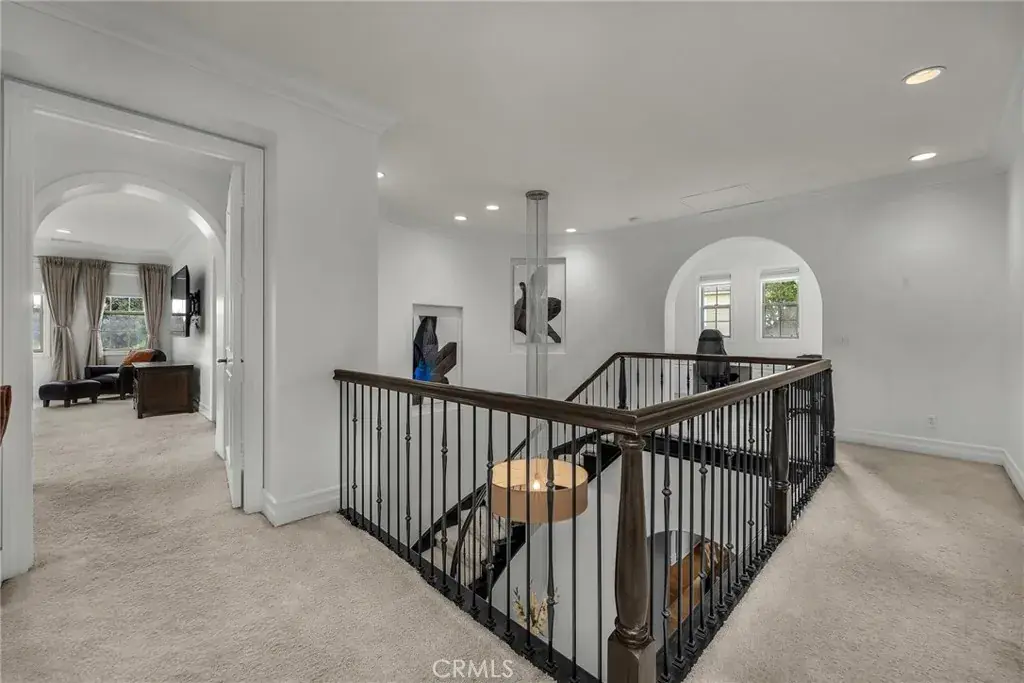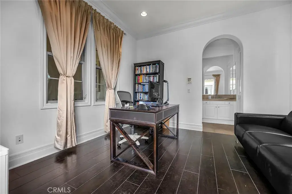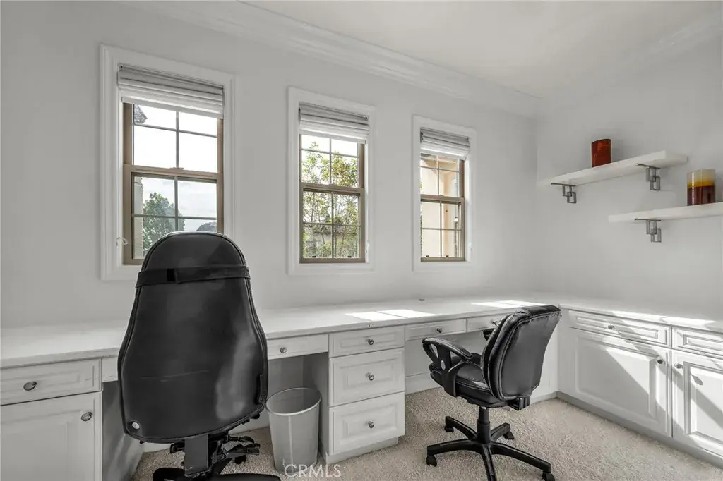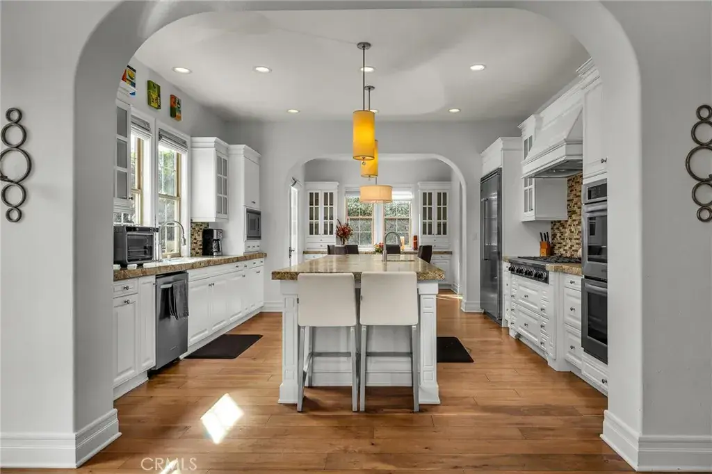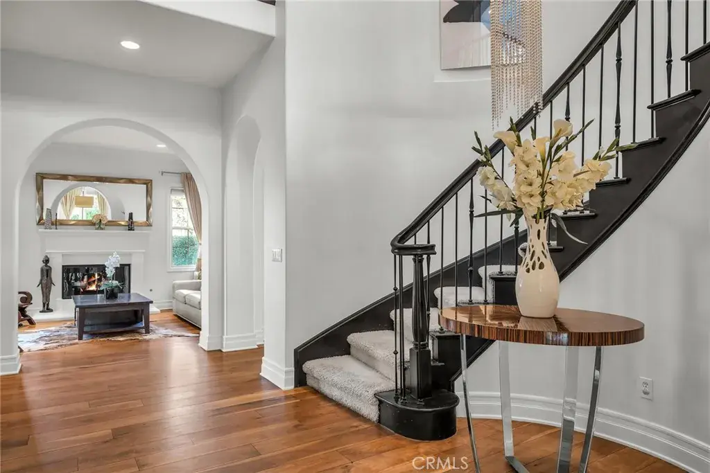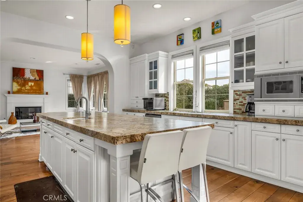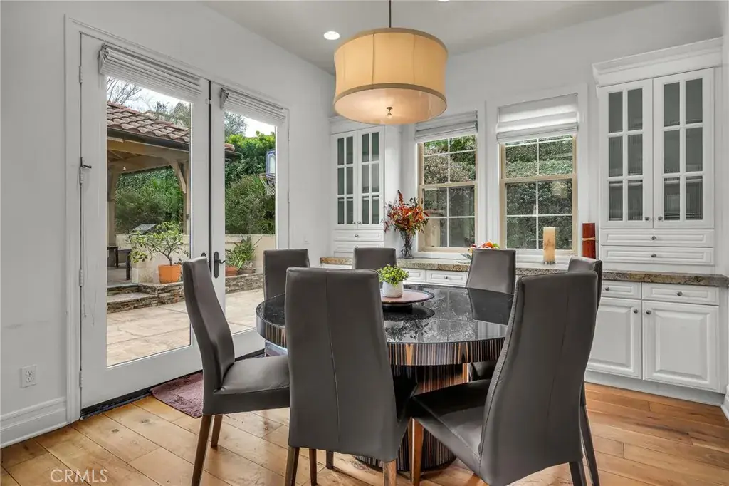 The gourmet kitchen anchors the home with a large center island, dual ovens, and butler’s pantry, seamlessly connecting to the dining and family rooms. The expansive backyard creates a private resort setting with covered lounge, natural gas BBQ, outdoor fireplace, and cabana seating for 12+. Upstairs, the primary suite offers a spa-inspired bath, sitting area, and oversized walk-in closet. A detached casita with full bath provides additional flexibility for guests, office, or wellness use.