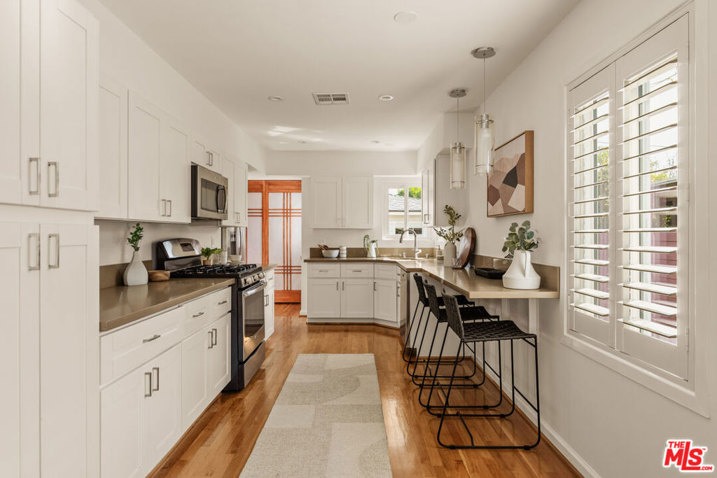 This light-filled residence is ideally situated in the highly sought-after Kentwood neighborhood of Westchester, offering an exceptional blend of refined design and comfortable family living. A beautifully landscaped, terraced front entry sets the tone, welcoming you into a thoughtfully curated interior featuring white oak hardwood floors, fresh designer paint, plantation shutters throughout, and an effortless, open flow. The spacious living areas are both inviting and sophisticated, while the remodeled bathrooms showcase high-end finishes, including updated flooring, elegant fixtures, and a beautifully reimagined tub and shower. The kitchen is conveniently located just off the living room and features a door leading directly to the backyard, creating an easy flow for indoor-outdoor living and everyday functionality. Two generously sized secondary bedrooms are filled with natural light and provide ideal space for family, guests, or a home office. A wide, extended hallway leads to the private primary suite, thoughtfully positioned for maximum tranquility. This serene retreat features dual closets, including a walk-in, and a spa-inspired bathroom with floating vanities, a glass-enclosed shower, and a solar tube that fills the space with soft, natural light. A sliding glass door offers seamless indoor-outdoor living with direct access to the backyard. Designed for both entertaining and everyday enjoyment, the backyard features a spacious deck perfect for al fresco dining, a lush grassy yard ideal for play, and a tranquil waterfall that creates a peaceful, retreat-like setting. Completing the property is a detached two-car garage with abundant storage and exciting potential for a future guesthouse, ADU, or flexible living space. This is a rare opportunity to own a home that effortlessly combines style, function, and warmth in one of Westchester’s most desirable neighborhoods.