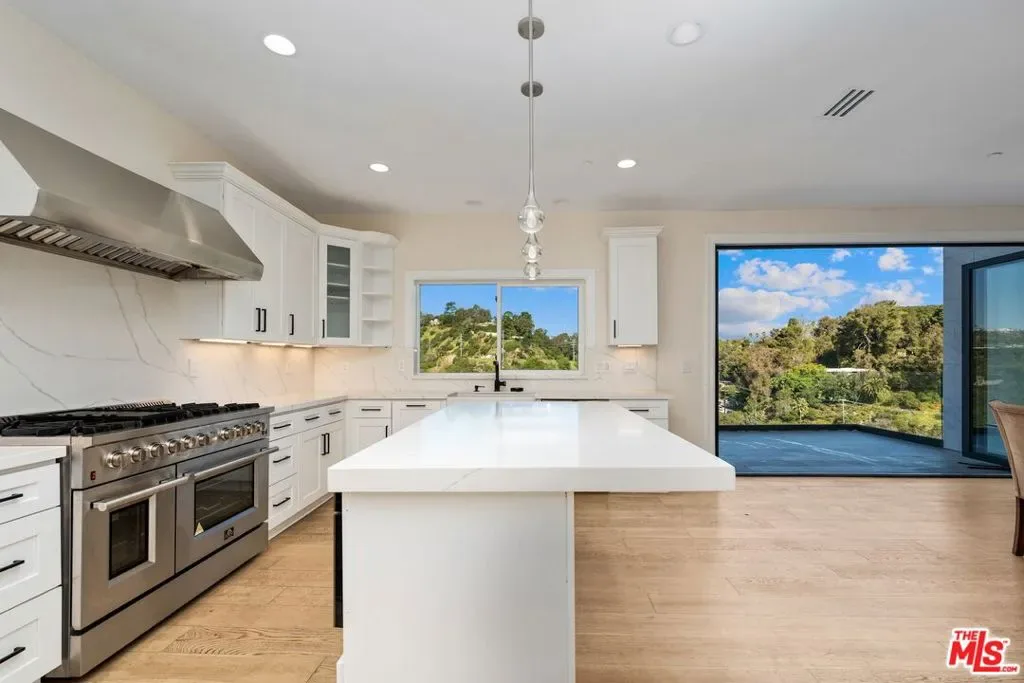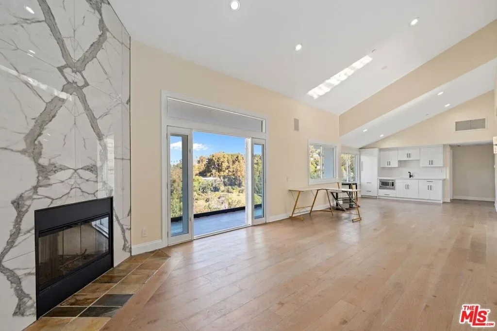 Hidden along a private road off Woodrow Wilson Drive near Mulholland, this Hollywood Hills home for sale offers exceptional privacy, scale, and sweeping canyon and hillside views. Spanning nearly 5,000 square feet, this five-bedroom Hollywood Hills residence combines architectural volume with a flexible layout designed for both entertaining and comfortable everyday living. Inside, soaring ceilings and wide-plank oak floors create a warm, contemporary atmosphere. The chef’s kitchen features stone countertops, custom cabinetry, wine refrigeration, and generous prep space, ideal for both casual dining and hosting. A versatile split-level loft provides additional living flexibility and can function as a home office, creative studio, media room, gym, or guest suite, complete with its own kitchen and bath. Spa-inspired bathrooms, integrated smart home systems, surround sound, and security features enhance convenience and comfort throughout the home. Located within the highly desirable Carpenter Community Charter School District, this Hollywood Hills property near West Hollywood is just minutes from major film and television studios, Sunset Strip dining and nightlife, and offers convenient access to both the Westside and the San Fernando Valley. Combining privacy, expansive living space, canyon views, and a premier Hollywood Hills location, this hillside retreat presents a rare opportunity in one of Los Angeles’ most sought-after residential neighborhoods.