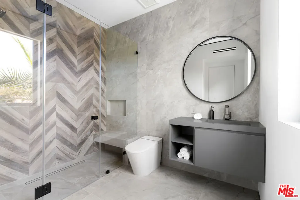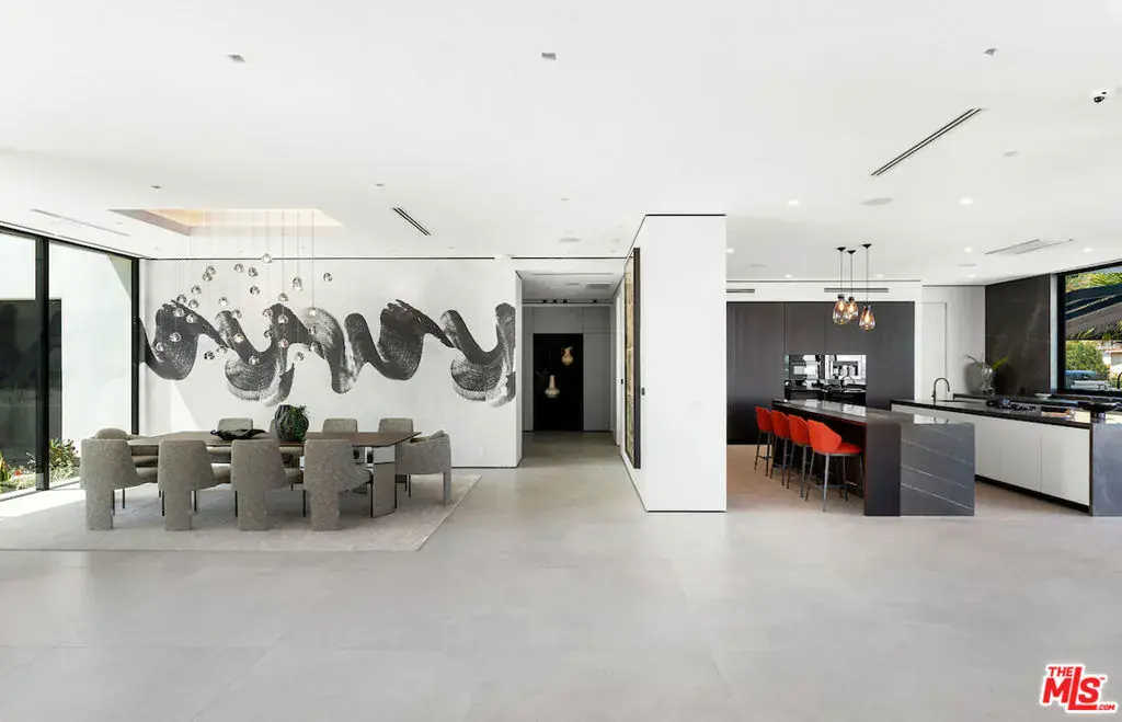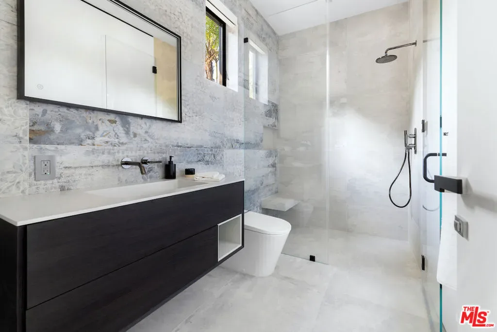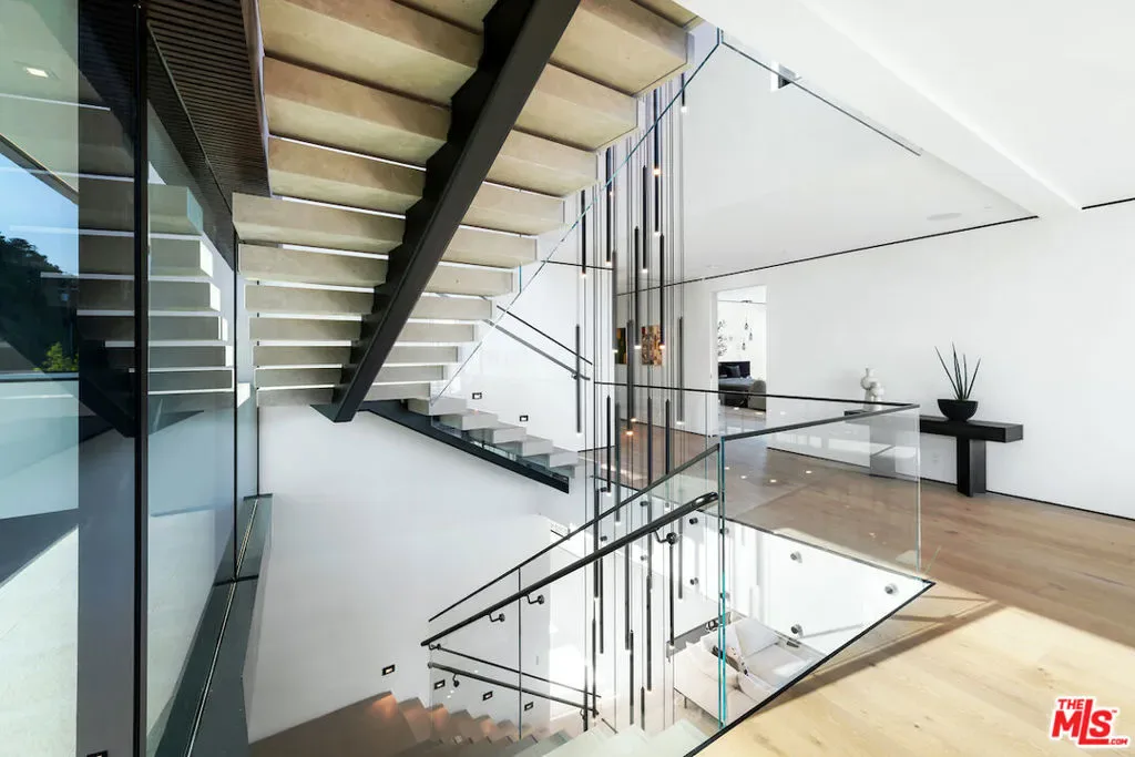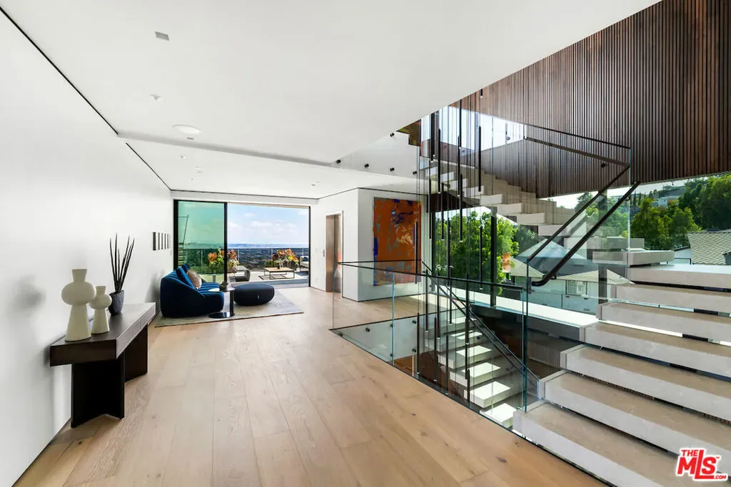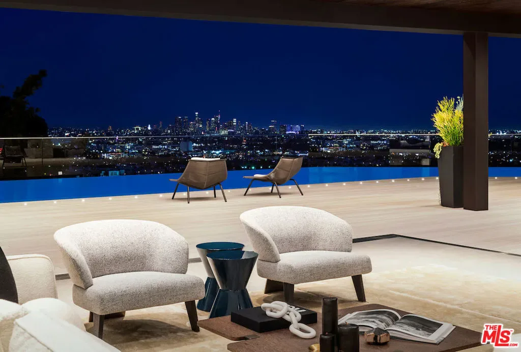 Situated in a prime lower hillside location above the renowned Chateau Marmont, this newly constructed residence offers the epitome of luxury Los Angeles living. Past a double gated motor court, the home’s modern steel, stone, and glass facade opens to a truly luxurious interior created by award-winning Nathalie M Designs that is filled with disappearing walls of glass, architectural clean lines, European Oak Wire Brushed floors, 6,399 square feet of deck space, and thoughtful high-end finishes. A functional open layout includes the main living area, grounded by an impressive stone fireplace, and grand dining area, both intended to take in the uninterrupted skyline views. A contemporary dual island kitchen with a secondary dining area sits open to both the main living and dining areas, outfitted with custom two-tone cabinetry, beautiful shadowy stone waterfall surfaces, and seamless top-grade appliances. A designer butler’s pantry, guest powder room, secondary ensuite bedroom, and car gallery round out the main level. Sliding glass walls pocket seamlessly from the main living area for uninterrupted access to the outdoor deck and picturesque zero-edge pool with spa, designed with intricate tiles and a relaxing shallow sundeck. Glass railings allow for every opportunity to take in the views, while a covered lounge area and bar-edged outdoor kitchen provide ample entertainment areas. The upper level of the home includes the dazzling primary suite, crafted with a stunning stone-facade fireplace, purposeful wet bar, substantial custom closet, a stone-wrapped spa grade bathroom, and of course, glass pocket walls to access the private patio and take in the incredible views. A plush lounge area, outdoor patio, and three secondary bedrooms all featuring ensuite designer bathrooms and some including private outdoor spaces, complete the top floor of the residence. Accessed via floating staircase from the second level outdoor patio, or interior elevator which is accessible to all floors and rooftop, the pinnacle of the property features an expansive rooftop deck, outfitted with a full outdoor kitchen, gas firepit, and glass railings for an epic vantage point. At the lower level of the home, a secondary living area contrasts sleek white walls with a magnificent book matched stone fireplace and entertainment area, ultimately leading to two additional secondary bedrooms with designer ensuite bathrooms, a plush galaxy-ceiling theater, designated laundry room, and resort-level spa, complete with oversized soaking tub, glass enclosed shower, and stone steam room. Additional aspects of the home include a second garage, intricate lighting to accent key architectural features, a state-of-the-art surround sound system, top of the line smart home technology, and an impressive fully equipped home security system.