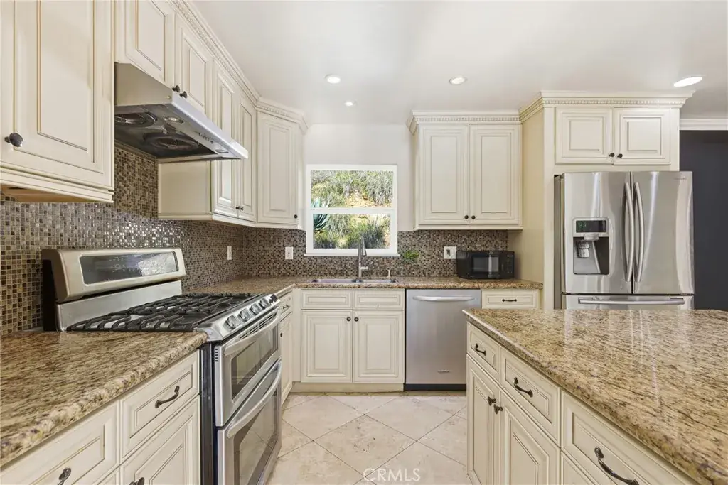 Courtesy of The Agency – Studio City. Disclaimer: All data relating to real estate for sale on this page comes from the Broker Reciprocity (BR) of the California Regional Multiple Listing Service. Detailed information about real estate listings held by brokerage firms other than James Outland include the name of the listing broker. Neither the listing company nor James Outland shall be responsible for any typographical errors, misinformation, misprints and shall be held totally harmless. The Broker providing this data believes it to be correct, but advises interested parties to confirm any item before relying on it in a purchase decision. Copyright 2026. California Regional Multiple Listing Service. All rights reserved. Set behind a gated entrance, the home unfolds into an inviting open-concept layout where natural light flows effortlessly throughout. The living area features timeless tile flooring and a seamless connection to the kitchen, creating an ideal environment for both everyday living and entertaining. The spacious kitchen offers ample cabinetry and workspace, perfect for hosting intimate dinners or casual gatherings.