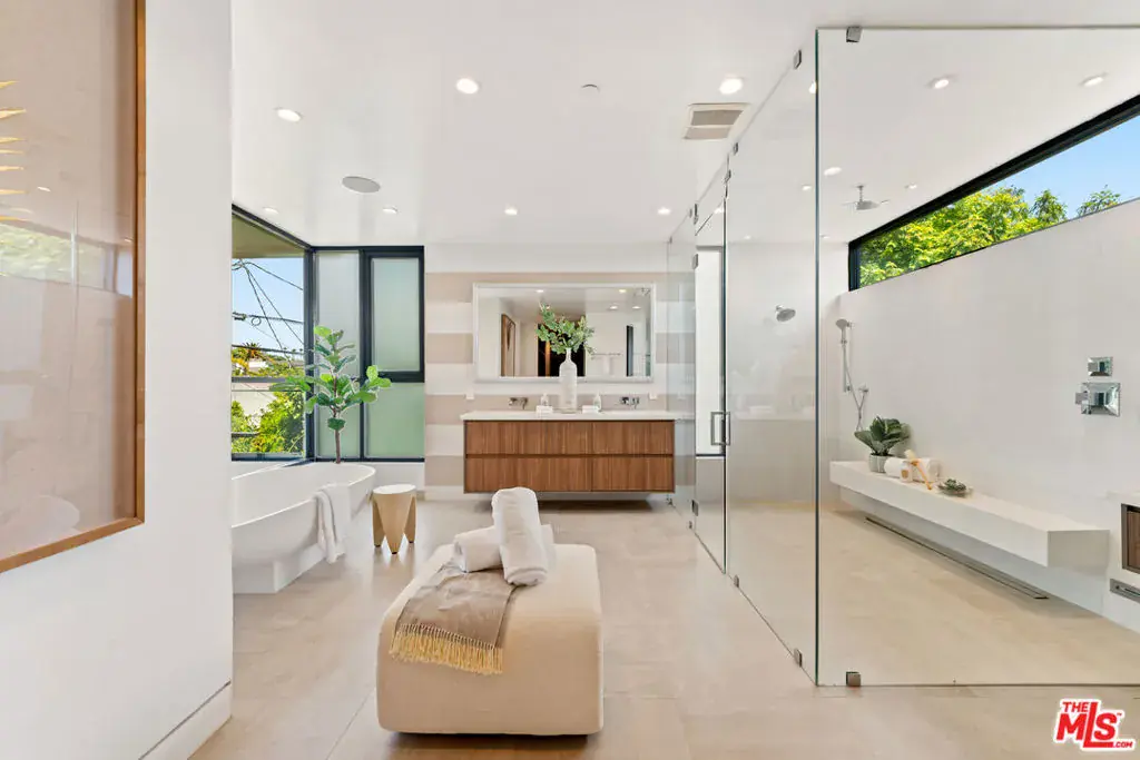 Introducing Zen: Where contemporary luxury, elevated design, and mindful living intersect in the heart of the vibrant Melrose Arts District. This striking architectural residence presents a private sanctuary of modern sophistication designed to elevate everyday living with resort-style amenities, serene interiors, and cutting-edge innovation with an emphasis on wellness and lifestyle. As you enter, you are greeted with soaring ceilings, expansive walls of glass, and gallery-like proportions bathed in natural light and a dramatic floating staircase which doubles as an art piece. Zen features 5-bedrooms and 6-bathrooms spanning across 5,200 sq. ft. of meticulously designed living space and offering an unmatched combination of high design, functionality, and tranquility in a modern contemporary style. An entertainer’s dream, the expansive open-concept living and dining areas are anchored by a dramatic fireplace and flow effortlessly into a gourmet chef’s kitchen outfitted with top of the line Wolf appliances, custom cabinetry, a spacious center island, and sleek stone countertops. Retractable glass doors disappear to reveal a seamless indoor-outdoor experience, leading to your private backyard oasis. With wellness and lifestyle at the forefront, Zen comes complete with a private gym, perfect for morning workouts or mindful movement and a set of resort-level amenities including a sparkling pool and spa for sun-soaked afternoons, a cold plunge and sauna for restoration and renewal, and multiple lounge areas surrounded by lush, thoughtfully landscaped greenery providing your own modern retreat in the middle of the city. The primary suite is a masterclass in luxury and serenity, featuring a spacious layout, private balcony, spa-like bath, a free standing soaking tub and walk-in rain shower, and a spacious boutique-style closet. Each of the additional en-suite bedrooms offers ample space, designer finishes, and the same sense of understated luxury as seen throughout the property. At the crown of the estate is an expansive rooftop deck featuring panoramic, unobstructed 360 degree views that stretch from Downtown Los Angeles to the iconic Hollywood Hills and includes a built in rooftop grill and bar and a fire pit presenting an extraordinary setting for sunset cocktails or starlit dinners. For those who appreciate intelligent living, the home is fully integrated with a state-of-the-art Control4 smart home system, allowing you to manage lighting, climate, sound, and security with ease from anywhere. Enjoy rich audio throughout with built-in speakers in every major room, perfect for ambient music, entertaining, or immersive media experiences. The property is also equipped with a comprehensive security system, including strategically placed cameras and remote access, offering both peace of mind and privacy. Located in the vibrant Melrose District, you’re just moments from some of Los Angeles’ most acclaimed shopping, dining, and entertainment yet the home’s privacy and peaceful atmosphere make it feel like a world of its own. This is not just a residence, it’s a lifestyle. Welcome to Zen.