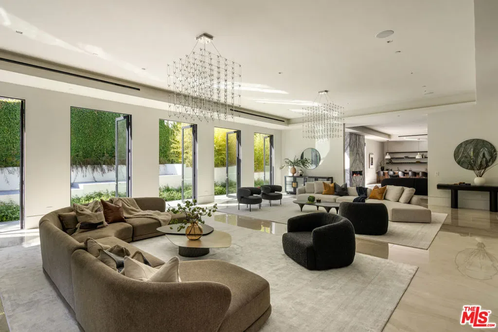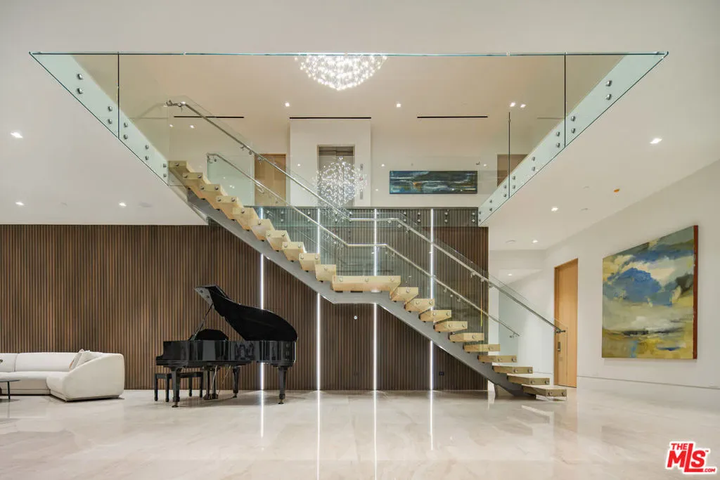 Commanding a private 2.5-acre setting within Crestwood Hills, this newly constructed estate is defined by its scale, architectural clarity, and uncompromising sense of privacy. Concealed behind gates and its own guard house, the property offers a level of seclusion rarely found in Brentwood. A striking double-height arrival sets the tone, where floating staircases, gallery-like volumes, and meticulously selected stone and wood finishes create a refined, modern palette. Light moves effortlessly through the interiors, illuminating expansive living spaces anchored by sculptural fireplaces and walls of glass that dissolve the boundary between indoors and out. The residence is designed with the intention of balancing grand entertaining with quiet retreat. Formal and informal living areas unfold seamlessly, complemented by a private office, a cinema-quality media room, and dining spaces that feel both intimate and architectural. At its center, a statement kitchen pairs bold materiality with precision, featuring Miele appliances and a substantial island designed for both function and presence. Nine en-suite bedrooms are thoughtfully distributed, culminating in a primary suite of significant scale, offering dual baths, expansive dressing rooms, and a private lounge environment. The grounds are equally considered with layered landscaping, open lawns, and curated outdoor spaces that frame a pool and sport court, creating a resort-like setting without sacrificing discretion. A separate 2-bedroom guest house oasis sits at the bottom of the property. A multiple-car garage and parking for 15+ vehicles completes the estate, accommodating a collection with ease. A property of rare composition where architecture, privacy, and scale converge in one of Brentwood’s most coveted hillside enclaves.