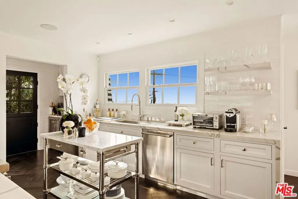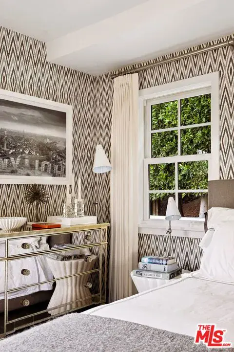A truly rare offering, this meticulously renovated jewel box is set on one of the most coveted blocks in the Hollywood Hills. Showcasing ocean and Catalina views, elevated privacy, and sophisticated designer finishes throughout. A move-in-ready retreat just moments from the iconic Chateau Marmont. An open and airy living room, anchored by a statement fireplace, flows into a dining area and beautifully composed kitchen, all framed by inspiring vistas. Custom inset cabinetry, a Carrara marble island with polished nickel shelving and dedicated beverage station with wine refrigerator establish a refined aesthetic. Indoor and outdoor living blend seamlessly across both levels of the home. Terraces create multiple settings for entertaining, featuring a built-in BBQ, custom stainless steel hydrotherapy tub by Diamond Spas with fountain feature, deck seating, and outdoor television..ideal for both relaxed evenings and elegant gatherings. A serene guest suite on the first floor is accented by Ralph Lauren lighting and Martin Lawrence Bullard wallpaper includes an en-suite bath with a deep soaking tub and Restoration Hardware vanity. French doors open directly to the spa terrace, offering a tranquil, resort-like experience. A second bedroom, currently styled as a den is thoughtfully detailed with library sconces and Phillip Jefferies wallpaper. It connects to a Jack-and-Jill bath finished in Carrara marble and polished nickel, elevated by Donald Robertson’s iconic Sunset Tower wallpaper. The entire upper level is dedicated to the primary suite; an inviting sanctuary defined by dramatic cathedral ceilings, Murano glass chandelier, and Phillip Jeffries wall coverings. Southern exposure fills the space with natural light, while a generous walk-in closet and spa-inspired en-suite bath complete the experience. The bath features dual vanities, a freestanding soaking tub, and basketweave marble floors. A private terrace with outdoor wet bar, dining table and fire pit enjoys picturesque views from downtown to the ocean. A carefully curated residence that offers privacy, design, and effortless luxury…this is Hollywood Hills living at its best. A spotless two car garage with extra storage completes the picture. All outdoor furniture is included with sale.