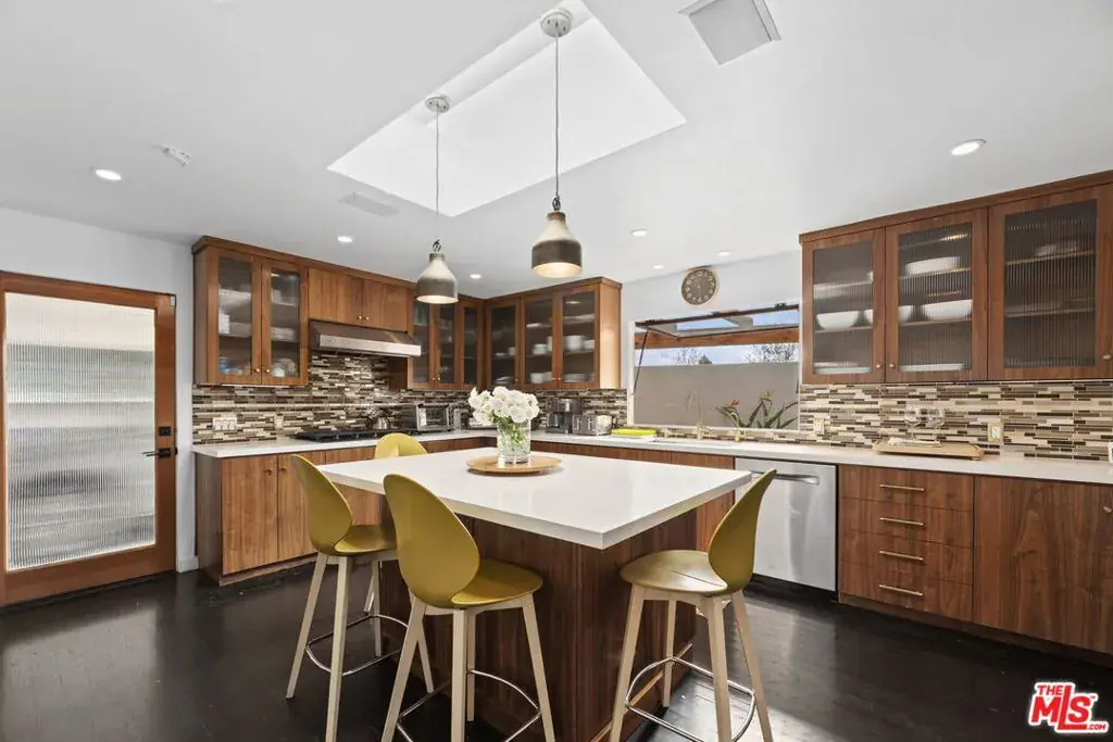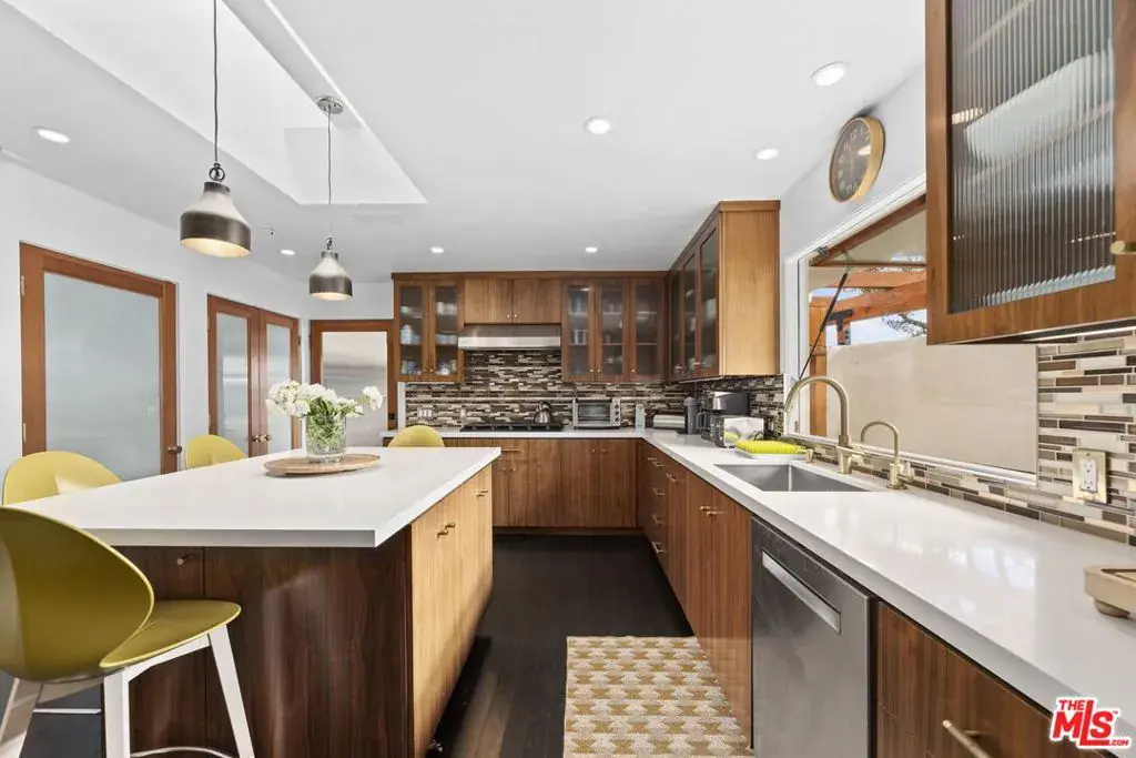 Discreetly nestled on a quiet cul-de-sac in the storied embrace of the Hollywood Hills, this luxurious Mid-Century residence offers a refined retreat where glamour meets serenity and privacy. As you enter through the elegant 12′ formal entry, the main living spaces unfold in an open-plan flow with an artful interplay of natural light and shadow that shifts with the hours, illuminating exquisite details such as polished dark hardwood floors. The chef’s kitchen, outfitted with top of the line stainless-steel appliances will be the envy of any chef. Luxurious bedrooms provide tranquil sanctuaries, including the primary suite overlooking the pool and a sumptuous bathroom boasting a soaking tub, separate sinks and walk-in steam shower opening to the backyard. The custom wardrobes are designed to cradle couture and keepsakes alike. Outside, the verdantly landscaped private yard is your own private oasis and continues with swaying palms and resort-style living providing year-round privacy and a sense of cinematic seclusion. Enjoy the private pool, firepit, lounging areas and grass area. Throughout the bespoke residence, there is custom chosen artwork, custom lighting and security cameras. 2 car garage with storage and parking for up to 10 cars. This is a rare residence that embodies the spirit of Hollywood luxury: a sanctuary where the art of living well meets the privacy and serenity of feeling like you are completely away from the city, offering a rare lease opportunity to reside in one of Los Angeles’s most coveted enclaves. Also available unfurnished at $18,500 per month. Owner prefers a 1 year minimum but will consider 3 months plus. Will also consider a lease option/sale.