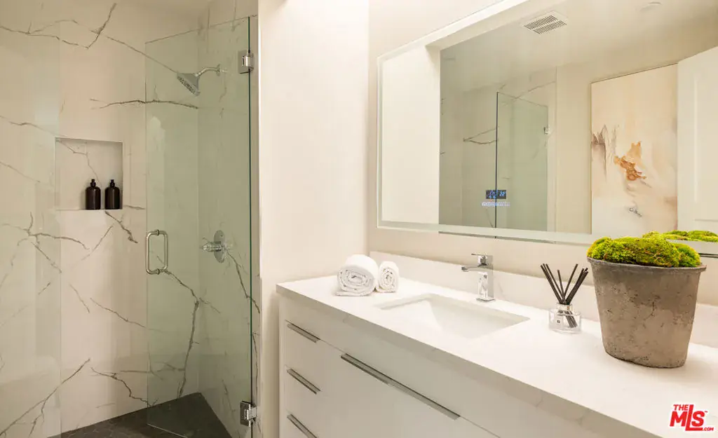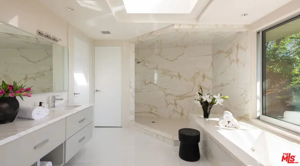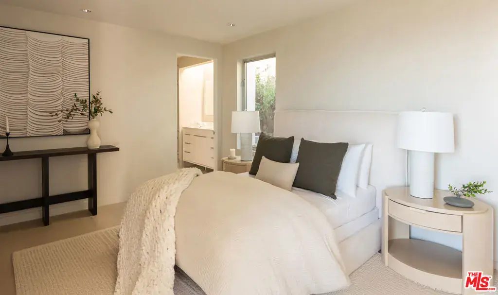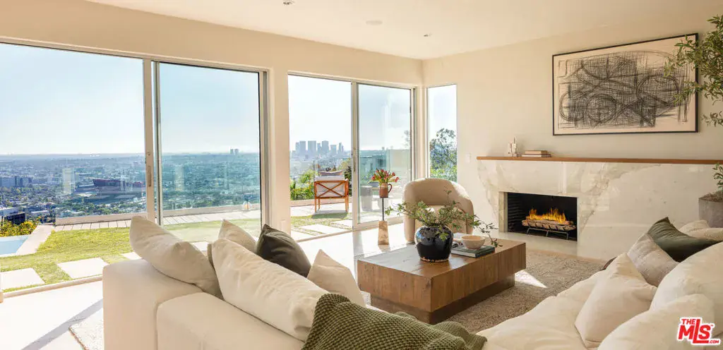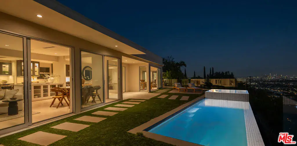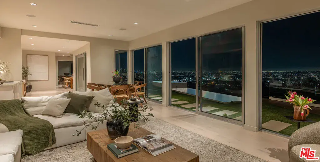 Minutes above the Sunset Strip on a coveted cul-de-sac, this newly reimagined mid-century residence commands uninterrupted sightlines that sweep from the Downtown skyline across Century City and onward to the Pacific. Conceived as a seamless single-level experience, the home unfolds with an effortless flow, where walls of floor-to-ceiling glass frame the horizon while opening directly to a flat grassy yard, infinity-edge pool, and spa set against panoramic LA views.An impactful entry introduces light-filled interiors where living, dining, and kitchen spaces align naturally for both everyday living and entertaining, with wide-plank oak floors throughout the open environment. The chef’s kitchen is equipped with Viking appliances, custom cabinetry, and a tailored eat-in breakfast bar, maintaining a constant visual connection to the outdoors.The primary suite functions as a true retreat, anchored by a fireplace and private sitting lounge, positioned to capture sweeping views over Century City. Floor-to-ceiling glass doors open to a wraparound terrace, extending the bedroom into the landscape and offering a front-row vantage point to sunrise and sunset. The ensuite bath is thoughtfully composed with an oversized shower and a generous walk-in closet, while two additional bedroom suites provide ample space for guests, and a flexible bonus room adapts easily as a home office, gym, or studio.Expansive patios surround the home, offering multiple settings for dining, lounging, and entertaining as the city transitions from day to night. A two-car garage with additional driveway parking ensures convenience. More than a residence, this is a jetliner view property and an architectural statement in the Hollywood Hills where scale, light, and horizon converge in one of Los Angeles’ most iconic settings.