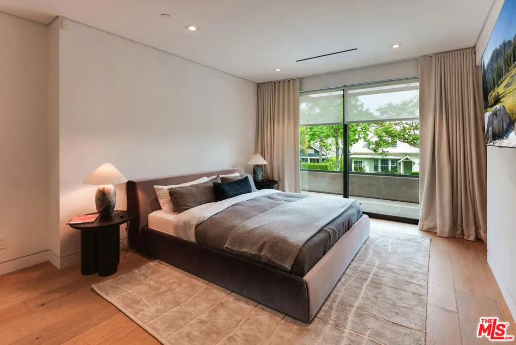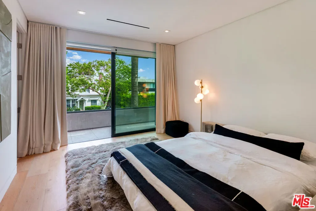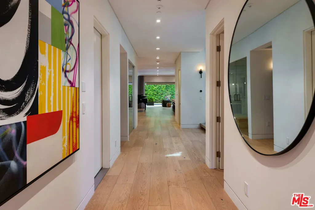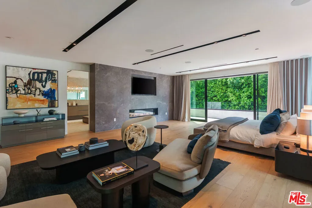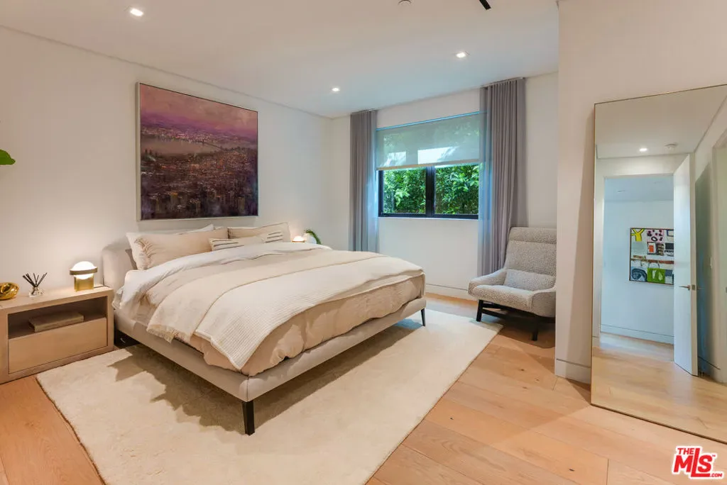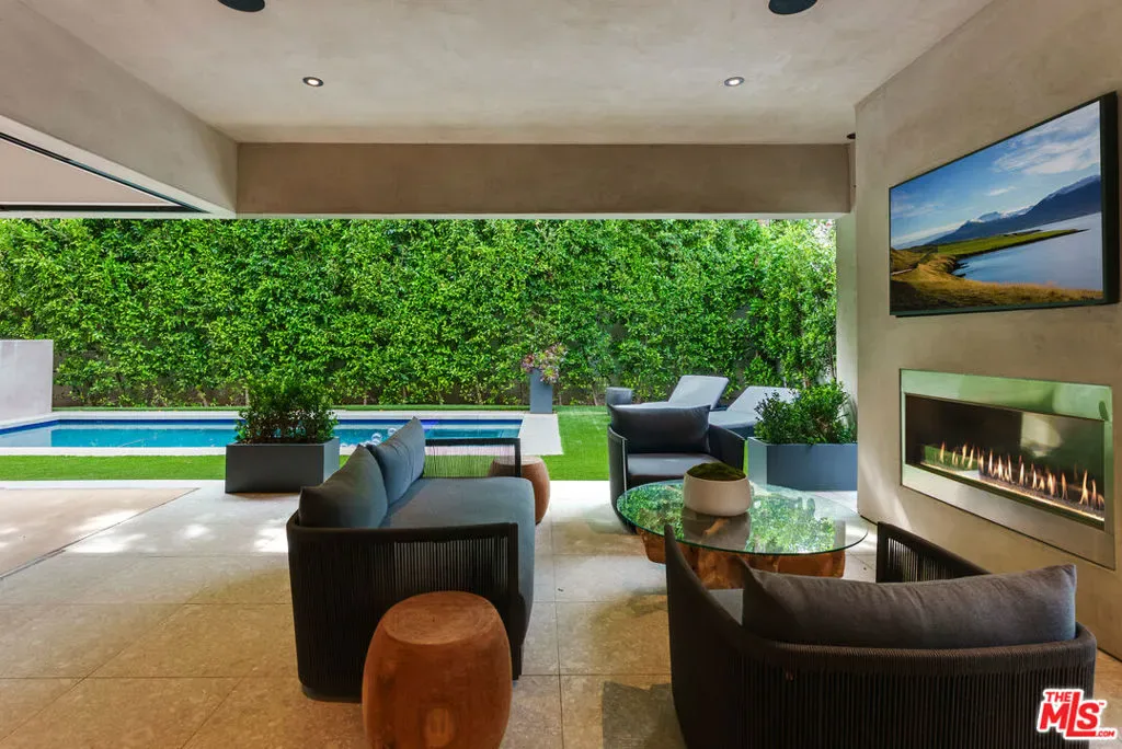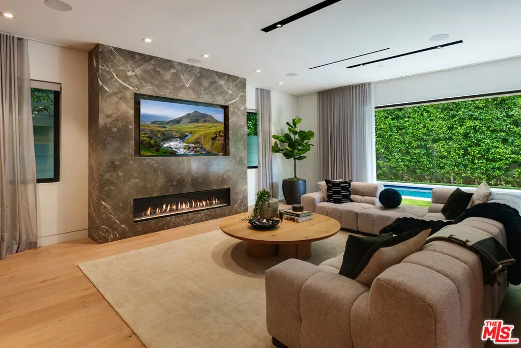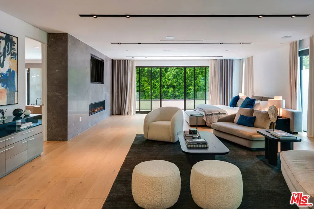 A standout offering in one of LA’s most coveted neighborhoods, this exceptional residence showcases elevated craftsmanship, striking architectural detail, and an expansive rooftop retreat with sweeping 360-degree city views. Designed to rival the area’s finest new builds, the home opens with a dramatic walnut pivot entry into a light-filled floor plan tailored for seamless indoor-outdoor living. The main level is thoughtfully curated for both everyday living and entertaining, featuring a wine room, a bonus room (theater/exercise/recording studio), formal dining space with wet bar, and a custom Italian kitchen outfitted with premium finishes. Designer stone and tile, European oak floors, Fleetwood walls of glass, and multiple fireplaces all frame views of the illuminated pool, creating a true resort-style ambiance. A sculptural floating staircase leads to four generous en-suite bedrooms, including a sophisticated primary suite with a lounge area, dual custom LED-lit walk-in closets, a private terrace, and a striking stone fireplace. Additional highlights include a gated circular motor court, advanced smart home integration with top-tier media and security systems, and dual-zone climate control. The rooftop level, complete with its own powder room, is designed for elevated entertaining against a panoramic city backdrop. Originally designed by internationally acclaimed Chimera Interiors and set on a celebrity-favored block, this home offers a rare blend of privacy, scale, and design in the heart of Beverly Grove.