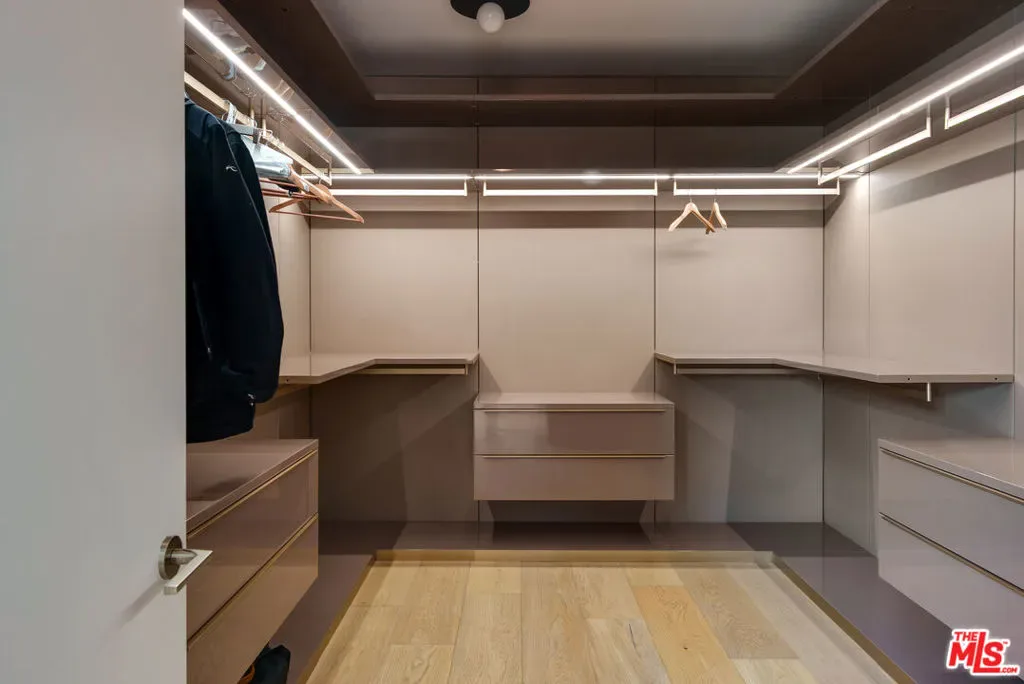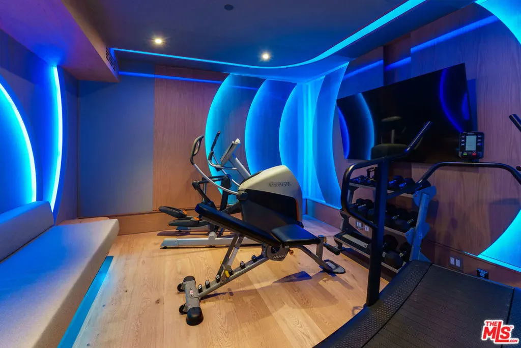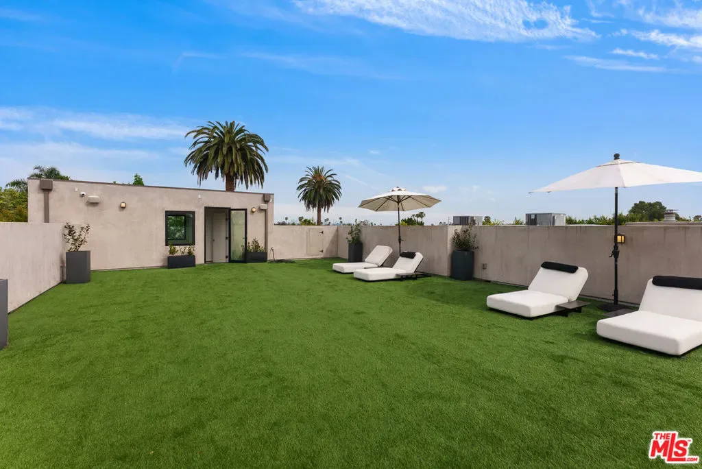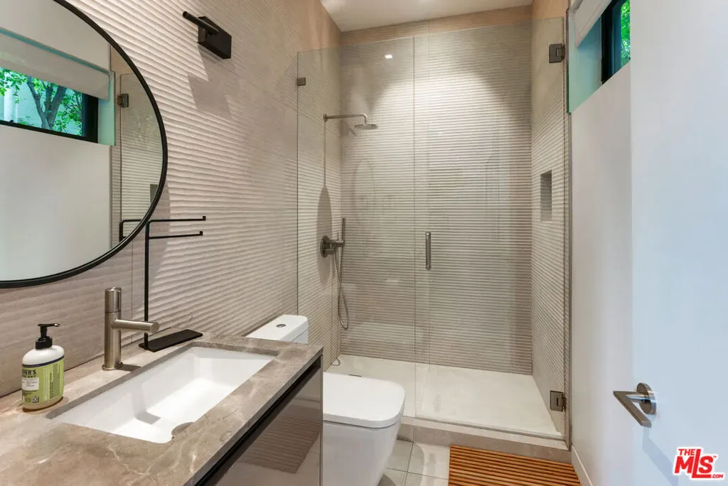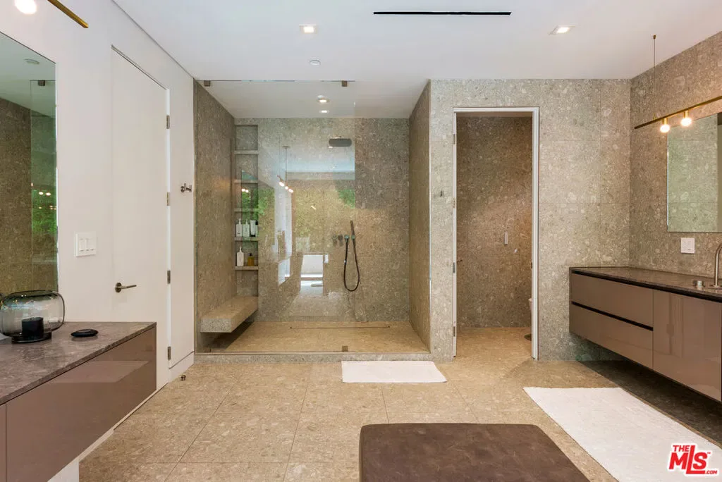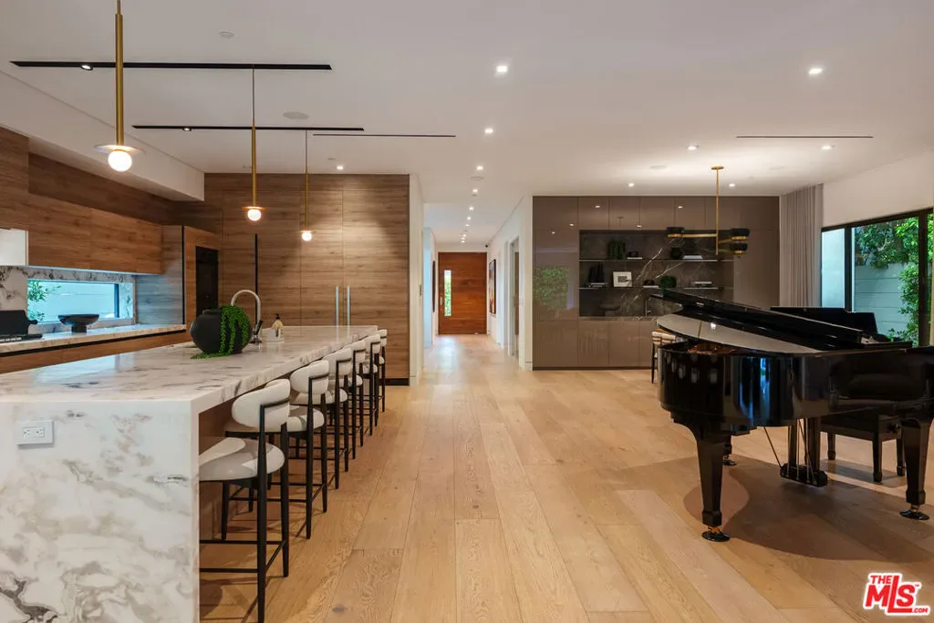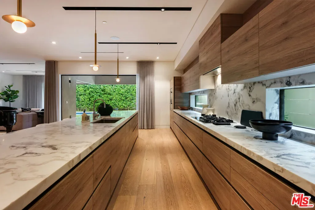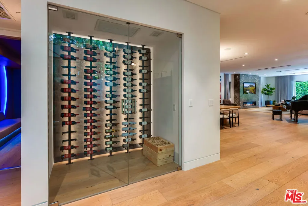 A standout offering in one of LA’s most coveted neighborhoods, this exceptional residence showcases elevated craftsmanship, striking architectural detail, and an expansive rooftop retreat with sweeping 360-degree city views. Designed to rival the area’s finest new builds, the home opens with a dramatic walnut pivot entry into a light-filled floor plan tailored for seamless indoor-outdoor living. The main level is thoughtfully curated for both everyday living and entertaining, featuring a wine room, a bonus room (theater/exercise/recording studio), formal dining space with wet bar, and a custom Italian kitchen outfitted with premium finishes. Designer stone and tile, European oak floors, Fleetwood walls of glass, and multiple fireplaces all frame views of the illuminated pool, creating a true resort-style ambiance. A sculptural floating staircase leads to four generous en-suite bedrooms, including a sophisticated primary suite with a lounge area, dual custom LED-lit walk-in closets, a private terrace, and a striking stone fireplace. Additional highlights include a gated circular motor court, advanced smart home integration with top-tier media and security systems, and dual-zone climate control. The rooftop level, complete with its own powder room, is designed for elevated entertaining against a panoramic city backdrop. Originally designed by internationally acclaimed Chimera Interiors and set on a celebrity-favored block, this home offers a rare blend of privacy, scale, and design in the heart of Beverly Grove.