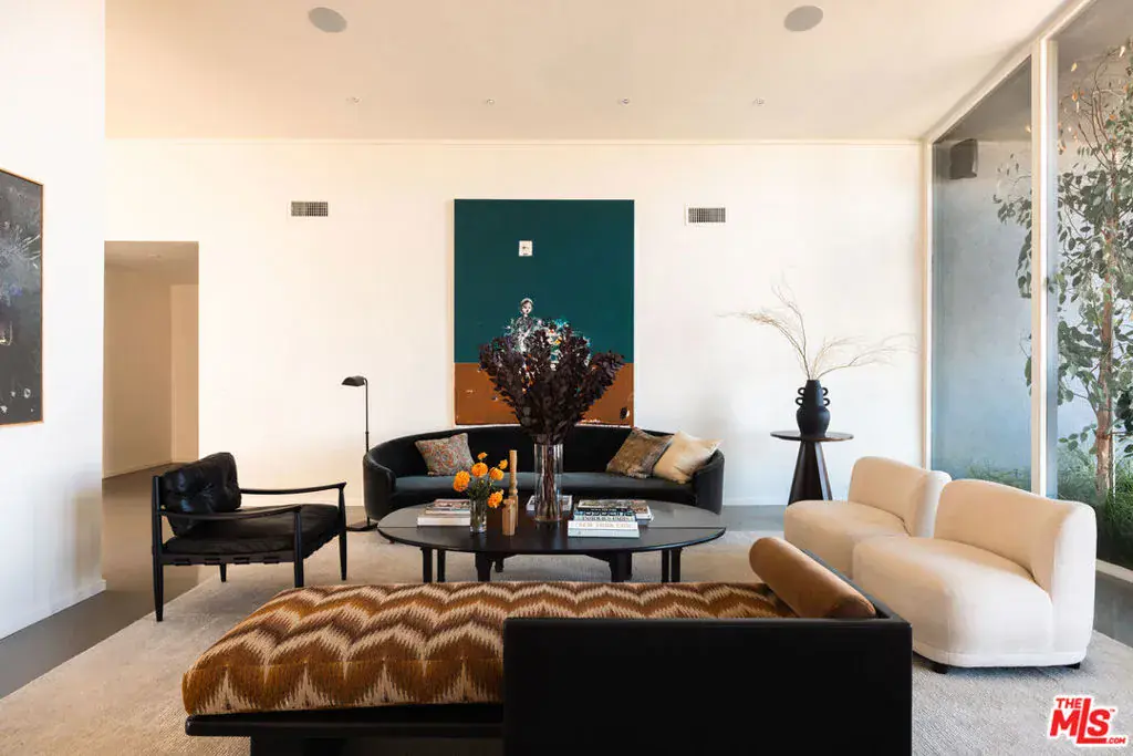 Tucked in an exclusive pocket of the Hollywood Hills, this dramatic mid-century has been completely transformed into a private, design-forward retreat with show-stopping panoramic views. Beyond the gated courtyard, where fountains and mature trees set a serene stage, you’ll find interiors that strike the perfect balance of drama and warmth. Sky-high vaulted ceilings, a massive wood-burning fireplace, and walls of glass frame the pool and city views beyond, flooding the home with natural light. The chef’s kitchen with custom oak cabinetry and oversized island blends seamlessly with the dining, living, and outdoor spaces, creating a natural flow for both intimate evenings and grand indoor/outdoor entertaining. The primary suite is a true escape with endless views, a boutique-style closet with island, an Italian travertine bath and sitting area overlooking the pool. Three additional oversized bedrooms each open to a private patio shaded by 100-year-old olive trees. The grounds are an oasis: pool, dining terrace, and reflecting pond designed for maximizing the outdoor living experience. Situated in the coveted Wonderland School District, this home pairs architectural pedigree with effortless California living. A must-see for those seeking privacy, design, and world-class views.