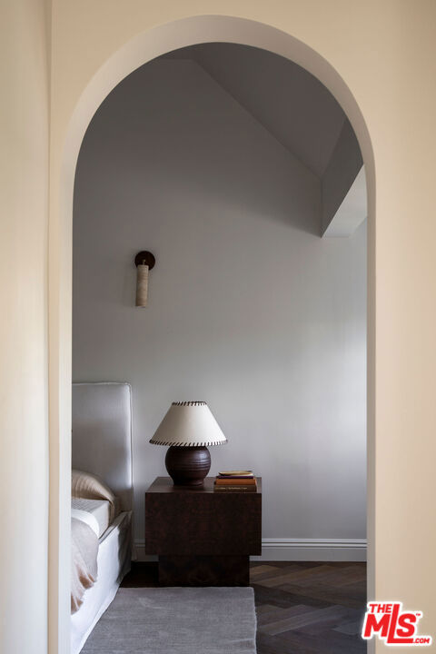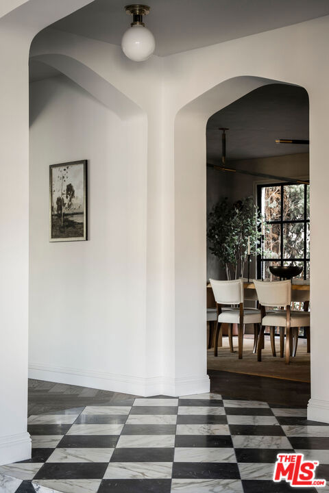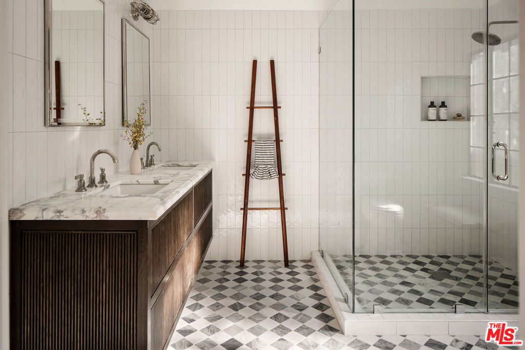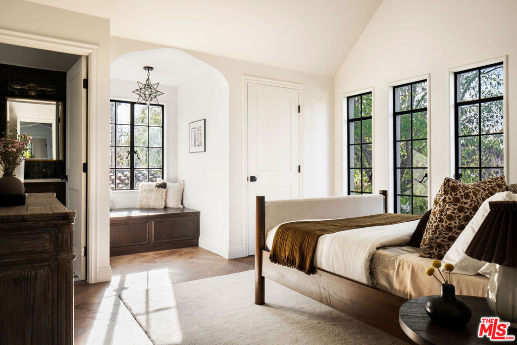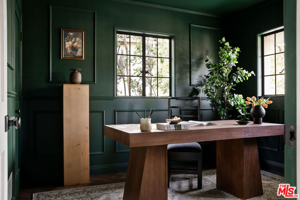 Set on a quiet promontory in the heart of the coveted Brookside neighborhood, this historic Tudor residence is gracefully set back from the street, framed by two lush grassy knolls that create a grand and private arrival. The entryway welcomes you with classic black-and-white checkered tile, evoking the home’s rich architectural heritage and original year of construction. Beyond, an oversized step-down family room showcases preserved original ceiling details and is bathed in natural light, with French doors that open seamlessly to an outdoor dining terrace, perfect for indoor-outdoor living. A front-facing private office is richly appointed in Portola Green, featuring intricate moldings that lend both character and sophistication. The formal dining room is generously scaled yet intimate, finished in Portola Roman Clay and designed to comfortably host large gatherings. The family room lounge offers expansive backyard-facing windows that flood the space with light, complemented by a custom bar ideal for entertaining. The kitchen is both dramatic and functional, featuring vaulted ceilings, Viking appliances, Calacatta Gold honed countertops and backsplash, a walk-in pantry, a custom buffet bar, and a built-in breakfast bench for informal dining. Upstairs, four spacious bedrooms each feature en-suite bathrooms. The primary suite is a true retreat, highlighted by a Viola marble clad fireplace and a private balcony overlooking the backyard. An oversized walk-in closet with custom built-ins and a spa-like primary bath with dual vanities, a soaking tub, and an oversized shower complete the suite. The beautifully hedged and fully privatized backyard benefits from the home’s corner-lot position, offering optimal sun exposure throughout the day. This exceptional residence is a rare offering in one of Los Angeles’ most sought after neighborhood, where historic charm meets refined modern living.