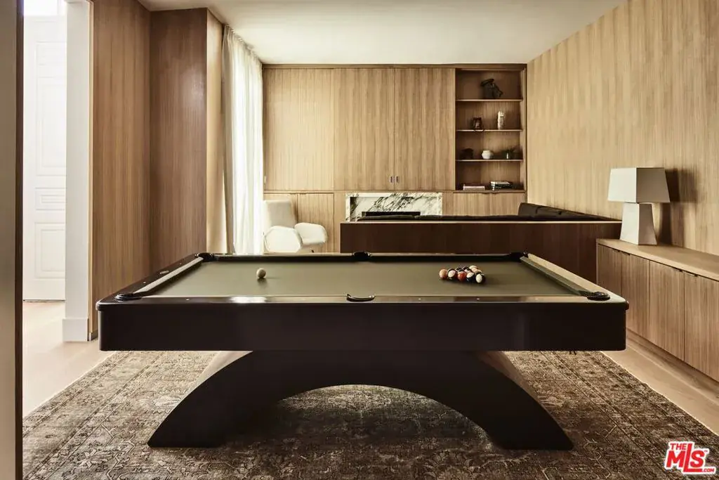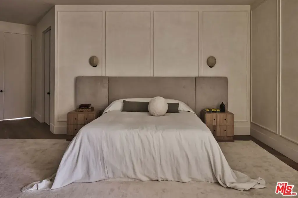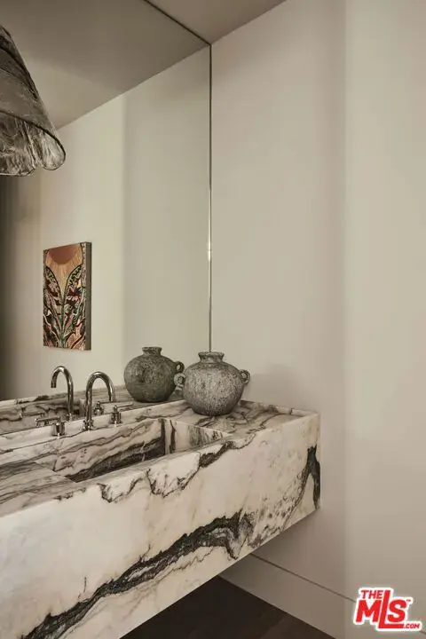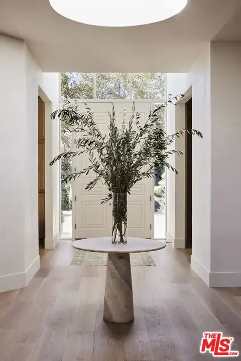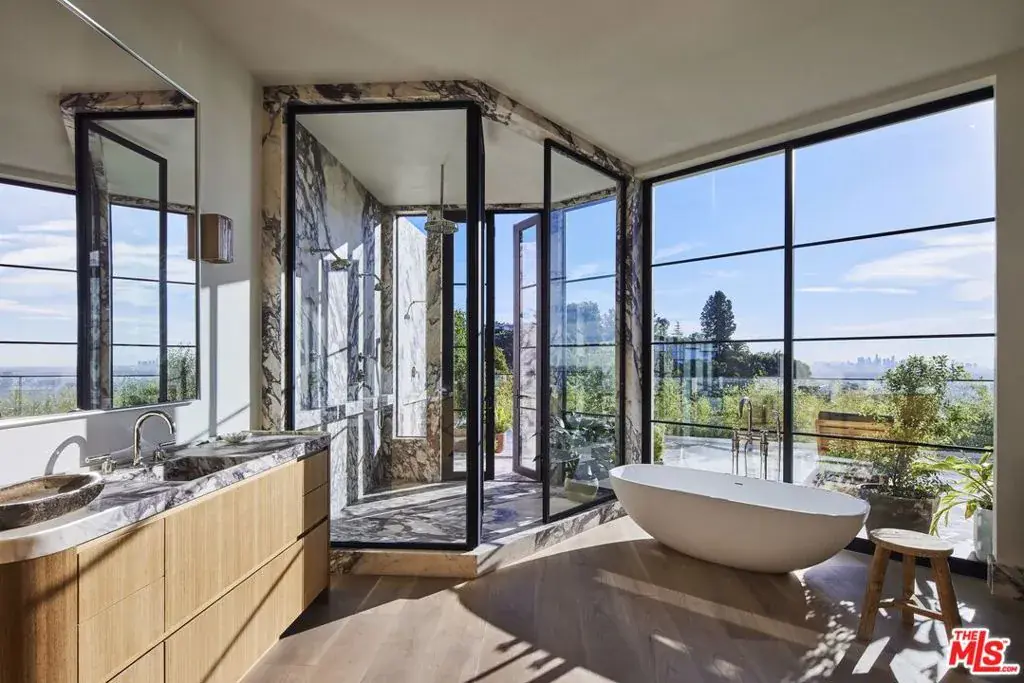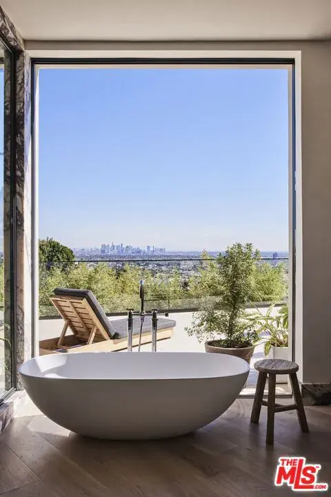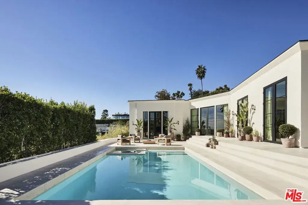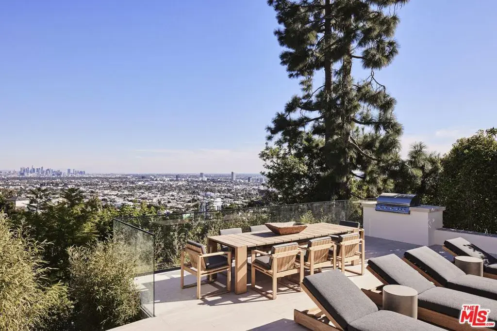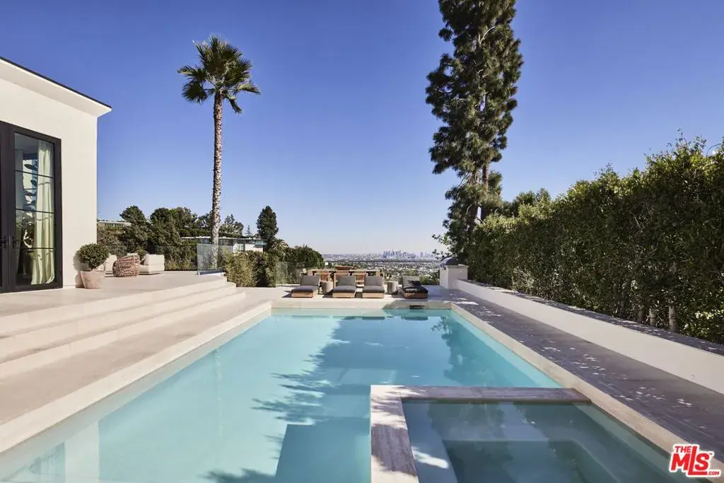 OSKLO has reimagined this Hollywood Regency Villa, tucked behind grand gates and a motor court at the end of an exclusive cul-de-sac. A remarkable surprise awaits: a single-level masterpiece perched on an approximately 2/3-acre view promontory. Recently completed after a multiyear renovation, this home boasts soaring ceilings, an open floor plan, and expansive public spaces that seamlessly transition to broad terraces and a generous pool. Revel in breathtaking views stretching from Downtown to the Pacific Ocean. The glamorous living room features a hidden white marble bar, while the gourmet kitchen is a true standout. The impressive dining room, complete with a fireplace, sets the stage for grand entertaining. A richly paneled library and billiard room enhance the home’s allure. The primary suite is exceptional, with Calacatta Viola marble flowing from the indoor shower to the outdoor areas. Three additional guest rooms further distinguish this extraordinary residence, which is shown exclusively to prequalified lessees.