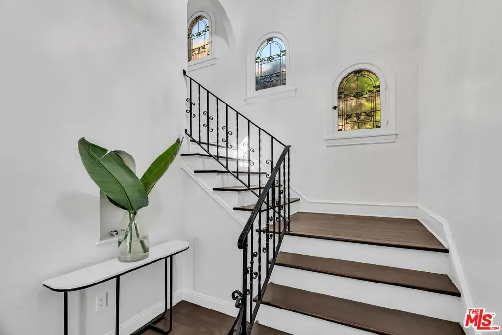 1925 Mediterranean Masterpiece in Windsor Village HPOZ. Experience timeless elegance in this 1925 Mediterranean treasure, ideally situated on a quiet street just one block from Harold Henry Park in the esteemed Windsor Village Historic Preservation Overlay Zone. A designated contributor, this 3,800-square-foot residence blends historic character with modern luxury, featuring exquisite lighting fixtures and recessed lighting throughout. The open kitchen boasts Bosch and LG appliances, double sinks, and custom cabinetry, flowing seamlessly into a bright family room with French doors that open to the lush backyard. Elegant Carrara marble baths and abundant natural light accentuate the home’s refined style. The primary suite includes a remarkable walk-in closet, a sitting area, and dual French doors leading to a spacious Saltillo-tiled balcony. At the same time, original stained-glass windows adorn the staircase. A Batchelder fireplace anchors the living room, complemented by custom drapes and window treatments. The laundry room offers oversized LG washer and dryer machines. Outdoors, the private yard is designed for entertaining, with covered patios, a BBQ area, and a sparkling pool and spa. The wonderful guest house (converted garage ADU) provides additional space for guests or creative use. Gated off-street parking and mature privacy hedging complete the property. With four bedrooms, a den/office, and four baths on an 8,500+ square-foot lot, this exceptional home offers the perfect balance of elegance, comfort, and contemporary living in one of Los Angeles’s most beloved historic neighborhoods. The home also includes an earthquake-bolted foundation and dual HVAC system for comfort and security. Don’t miss this amazing opportunity.