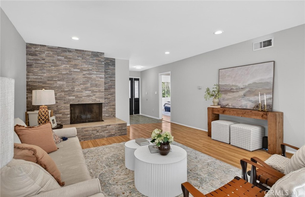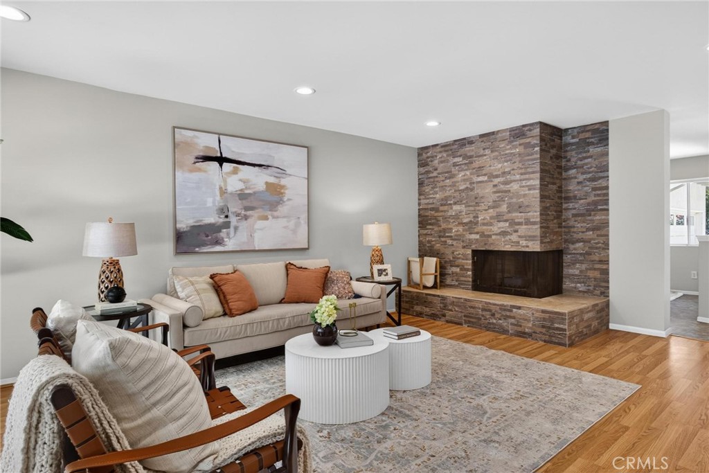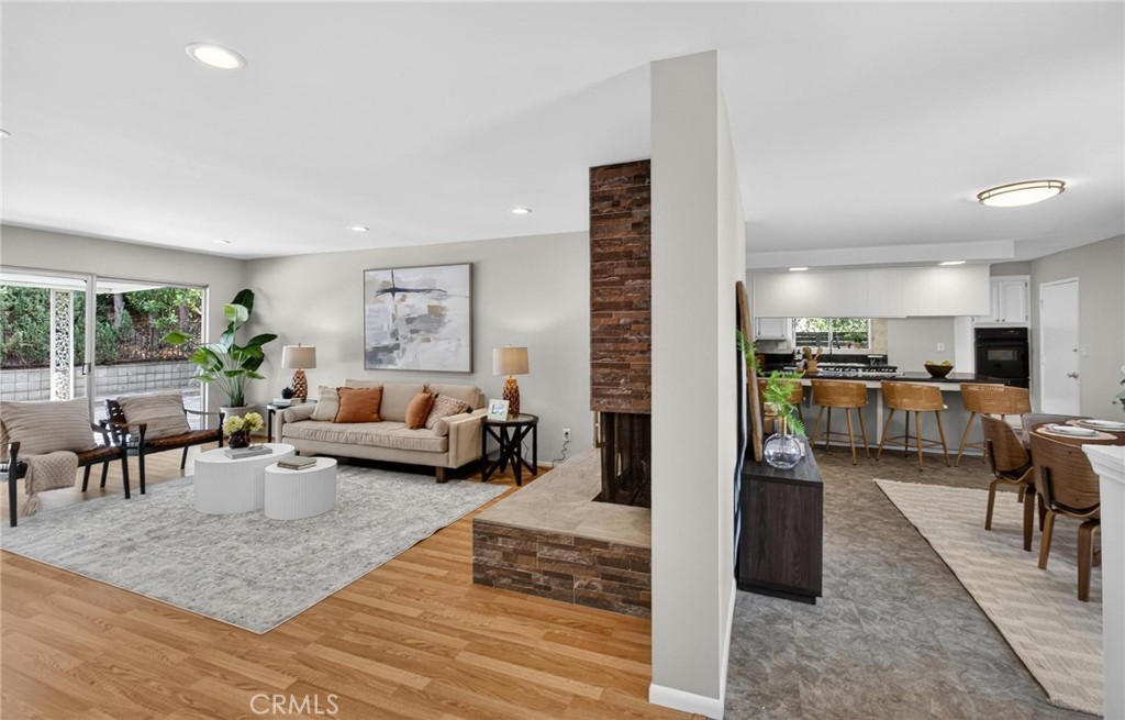 Step inside to a bright and functional floor plan highlighted by hardwood flooring, recessed lighting, and expansive windows that fill the home with natural light. The spacious living room features a statement fireplace and flows seamlessly into the dining area, creating an ideal setting for both everyday living and entertaining.