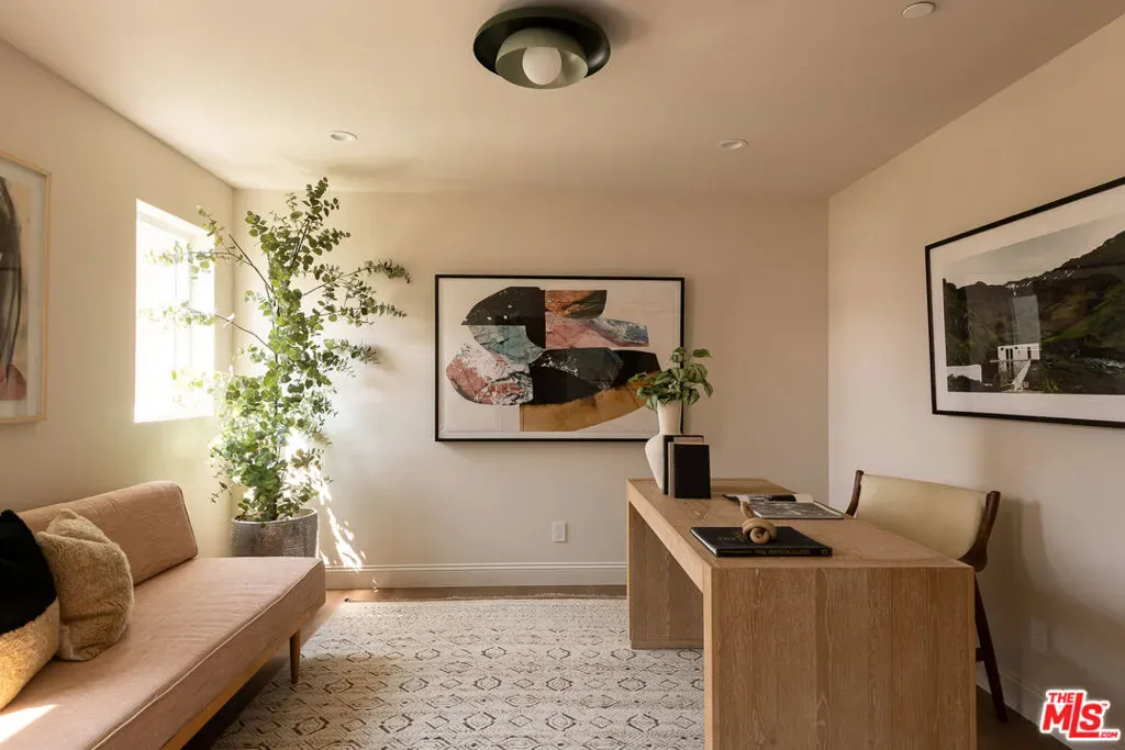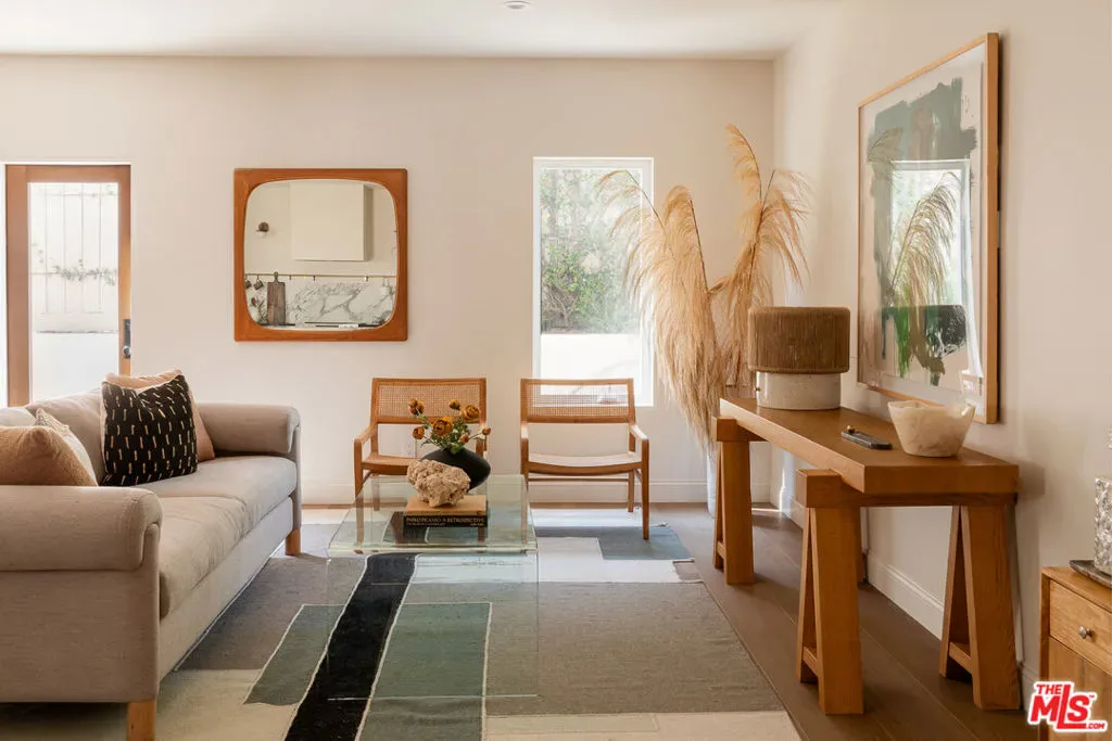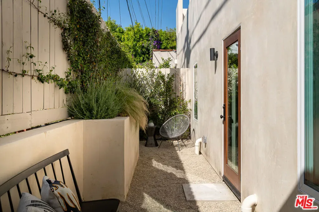 This newly constructed 3-bed, 3-bath Spanish-style residence by Cassa Design Studio blends timeless architectural character with a refined, design-driven vision in the heart of Mid-Wilshire. Light-filled interiors offer an effortless flow, with the main level anchored by a designer kitchen ideal for entertaining. Dark granite countertops, a striking Arabescato porcelain backsplash, brass pot rail detailing, and a custom Portola Roman clay range hood introduce depth and texture, while a built-in dining nook adds both function and thoughtful design. The private outdoor patio extends directly from the living and dining areas, creating a seamless indoor-outdoor connection ideal for everyday living and entertaining, all set against lush, Mediterranean-inspired landscaping. A moody green Roman clay powder room adds a rich, design-forward moment on the main level. Upstairs, three generously sized bedrooms offer comfort and privacy, including a spacious primary suite with a customizable walk-in closet and a private balcony finished with zellige-inspired terracotta tile. The primary bath is designed with intention, featuring a double vanity and an oversized walk-in shower with black penny marble flooring and refined Arabescato porcelain surfaces. A full third bath is equally considered, incorporating sage green zellige-inspired tile and classic Spanish flooring. Curated brass fixtures and statement lighting bring warmth throughout. Additional features include HVAC, hardwood flooring, a full laundry room, Integrated A/V wiring (Cat6), paid off solar panels, Ring doorbell, and Nest thermostat. The property is gated and secured, with dedicated parking and an EV charging outlet. Situated in a highly coveted neighborhood near Museum Row and the upcoming Purple Line, and just around the corner from Lassens, Republique, All Season Brewing Company, Met Her At A Bar, LACMA, and Hancock Park, this residence offers a refined blend of design, comfort, and modern living.