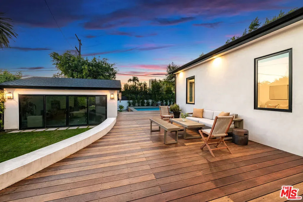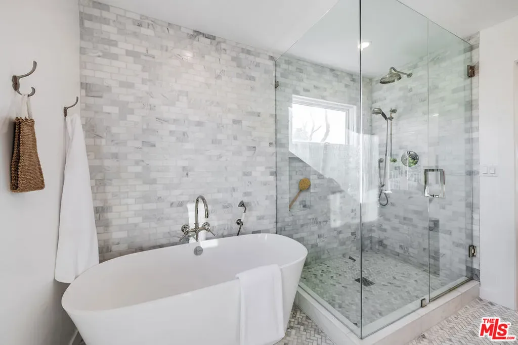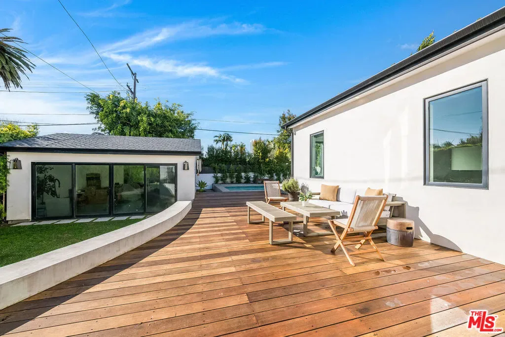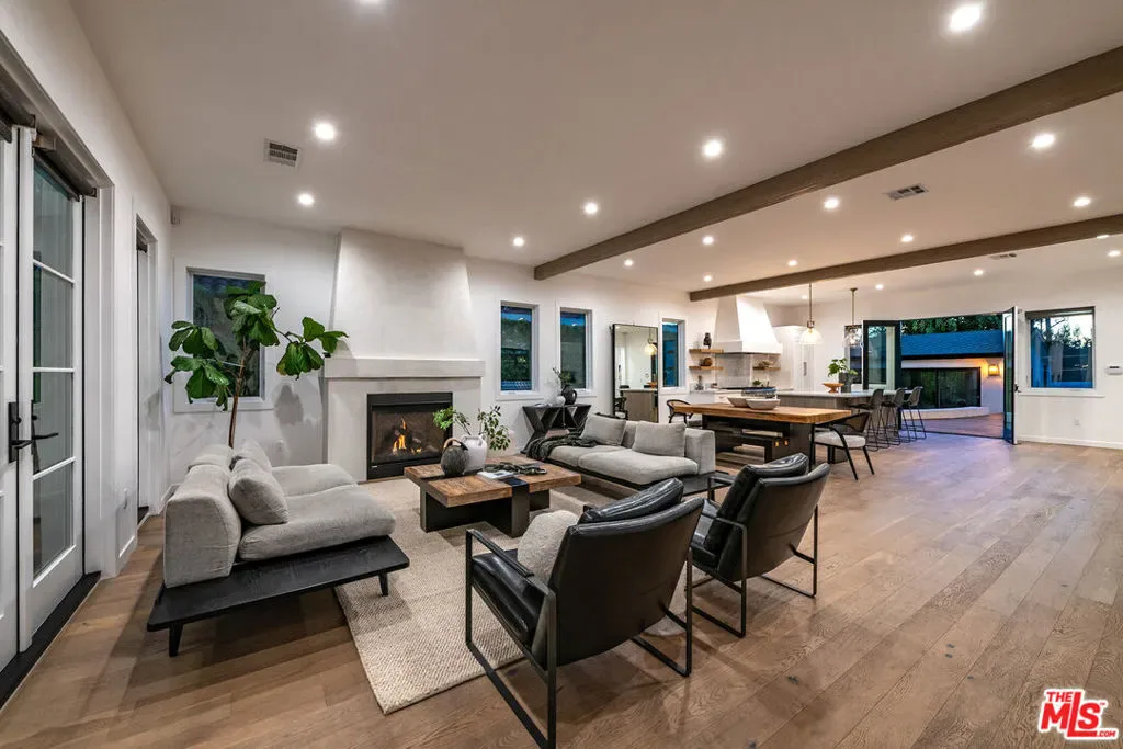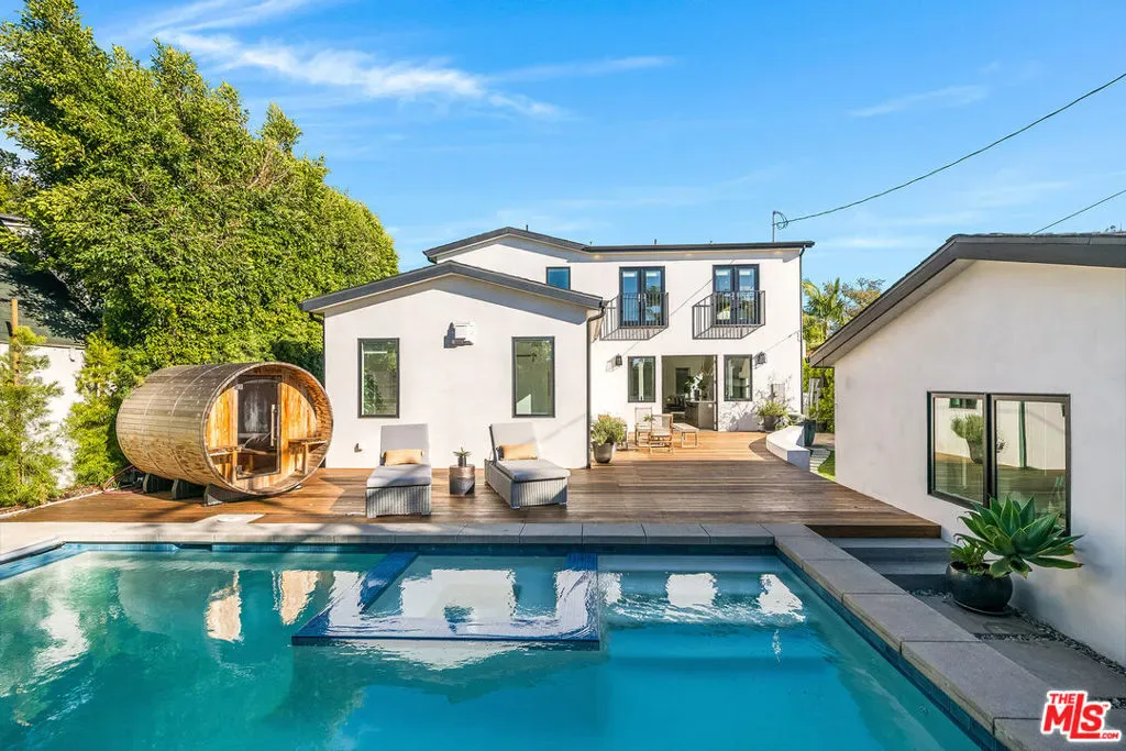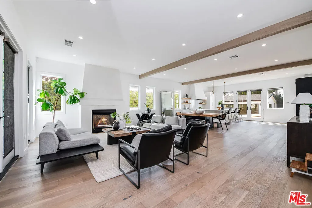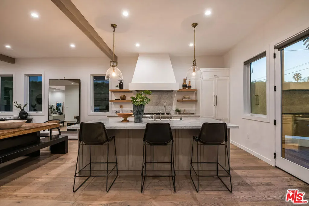 Epitomizing California’s relaxed luxury, this four-bedroom modern traditional home in white-hot Brookside, near Hancock Park, is filled with light, style, and sophisticated charm. The heart of the 3462+/-square-foot home is an open-concept living room, dining room, and kitchen with hardwood floors, exposed ceiling beams, large windows and glass doors, and a fireplace. Cooks will appreciate the kitchen’s elegant Carrara marble countertops and six-burner dual-oven Thermador range. The four bedrooms include a generous, airy, and bright master bedroom with two balconies and a versatile space perfect for a relaxing lounge. The six stylish baths have quartz counters and designer fixtures; the spa-inspired en suite master bath includes a soaking tub and a glass-enclosed shower. Multi-zone air conditioning and an alarm system are among the modern amenities. A deck encourages alfresco entertaining or soaking up the sun beside the alluring pool and spa. A two-car garage completes the picture.