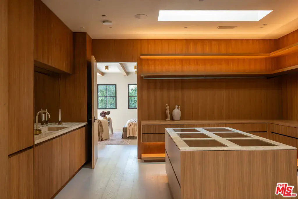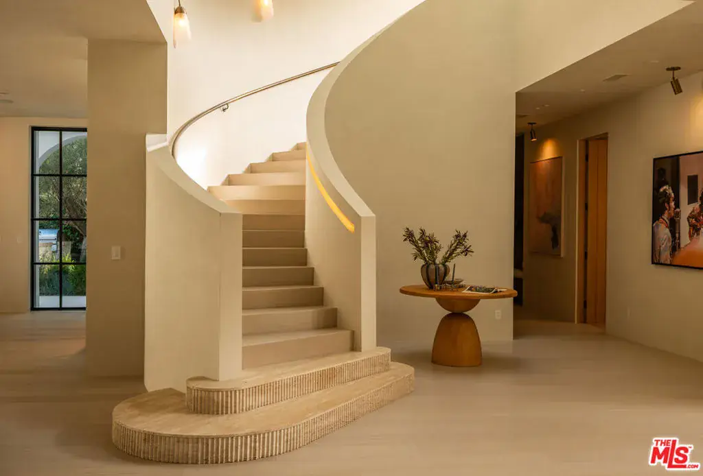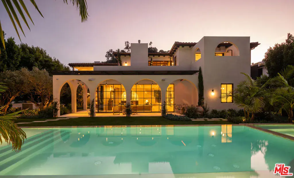 Architectural design in collaboration with Eran Gispan of Gispan Design. Positioned in the prestigious East Gate of the highly sought after lower Bel Air neighborhood near the iconic Hotel Bel-Air, this astonishing Spanish-Mediterranean estate seamlessly blends timeless elegance with modern sophistication. As you enter, double height glass & steel entry doors bathe the house with an abundance of natural light. Massive automated sliding door systems create the ultimate California lifestyle blurring the home’s resort style exteriors with organic toned interior spaces. Adorned in custom Walnut millwork the gourmet kitchen is equipped with built-in Miele and Wolf appliances only missing a Chef’s kiss. The entire home is complemented by select grade hardwood floors, handcrafted plaster walls, custom travertine stonework, and light fixtures by Apparatus and Allied Maker throughout.Featuring five luxurious bedrooms, an executive office, and a state-of-the-art theater, this home is designed for both elevated comfort and non-stop entertainment. Luxurious custom plumbing fixtures by Gessi and Graff add a spa-like touch to the primary bath, kitchen, bar & powder room. On the exterior you’ll find limestone balconies, hardscaping, and a limestone-clad ADU with a roof deck that accentuate the outdoor living experience. Copper gutters, custom steel and aluminum windows and doors, and lush landscaping including 125-year-old olive trees and thousands of plants create a private, serene retreat. A three-car garage completes the offering, making this property the epitome of luxury living in one of Los Angeles’ most coveted areas.