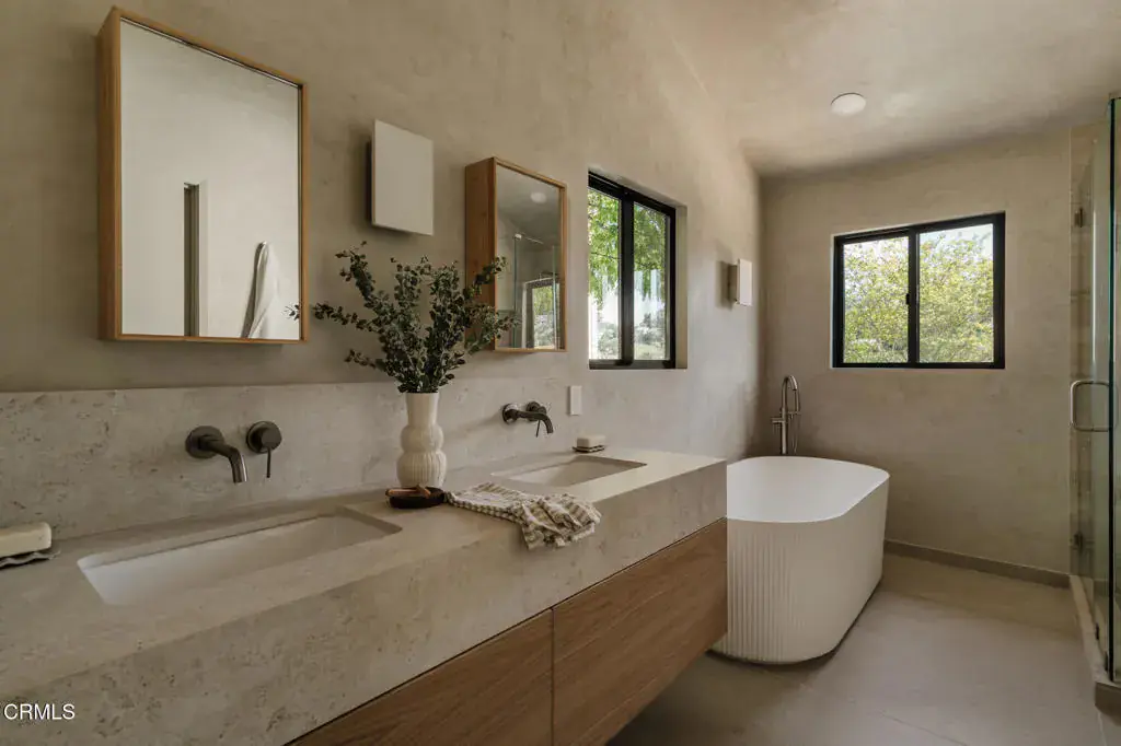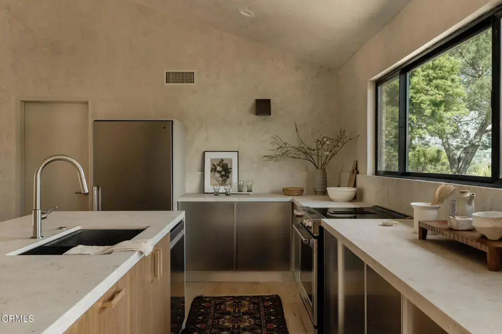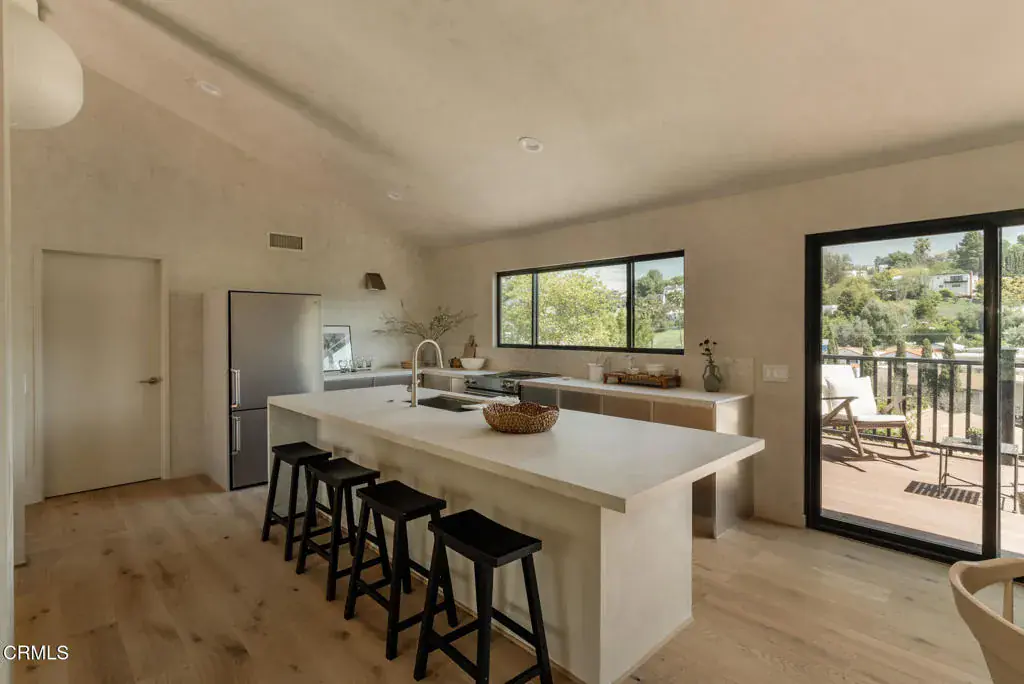 Back on Market! A complete renovation by OWIU Design, this Glassell Park home offers the rare opportunity to own a move-in-ready residence with high-end finishes and functional design throughout. Set on a 9,581 sq ft R2-zoned lot, the 1,782 sq ft interior has been fully rebuilt and reconfigured to maximize space, light, and livability. Vaulted ceilings and large picture windows throughout the home offer sweeping views of the surrounding hills. The layout includes three bedrooms–two with custom built-in closets, and a primary suite with a generous walk-in closet. The designer-centric kitchen features new high end appliances, quartz countertops and stainless steel cabinetry from Reform’s Jean Nouvel Reflect series. It opens directly to the dining area and an elevated deck overlooking the hills, creating a seamless indoor-outdoor flow. All walls are finished in hand-applied Venetian plaster. The landscaped backyard offers ample space for entertaining, with enough room to host large gatherings or relaxed outdoor dinners. Additional features include a full-sized interior laundry room and a +/-800 sq ft three-car garage–ideal for storage, a studio, or future ADU conversion. Gated and set back from the street, the home offers privacy without sacrificing access to the best of Glassell Park, including nearby restaurants, cafes, and freeway connections.
