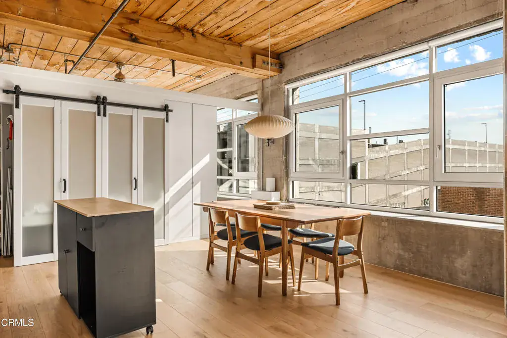A rare south-facing loft in the heart of the Arts District, this exceptional residence–one of only five in the building–is defined by an expansive wall of double-paned windows that flood the space with natural light throughout the day. This single-level loft offers a highly desirable layout featuring two spacious bathrooms, each with an oversized soaking tub, thoughtfully positioned on opposite ends for privacy and comfort. Industrial elegance meets modern luxury with soaring ceilings, exposed wood beams and posts, concrete windowsills, exposed piping, and recently updated wood floors. Designer Herman Miller Nelson lighting adds a refined architectural touch. Abundant storage enhances everyday livability, including a wall of wardrobe cabinets and multiple newly added storage areas, such as a pantry, flexible space for a guest bed, and a recently expanded in-unit laundry closet. The gallery-style kitchen features newer appliances, while gated garage parking and 24/7 on-site security provide convenience and peace of mind. Residents enjoy a resort-style rooftop complete with a heated pool and spa, BBQs, cabanas, fire pits, a fitness center, and breathtaking 360-degree downtown skyline views–an elevated extension of sophisticated urban living. Perfectly situated in the vibrant Arts District, this loft is just moments from acclaimed restaurants, coffee houses, museums, galleries, and the Arts District Park. With easy access to Metro, train stations, and major freeways, it offers the ideal balance of urban convenience and luxury lifestyle. Experience the pinnacle of downtown LA living in this sun-drenched, swanky loft.