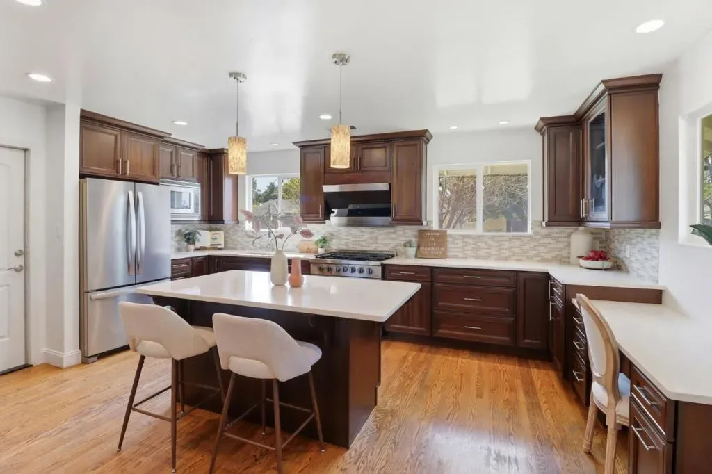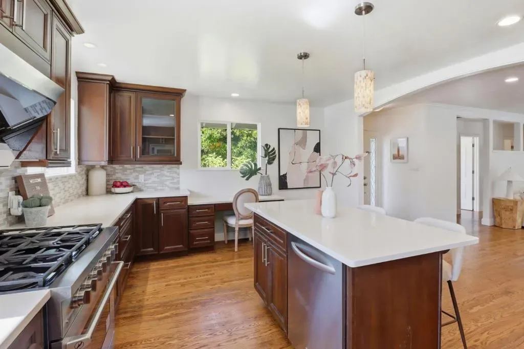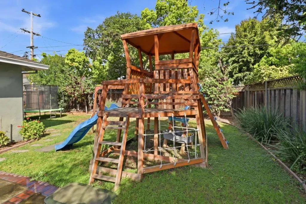 Fully remodeled home in the highly desirable community of Los Gatos, served by award-winning Los Gatos schools. Bright, open floor plan showcases a spacious and elegant chefs kitchen featuring cherry cabinetry, quartz countertops, high-end gas range with oven, stainless steel appliances, a large island, built-in desk, and soft-close cabinetries. Quality finishes throughout include hardwood floors, recessed lighting, crown molding, tray ceilings, dual-pane windows, and custom built-in cabinetry framing a beautiful stone gas fireplace. Equipped with central A/C, ceiling fans, and a Tesla EV charger for modern convenience. Step outside to a generously sized backyard designed for both relaxation and play, complete with a patio, storage shed, children playset, and trampoline perfect for outdoor enjoyment. Ideally located within walking distance to Live Oak Manor Park and just minutes from Vasona Lake County Park, top-rated schools, shopping, dining, and major commute routes.